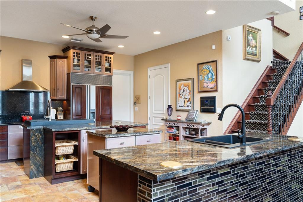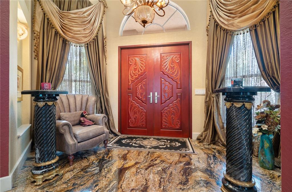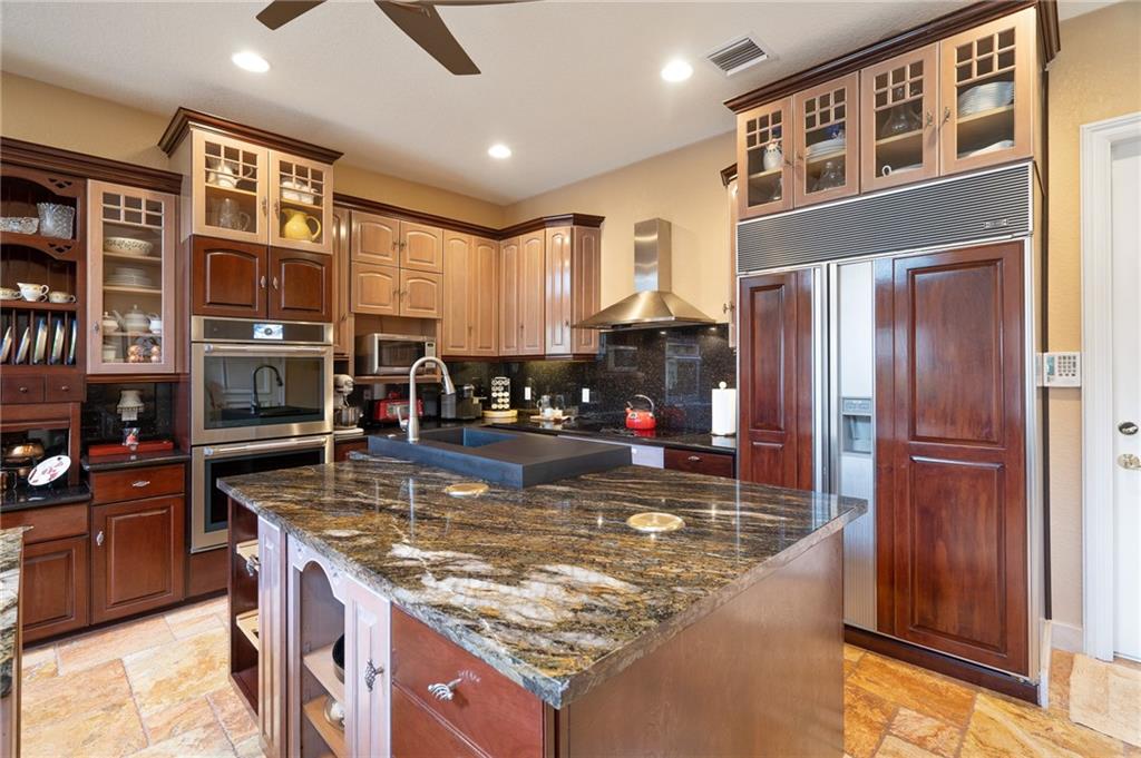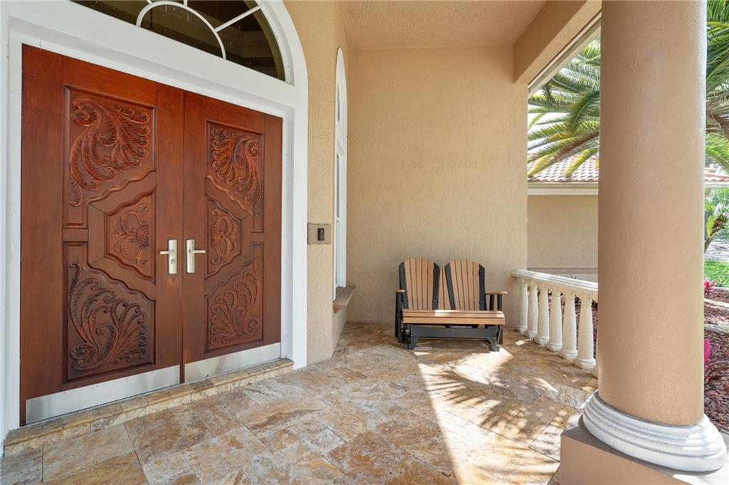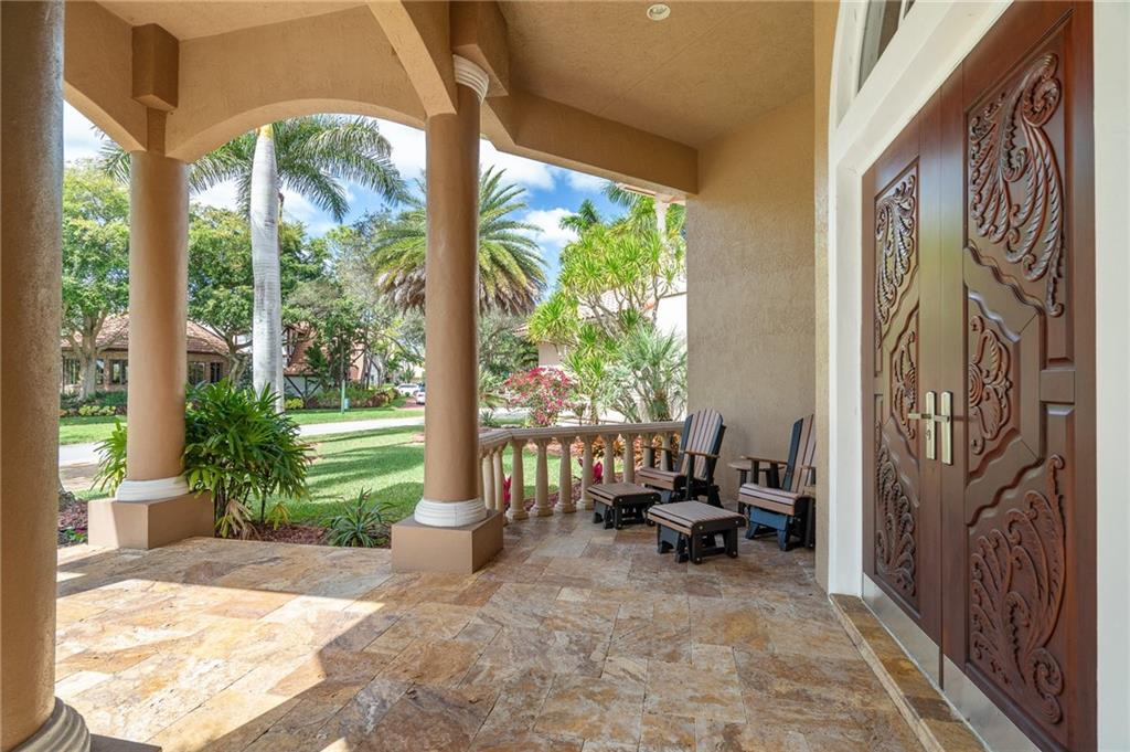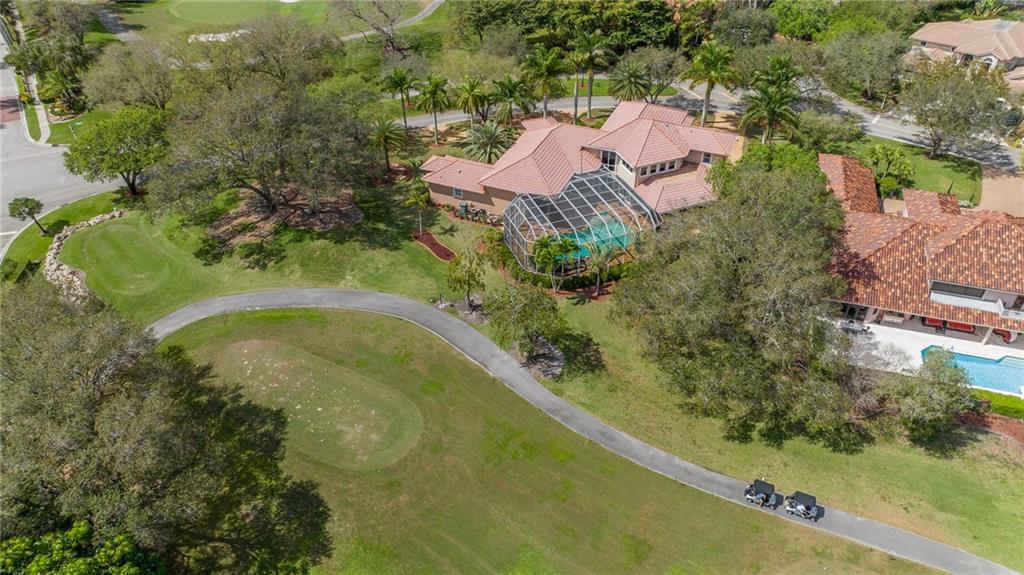 This ½ acre+ property sits on a prime lot, the front overlooking the 15th green and the back overlooking the 12th tee box and fairway of the Eagle Trace Golf Course. It only has neighbors on one side, offering a lot of privacy. The 15+ car driveways and rear patio have been redone in marble travertine. Walk through the beautiful carved wood hurricane-rated doors into a home that has been put together with love since being built as an entertainment paradise. Ceilings downstairs range from 22-30’ high. The unique master bath offers a soaking tub with a spillover feature. It was completely renovated 7 years ago with marble throughout. The kitchen boasts 2 sinks, JennAir double oven, Sub-Zero refrigerator, warming drawer, and beautiful granite countertops.
