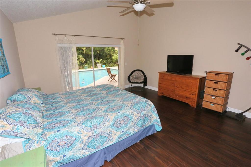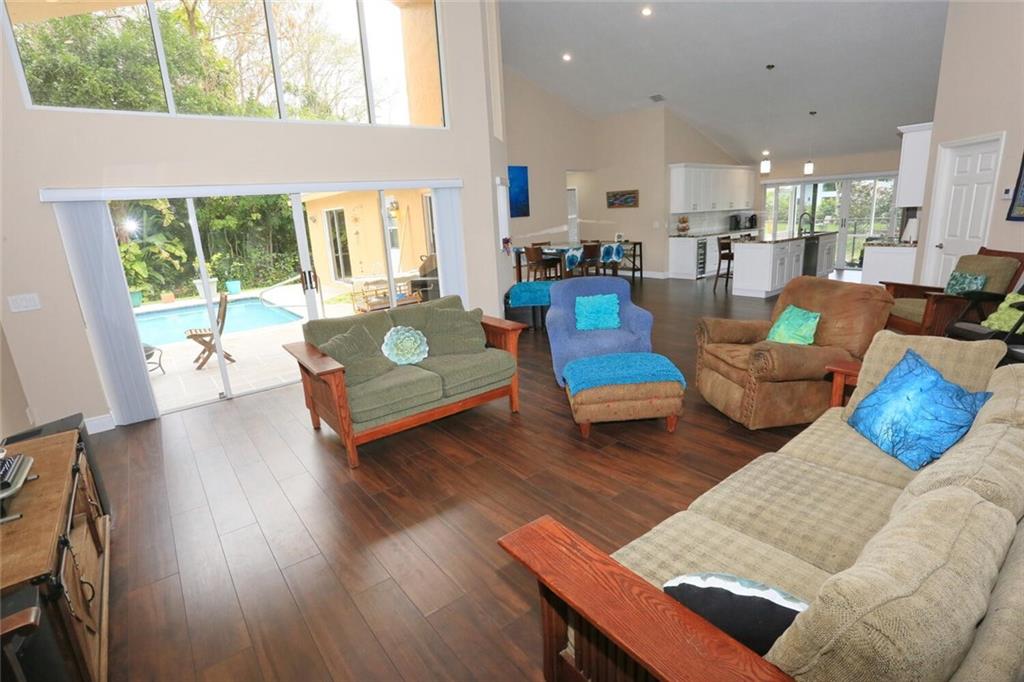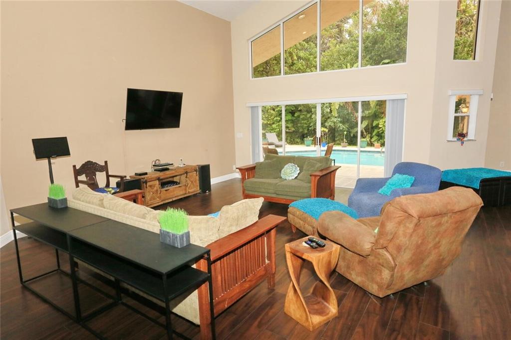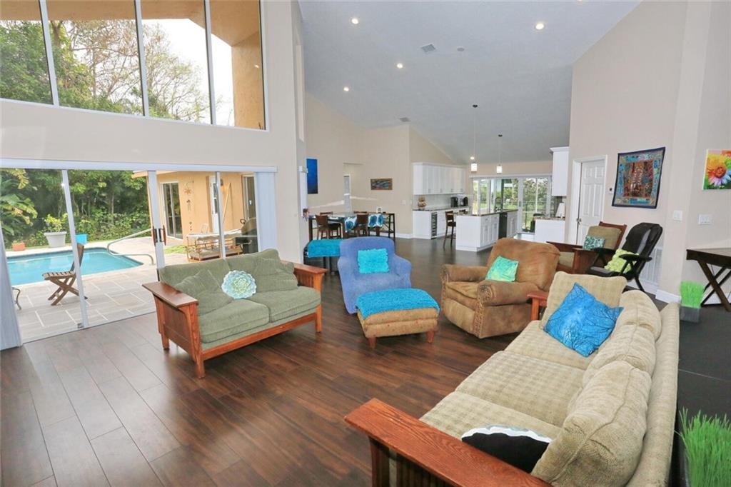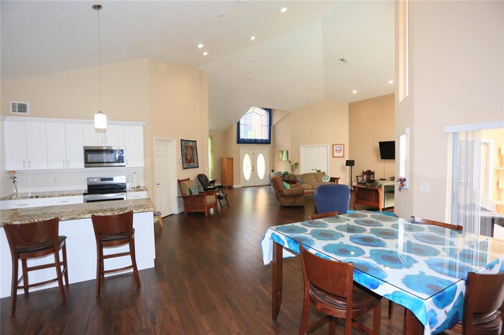 Looking for open concept living? A main room incorporates the living, dining, family room and kitchen with voluminous ceilings and magnificent acoustics. A half bath near front entry-convenient for guests. Fully modern kitchen with beautiful granite counters, stainless steel appliances and ample cabinets. Sliding glass doors from kitchen lead out to an enclosed patio overlooking a canal, with birds and fish. Sliding doors from living areas lead to patio with a fully-heated, in-ground pool. Large fenced yard with fruit bearing trees. Nature preserve behind home along canal. Spacious master en suite with 2 large closets and sliding doors to patio. Large shower and oversized tub in master. Split floor plan, poolside bath. New 5 ton AC 2020. Pool heater 2020. Knock down ceilings.