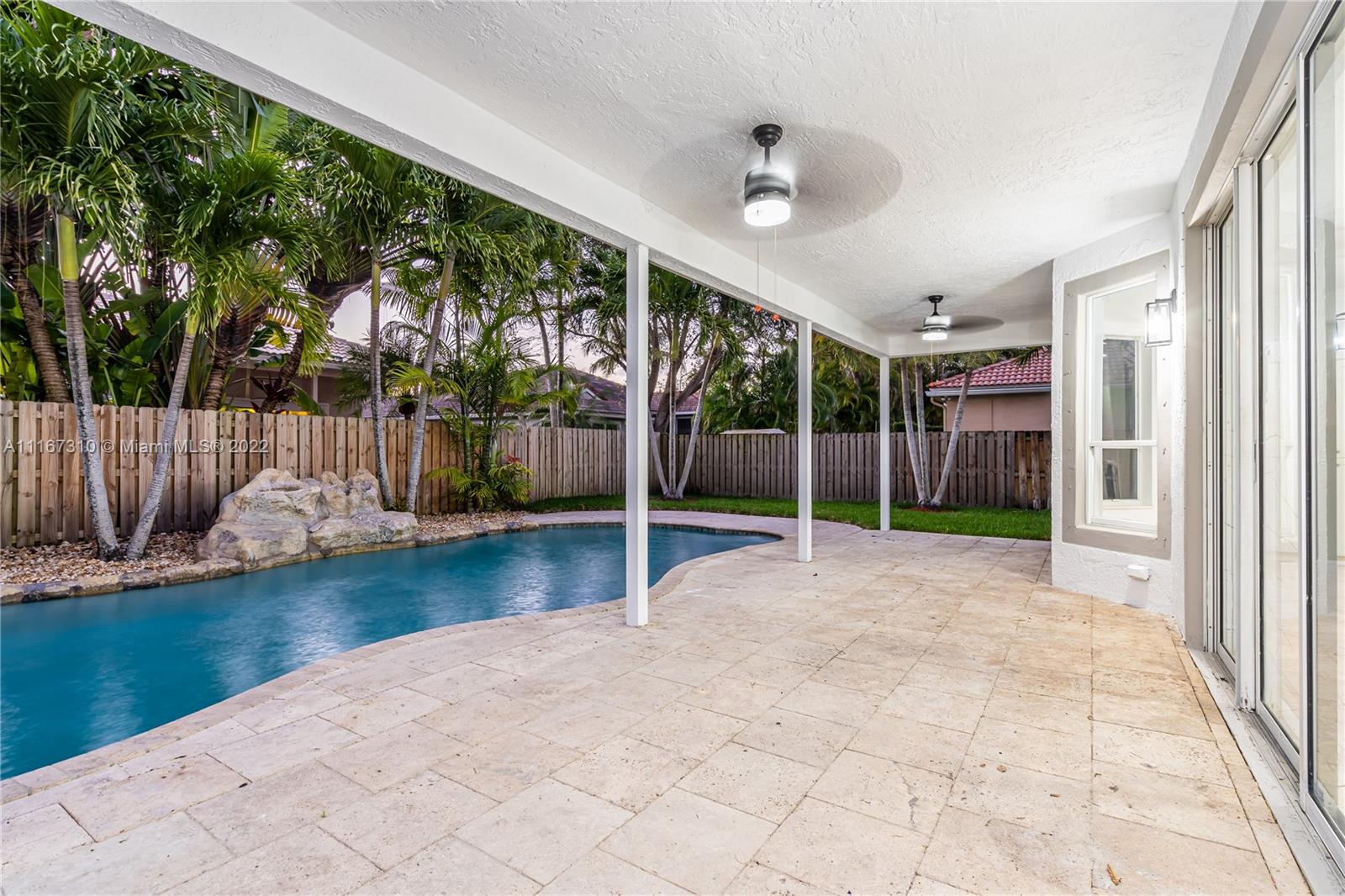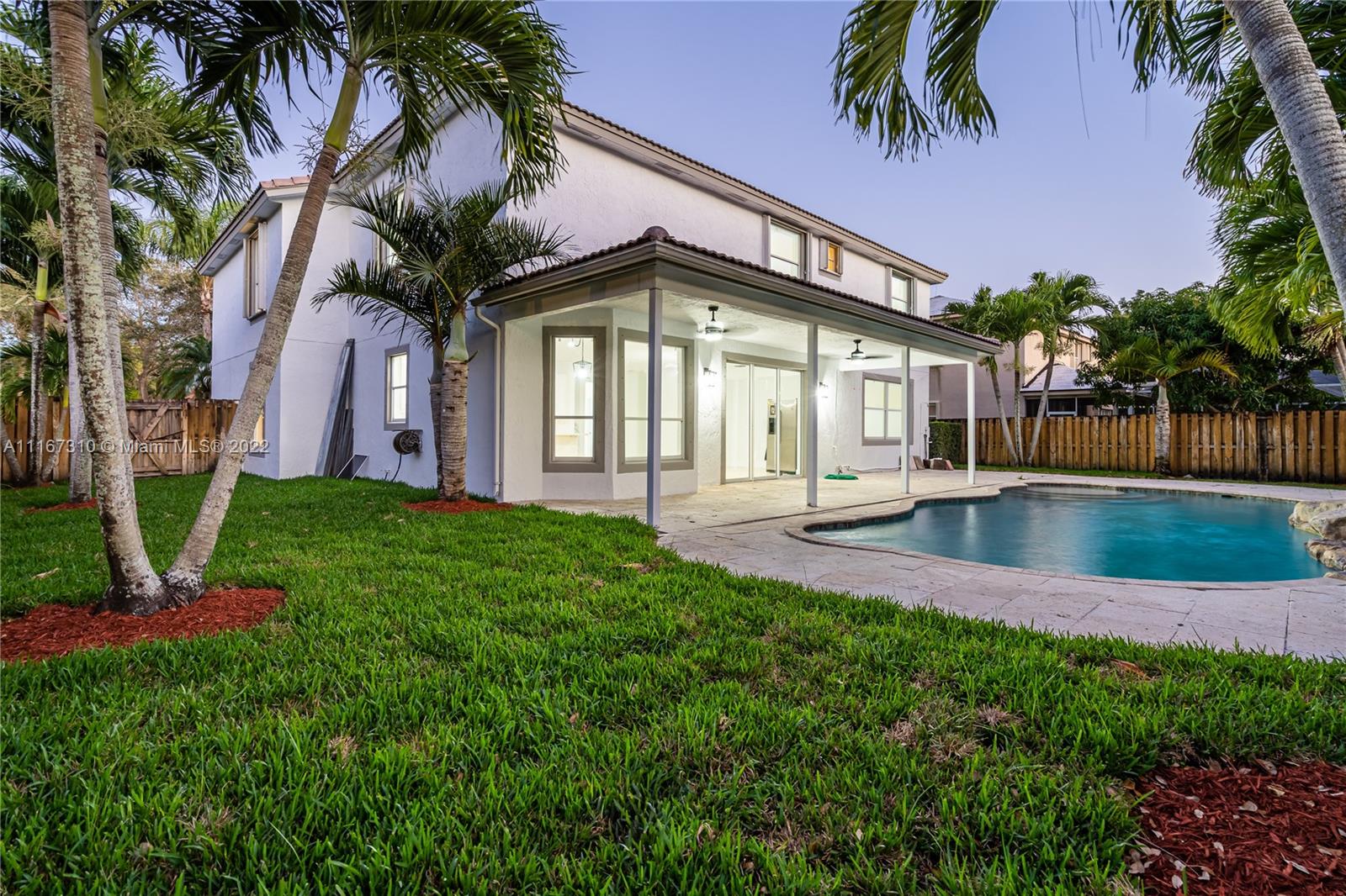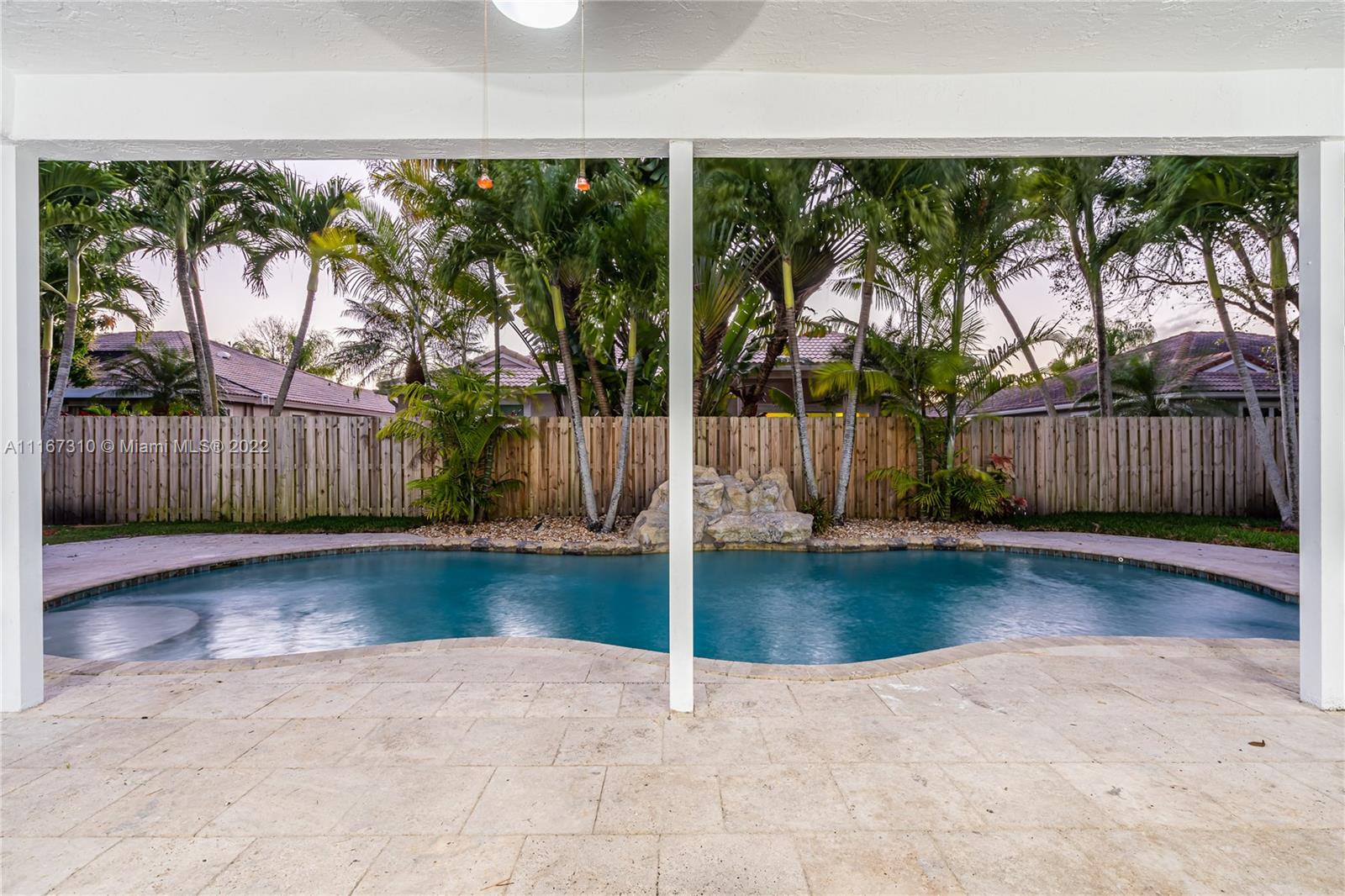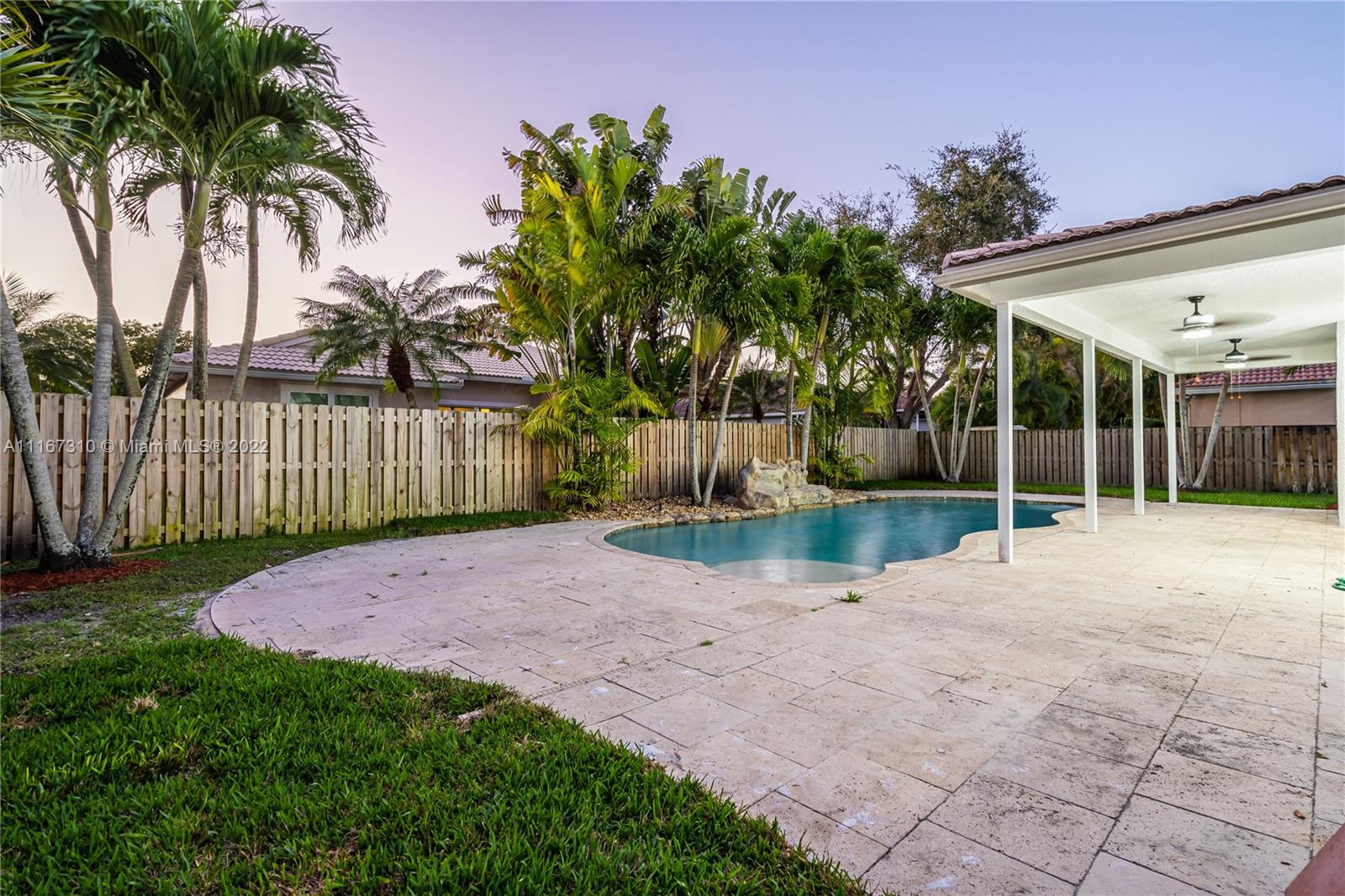 Beautiful updated home with a modern theme ready to move in featuring 4 bedrooms, 3 1/2 baths, and a 3 car garage on a quiet street in Pembroke Falls. This bright sunlit home features vaulted ceilings with an open living/dining area, a renovated kitchen with quartz countertops, and new SS appliances. Brand new light fixtures, porcelain tile floors and updated bathrooms. Home features large master suite with his and her walk-in closets. Step outside to your own private oasis featuring a heated pool and beautiful palm trees. Located at Pembroke Falls, a gated community, with amenities such as: Club house, large heated pool, tennis courts, basketball courts, and a park. A+ school district. Close to shopping centers, restaurants and more.
