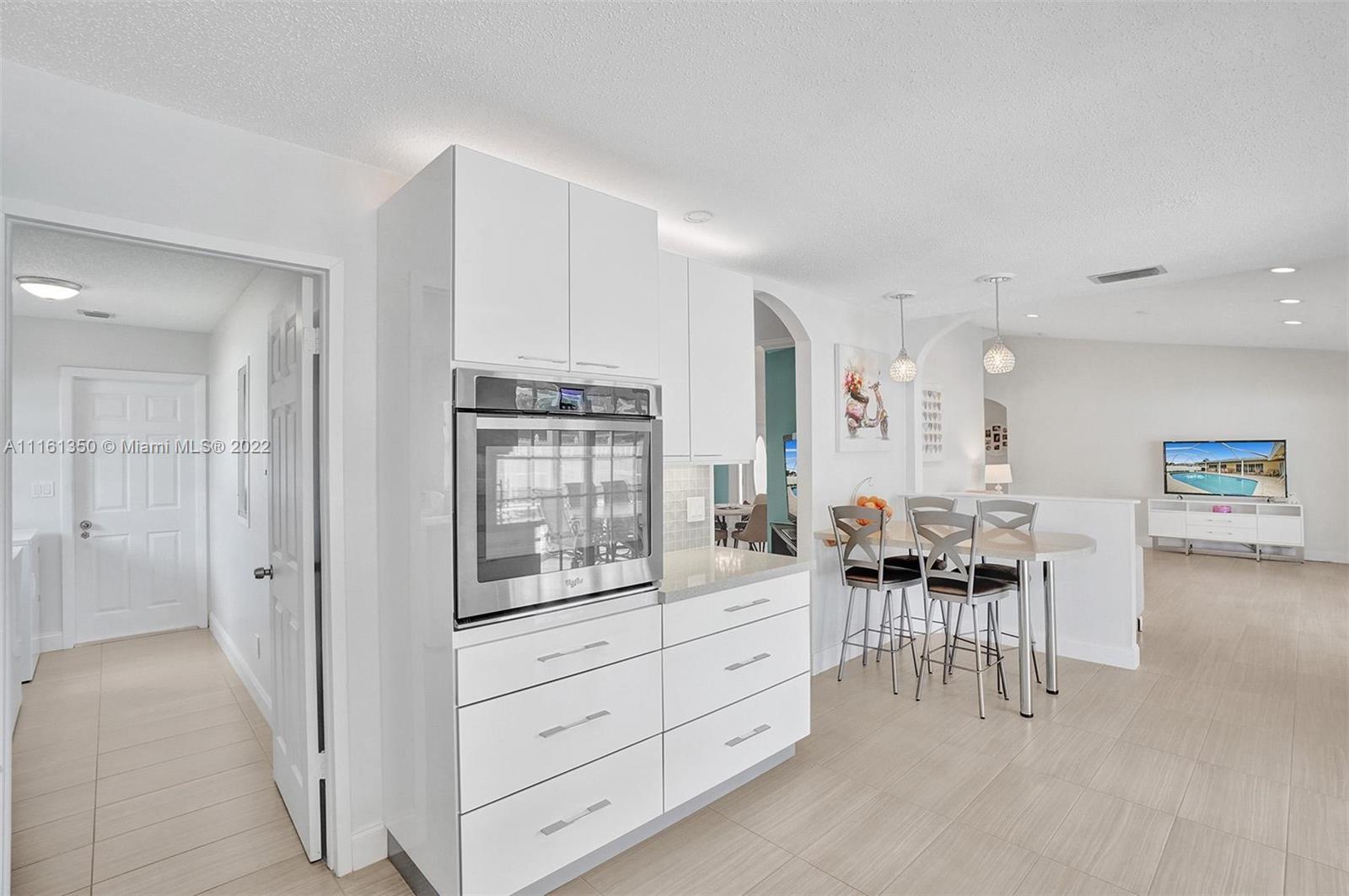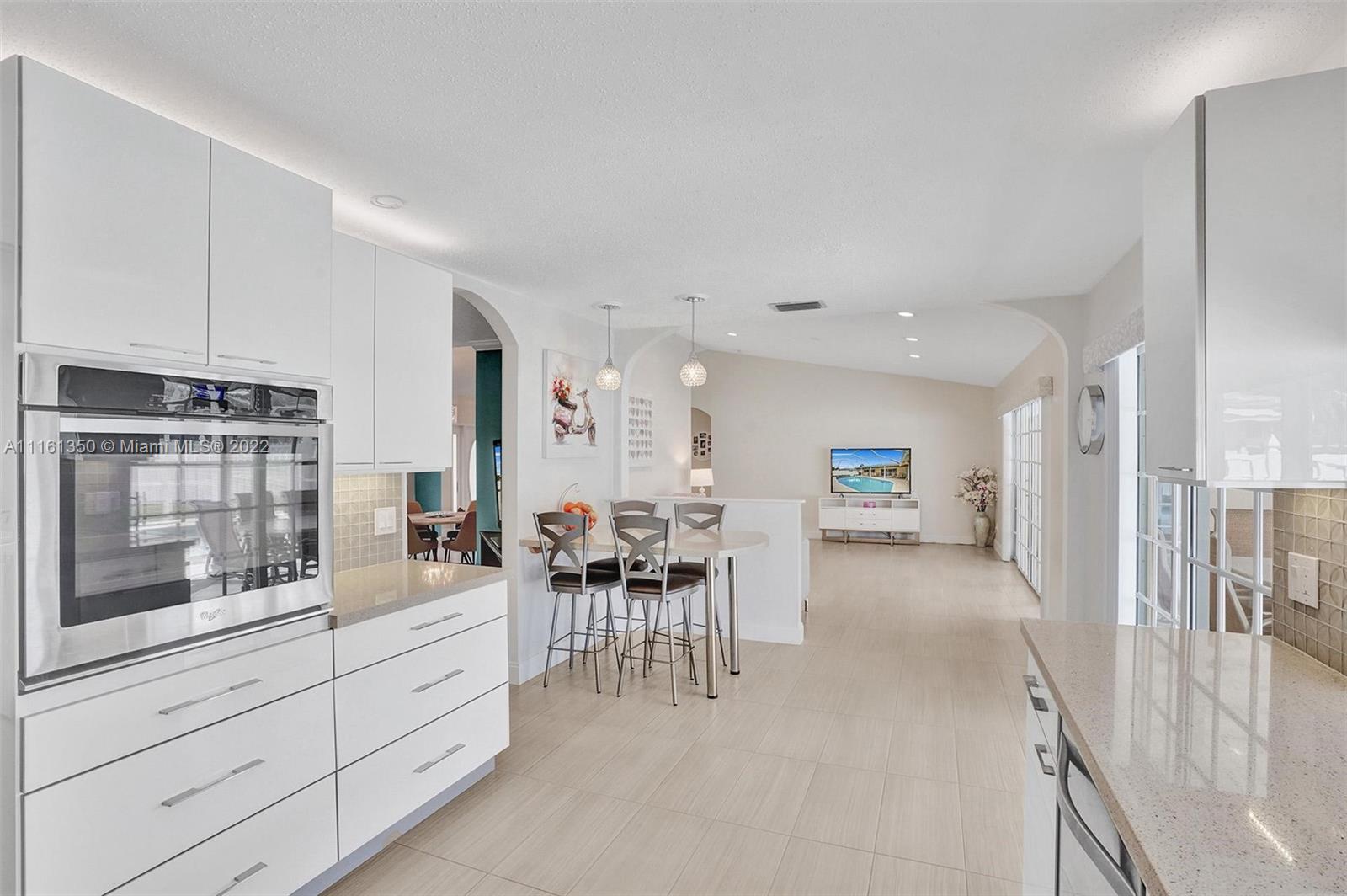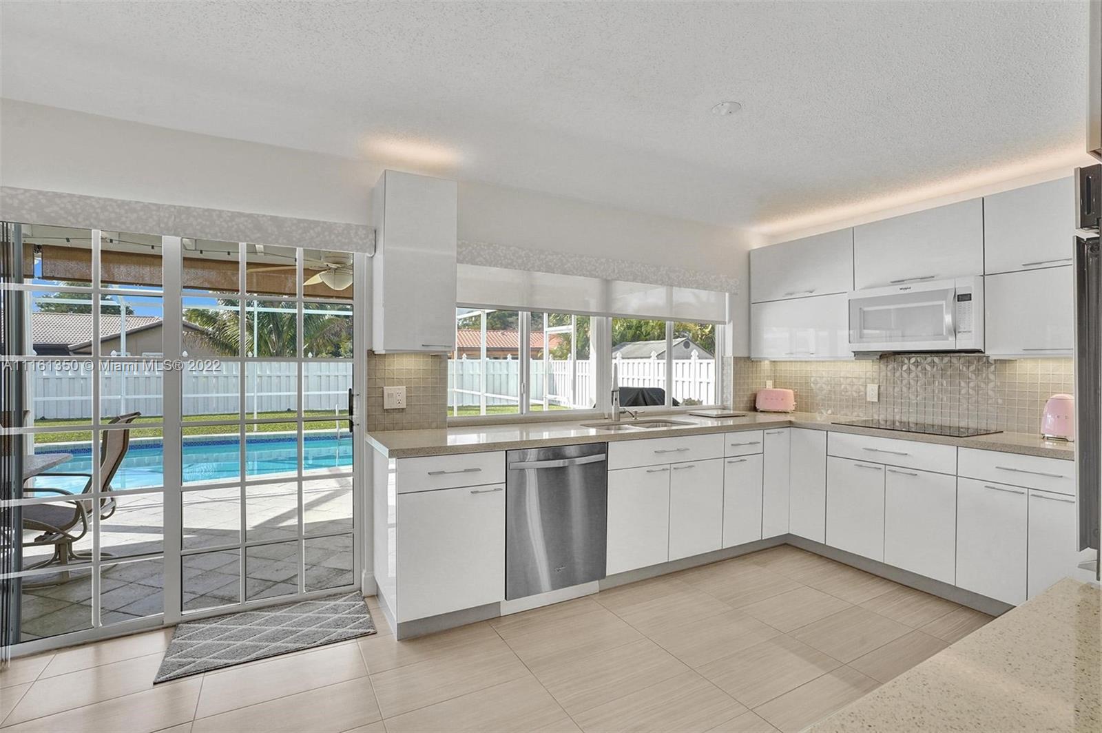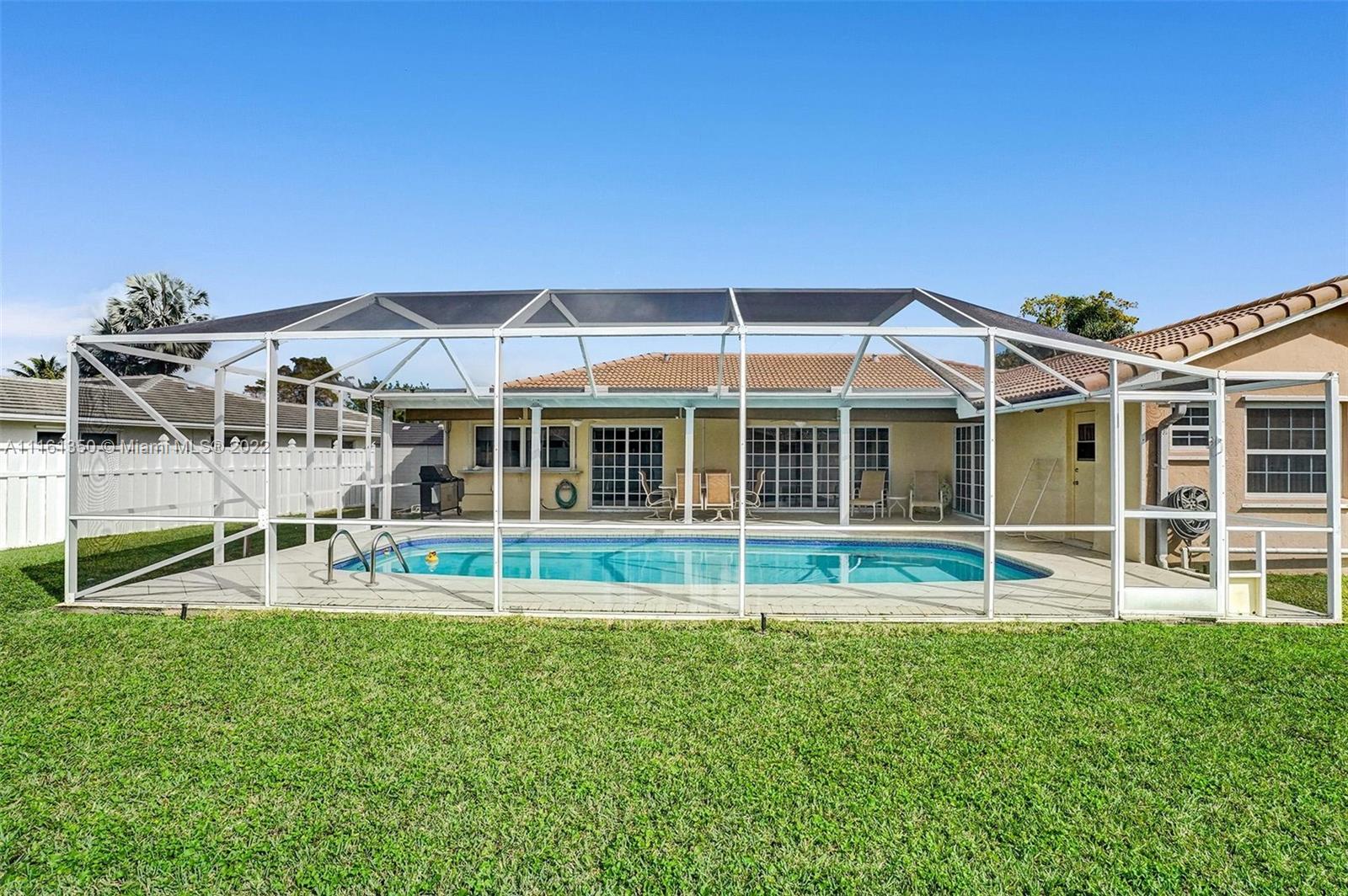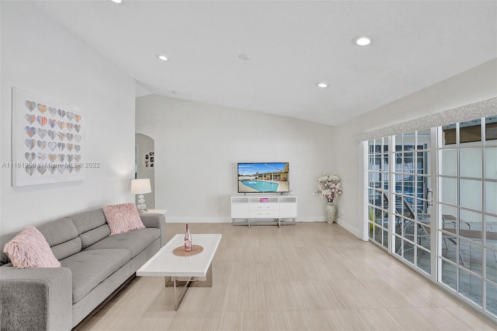 This home shows like a model! Immaculate 4-bedroom 2 bath, one story pool home in Coral Springs! The kitchen has been completely upgraded with custom built high gloss cabinetry, quartz countertops, stainless steel appliances, breakfast bar, touchless faucet and LED lighting above and below the cabinets. The spacious living room offers gorgeous views of the covered patio and pool! New porcelain tile throughout the main living areas of the home. Both bathrooms have been completely upgraded. Large master suite with views of the pool. The backyard is fully fenced-in, with a huge grassy yard, large screen enclosure, travertine patio, oversized pool that was recently resurfaced with a new diamond brite and new decorative tile. This home is protected by security cameras.
