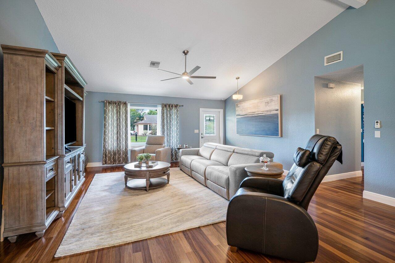 This turnkey property is as functional as it is form-fitting, with every corner commanding our admiration of both its ingenuity and attractiveness. The home has an open and spacious floor plan with beautiful hardwood floors and a well-designed kitchen featuring a bar, wine cooler, expansive counter space, soft close drawers, and cabinets with pullouts and organizers. The lush, tropical backyard will make every day feel like a vacation in your personal oasis. Featuring a saltwater pool, travertine tile deck, and a spa tub situated under a pergola with a Sunbrella sunshade system. In addition, the home has a brand-new roof, impact doors and windows, and a generator hookup. This property sits in a quiet community with amenities such as tennis courts, pickle ball, and a private fishing dock.