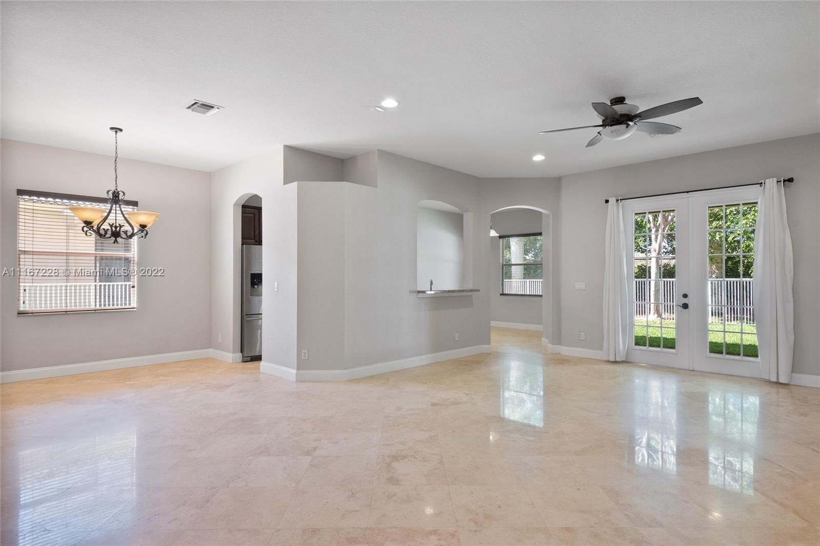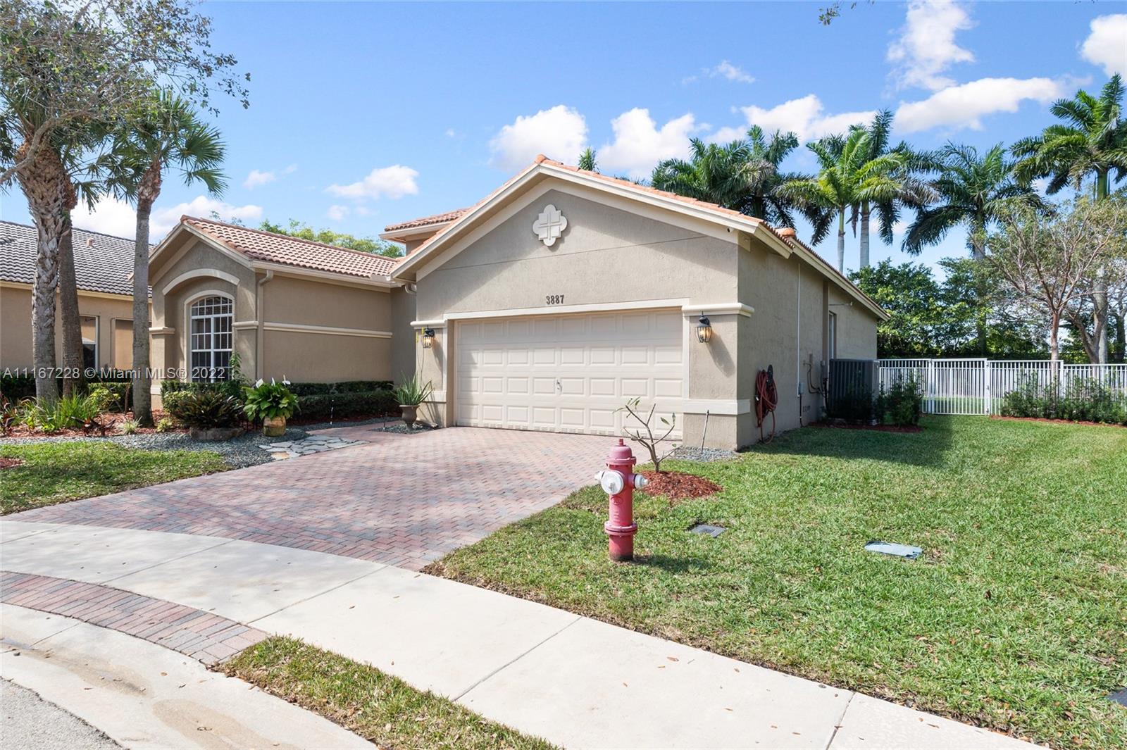 This beautiful home is situated on a private, oversized lot on a cul-de-sac with no neighbors behind and features 3 bedrooms (split floorplan), 2 bathrooms, a 2-car garage, foyer, formal living and dining, travertine & wood flooring, high ceilings, kitchen w/ 42-inch wood cabinetry, stainless-steel appliances, granite countertops & backsplash, and breakfast nook. The master suite features a walk-in closet & master bath w/ Roman tub & separate shower. Additional features include a new HVAC unit (04/2021), laundry room w/ tub, hurricane shutters, fully fenced yard w/ room for a pool, top A-Rated public schools and Resort Style amenities. HOA Fee of $260 monthly includes basic cable, internet, guard-gated entrance, clubhouse, fitness center, pools, playground, basketball & volleyball court.