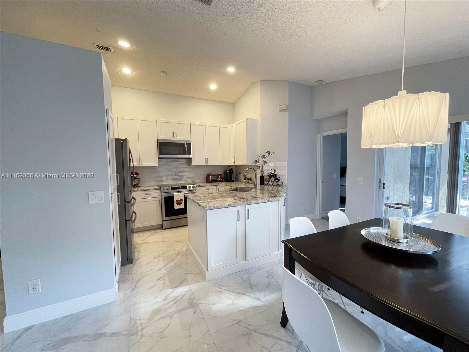 Charming 3/2 Family home in Weston. Peaceful location with no neighbors behind! New 48'x48" white porcelain tiles, Vaulted ceiling in the Family-Living Room, Dining Room and Kitchen. Completely remodeled kitchen with granite countertops, Stainless Steel appliances and lots of storage. Private shaded backyard with L-shape screened patio! Walking Distance from Savanna's Amazing Clubhouse with 3 Pools, Water Park, Mini Golf, Playground, Soccer field, Basketball Court and Hockey Rink. An opportunity to live in a resort style community with Low HOA fees. Great location and A+ schools.