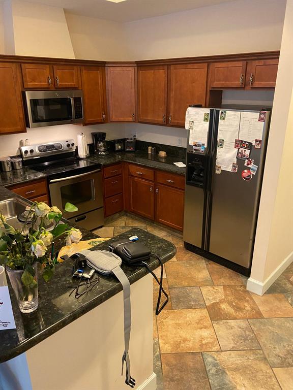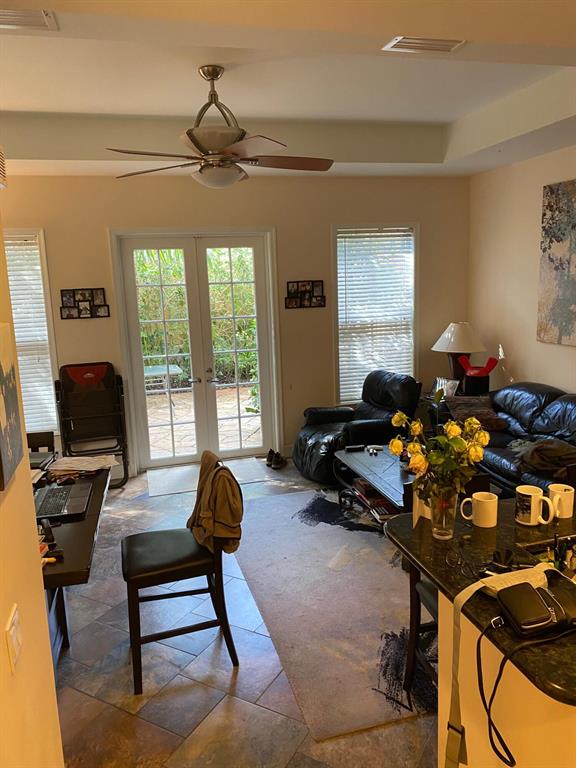 Three bedroom unit with large two car garage entry to kitchen. Finished private patio with mature shrubbery. Lightly used and well kept since new. Ten foot ceilings throughout. Partially furnished. Appliances and ceramic tile updated. granite countertops throughout. Large master bath and walk in closet.