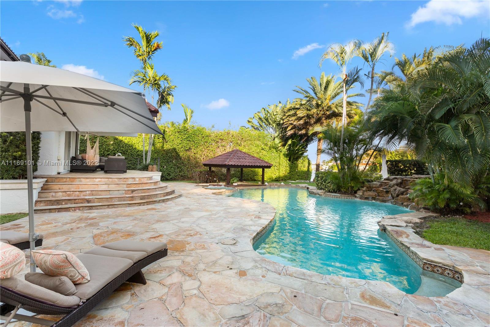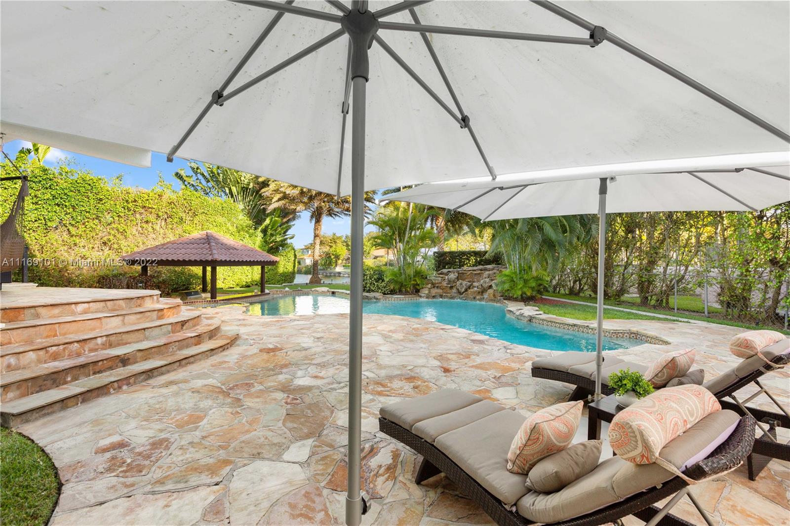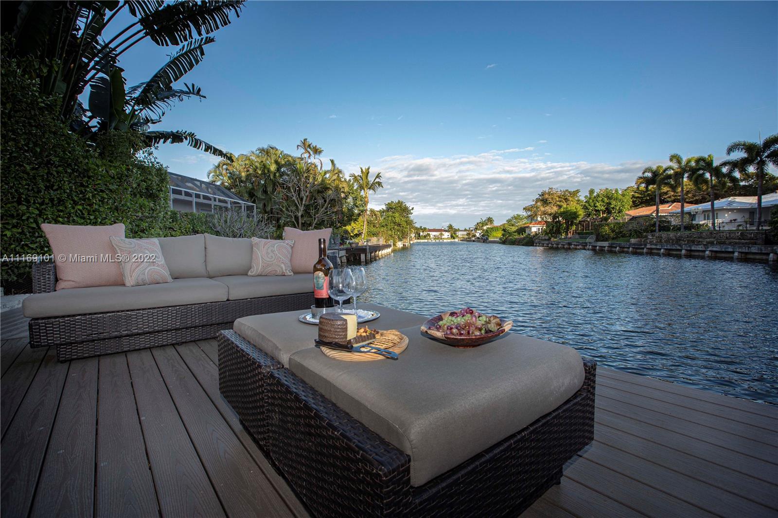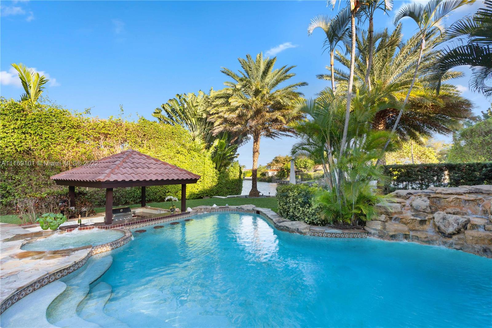Spectacular 5-bed, 4-bath waterfront home in Gables By the Sea. This is an oasis of comfort with amazing pool, patio & summer kitchen. While there is no access to the bay, the serenity & beauty of the waterway are amazing especially while engorging the evening on the dock. This home is full of surprises, elevated to over 12-ft, it has a finished basement w/ a large traditional Spanish bar & dining room, that are perfect to catch a game or simply gather w/ friends while enjoying a glass from its temperature and humidity controlled 600-bottle wine cellar. 17k + sq ft lot, circular driveway, 2 car garage & Gym. This is a fabulous place to work at home or to come home to, after work. Priced to sell, the current owners enjoyed this home for 32 years and are ready to pass it on to a new family.