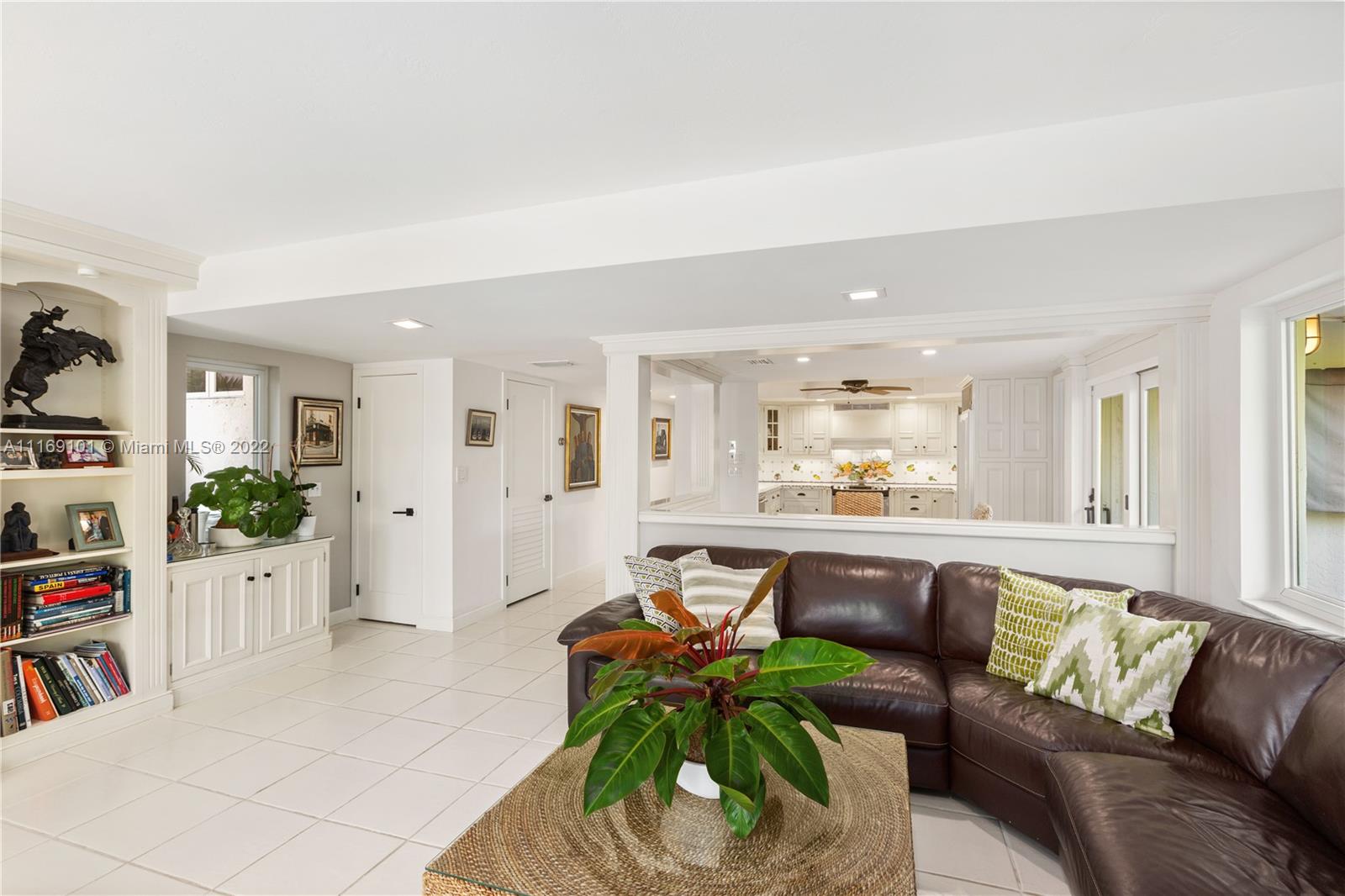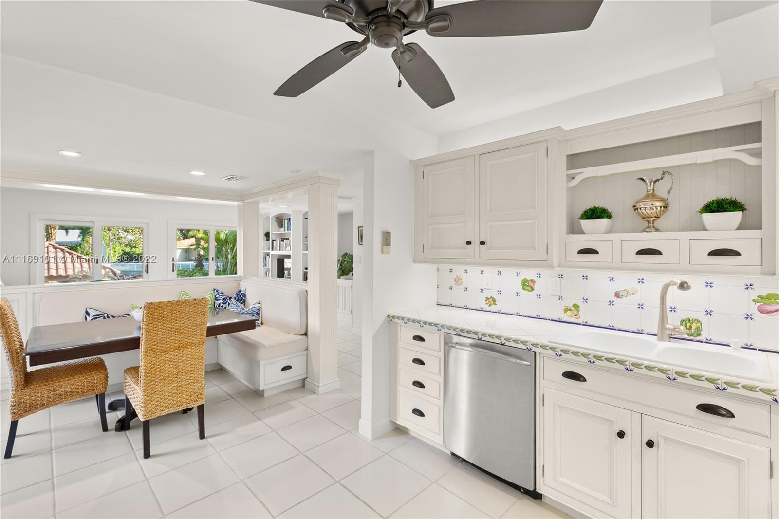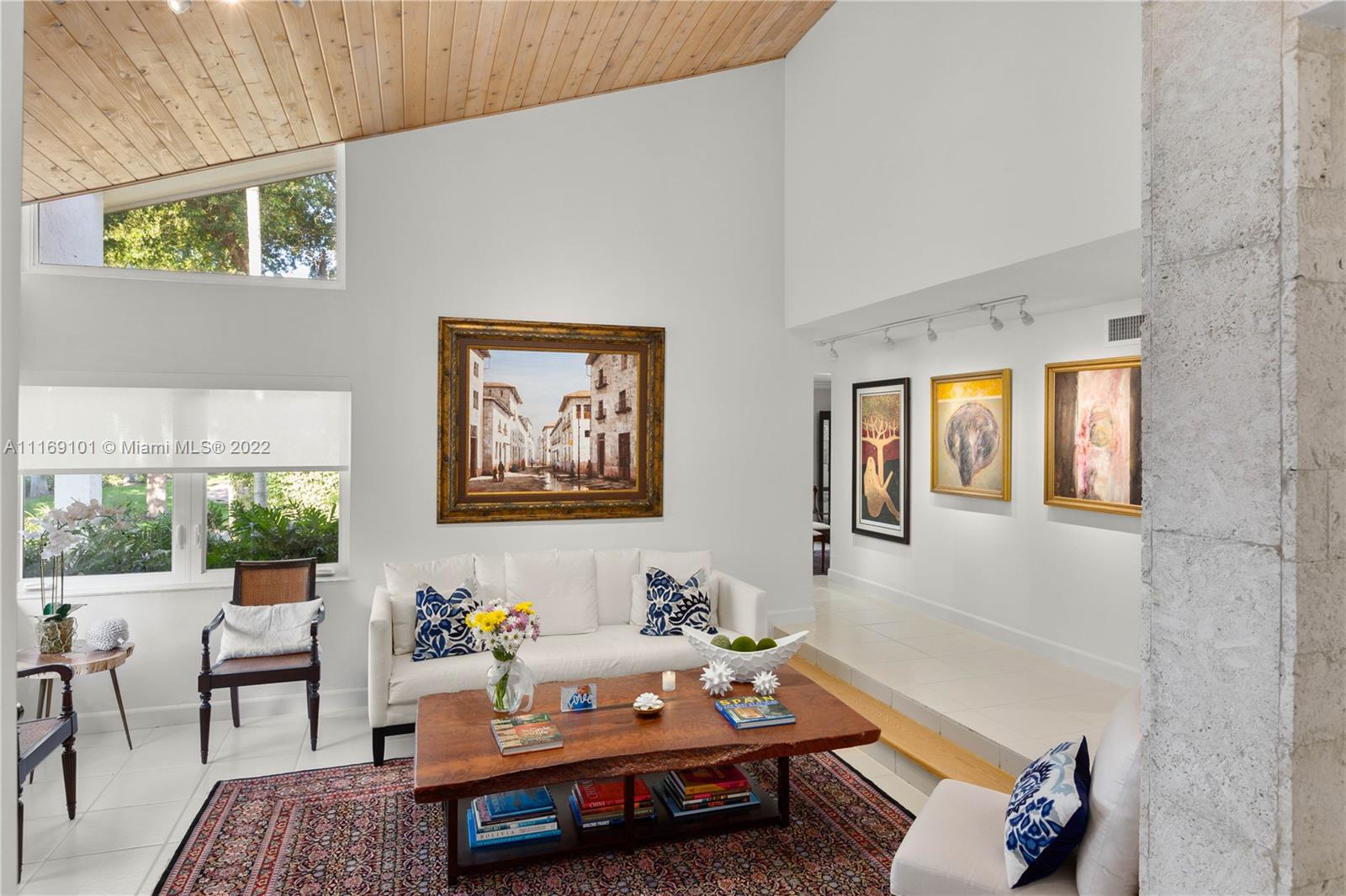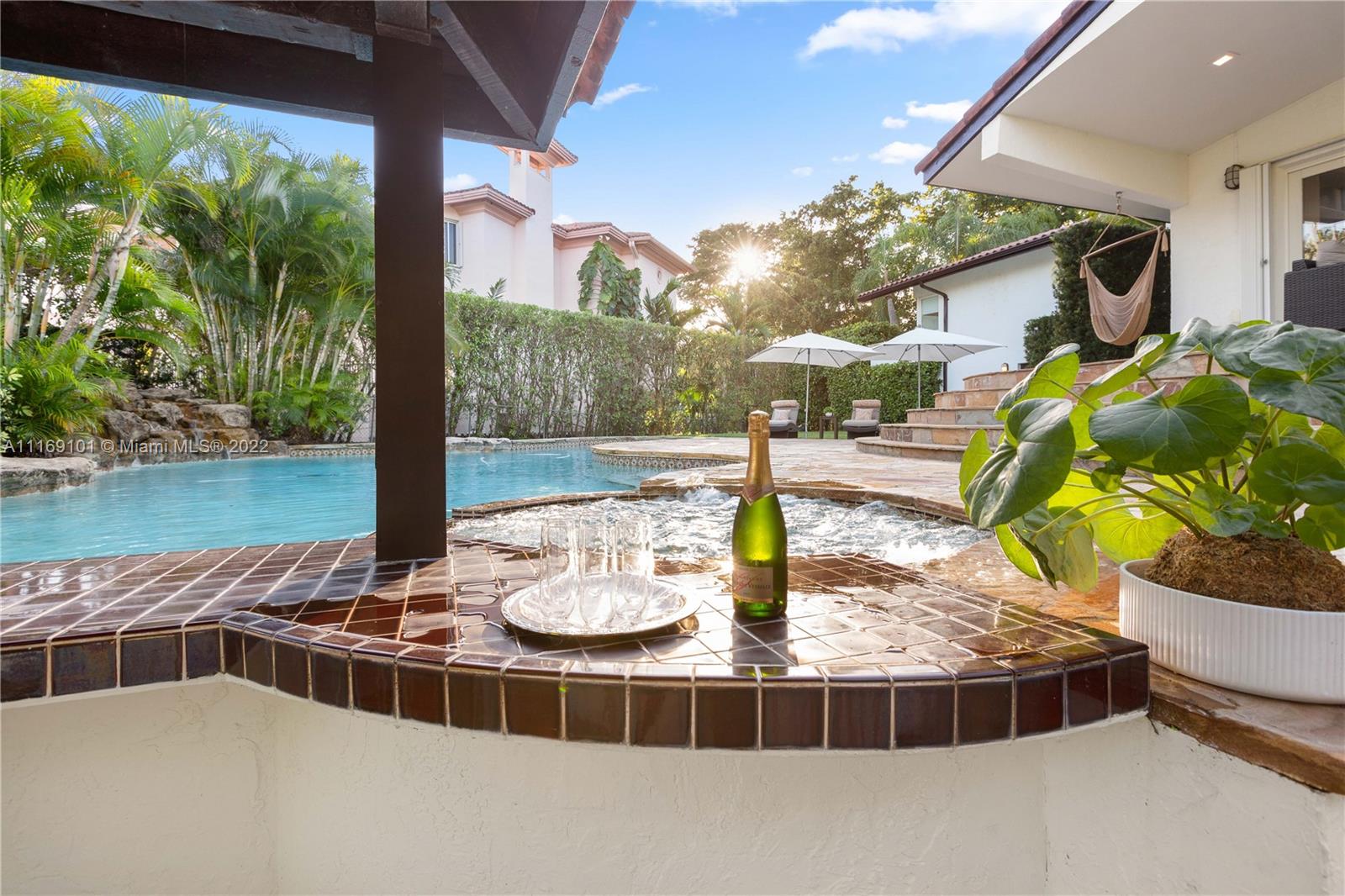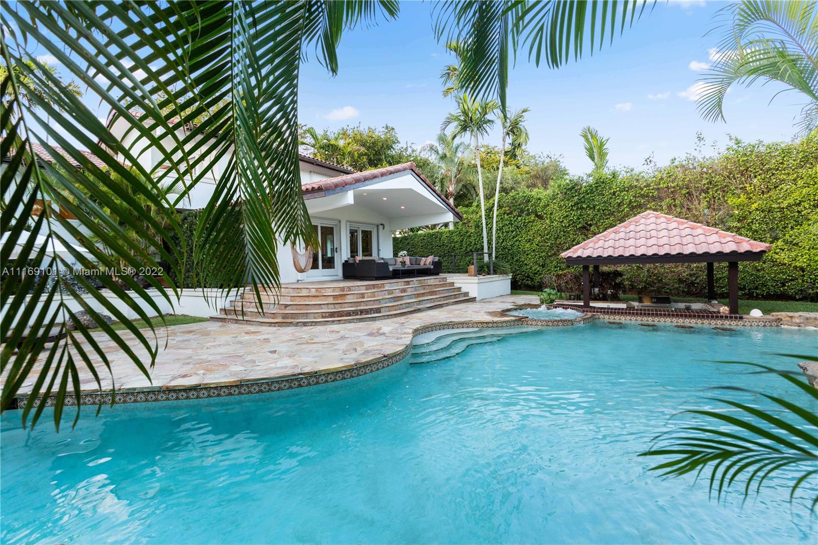 Spectacular 5-bed, 4-bath waterfront home in Gables By the Sea. This is an oasis of comfort with amazing pool, patio & summer kitchen. While there is no access to the bay, the serenity & beauty of the waterway are amazing especially while engorging the evening on the dock. This home is full of surprises, elevated to over 12-ft, it has a finished basement w/ a large traditional Spanish bar & dining room, that are perfect to catch a game or simply gather w/ friends while enjoying a glass from its temperature and humidity controlled 600-bottle wine cellar. 17k + sq ft lot, circular driveway, 2 car garage & Gym. This is a fabulous place to work at home or to come home to, after work. Priced to sell, the current owners enjoyed this home for 32 years and are ready to pass it on to a new family.