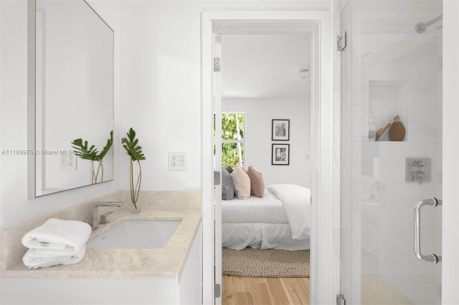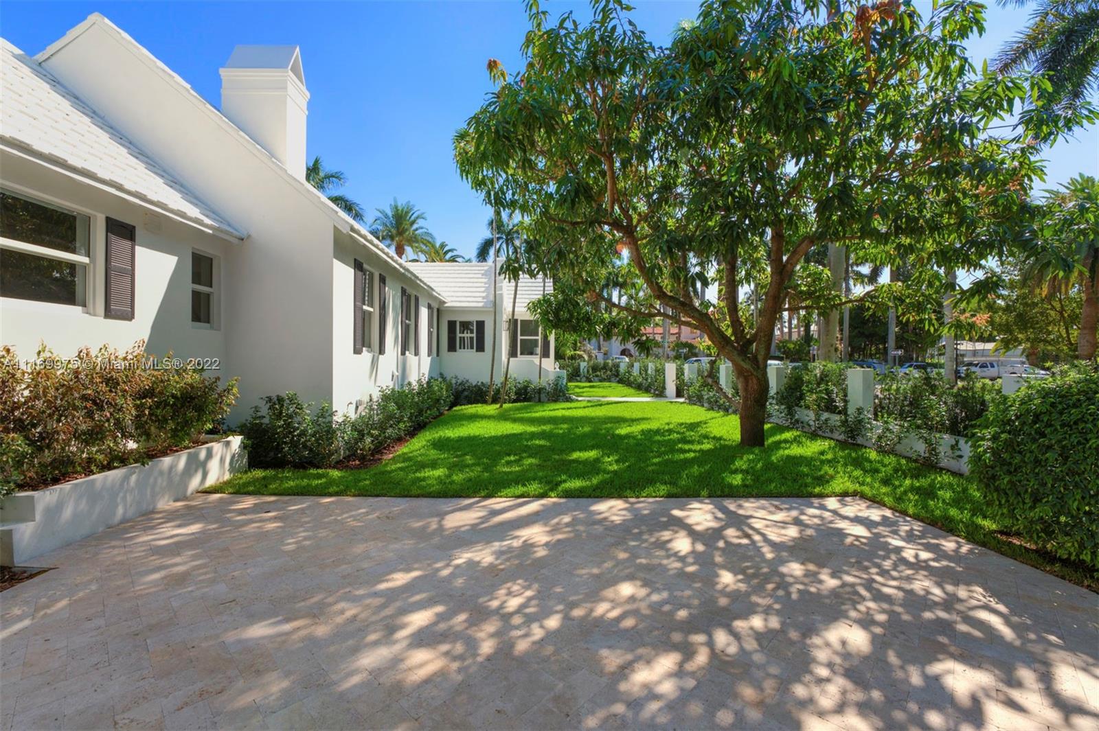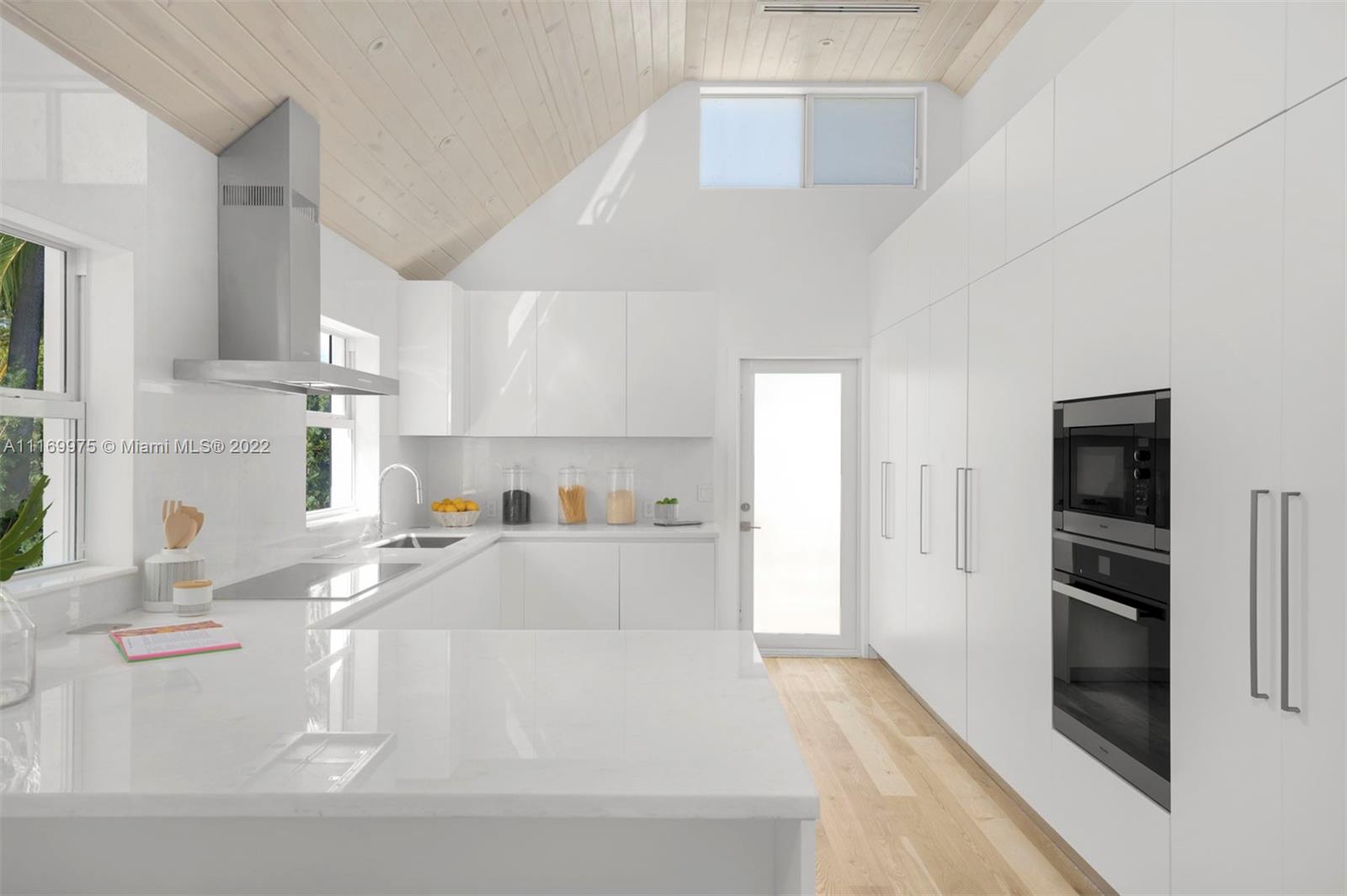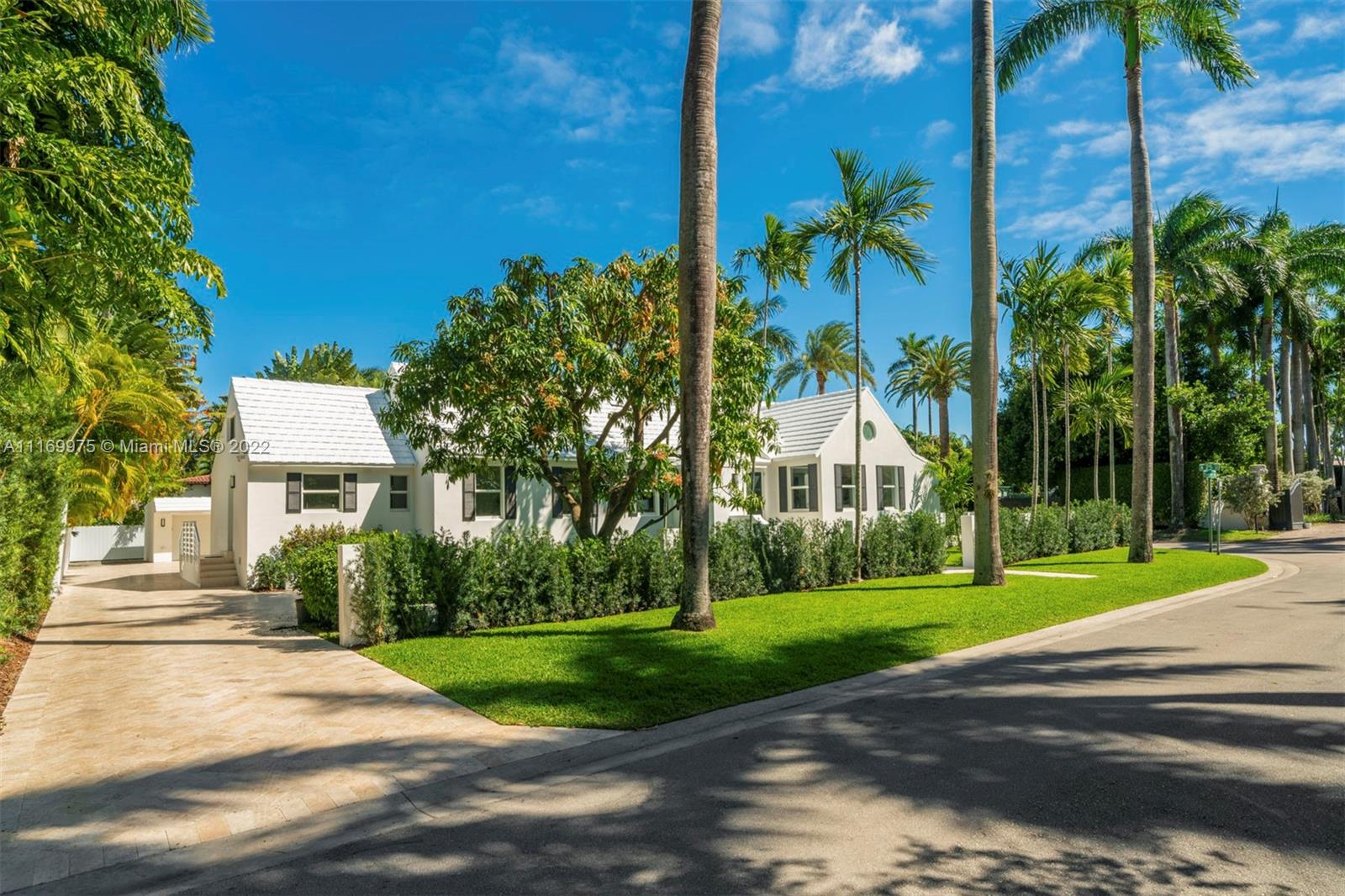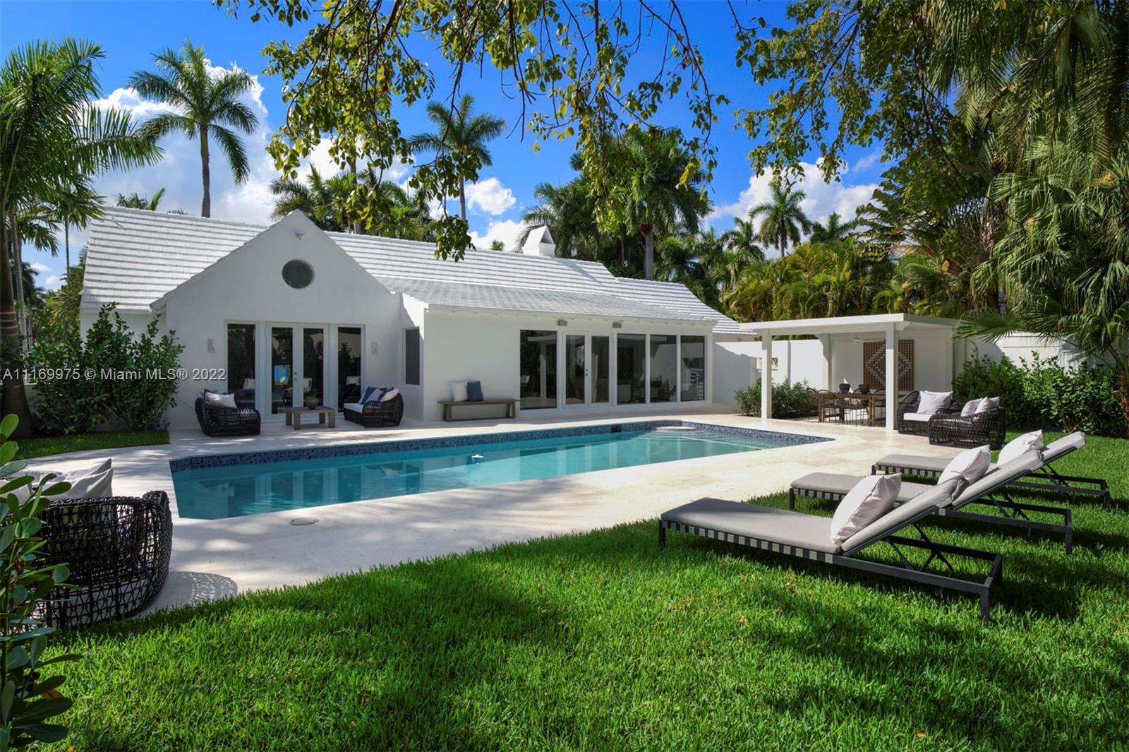 Enjoy a life of coastal elegance in this Sunset Island II home, fully renovated in 2022. Turnkey 4BR/4.5BA on a coveted corner lot across from a serene, palm tree-lined park. Soaring ceilings & views of the lush backyard with oversized sparkling pool greet you as you step inside. An abundance of natural light pours in from glass walls of hurricane impact windows & doors, illuminating the great room w/ marble clad fireplace & exposed wood beams throughout open living & dining room. Custom designed eat-in kitchen w/ marble countertops, Miele & Subzero appliances. Primary suite boasts spa like bathroom w/ large walk-in closet, dual headed shower, double sinks & vanity area & French Doors leading to private pool & backyard.