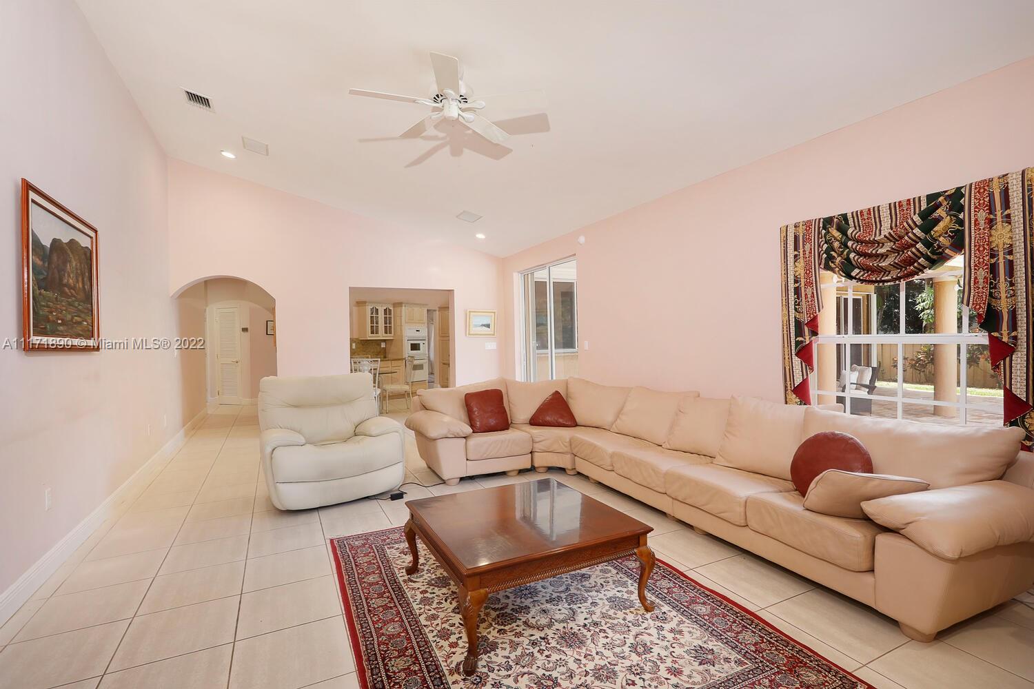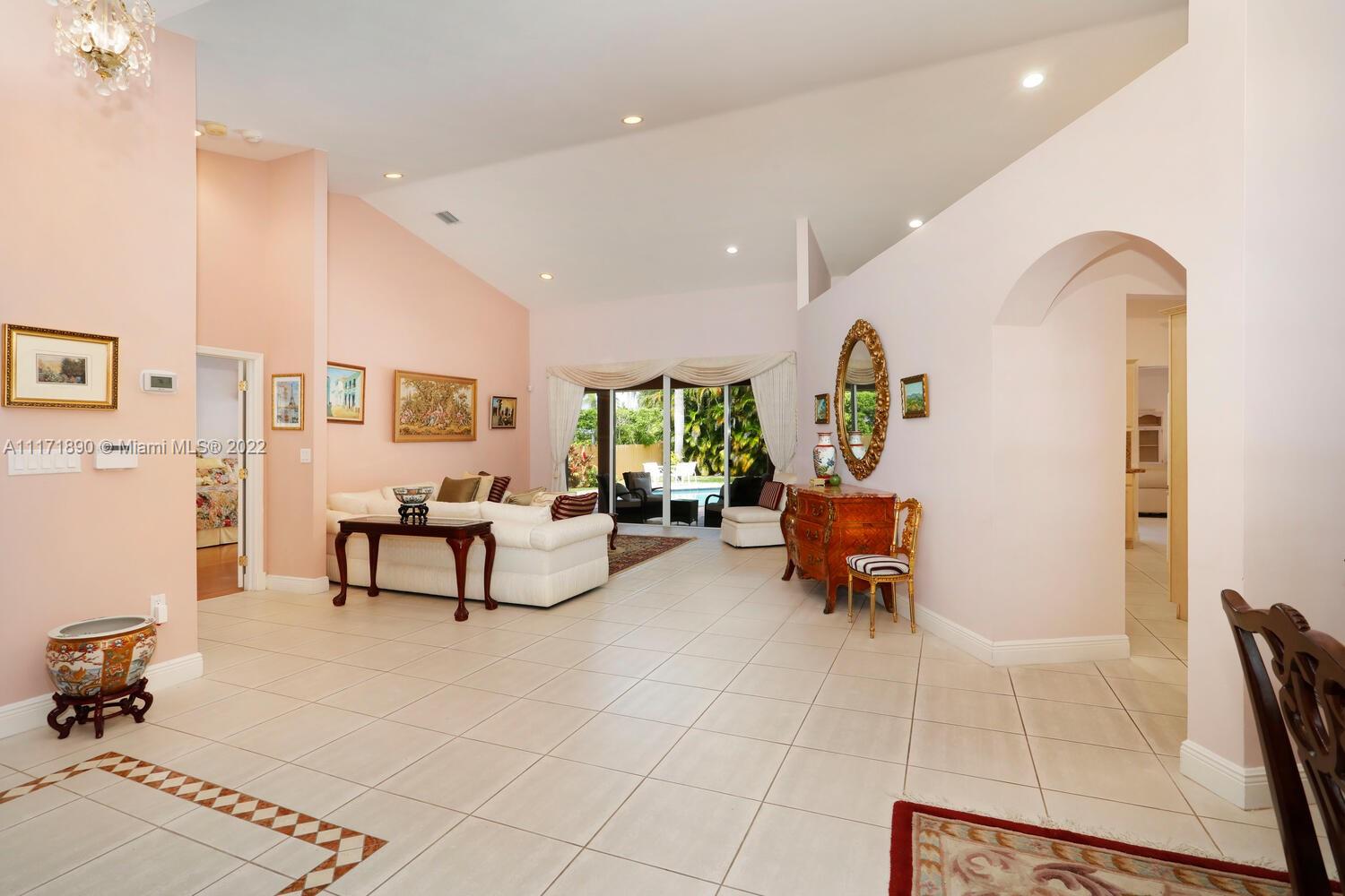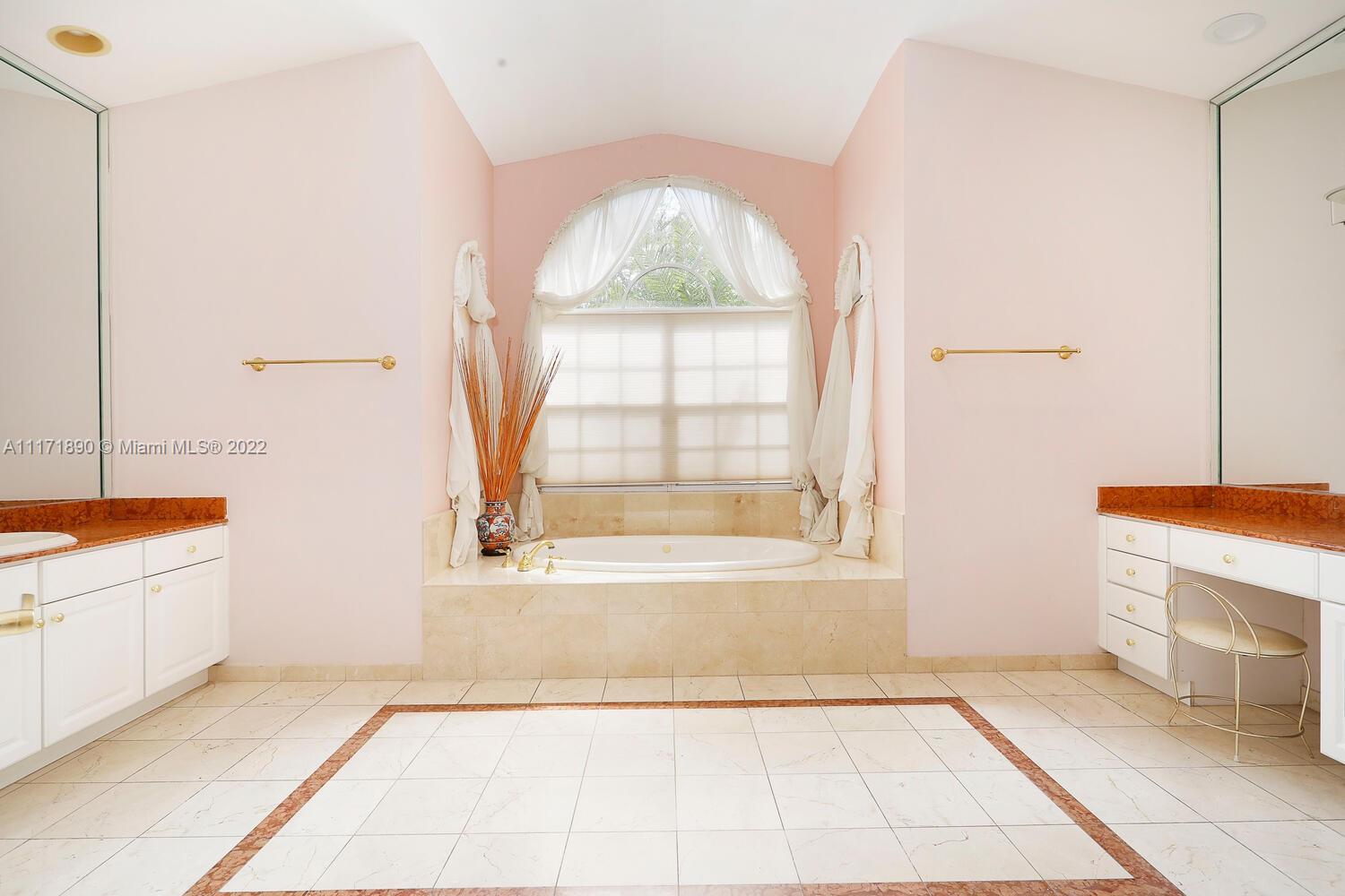 Spectacular 4 Bedroom/ 3.5 Bathroom Mediterranean residence situated in the heart of Pinecrest. property sits on a 19,511 sq.ft lot with a spacious front and backyard with wonderful landscaping throughout. The house boasts a master suite with hardwood floors, vaulted ceilings, two walk-in closets, jacuzzi bath, sunken shower, double vanity/ sinks with nice view of the pool. Other features included in the house are large living/ dining/ family room, island kitchen with granite countertops, breakfast area, built-in bar, 2 car garage, electric gate fence, fenced yard, brick patio pool deck, hurricane shutters and much more.