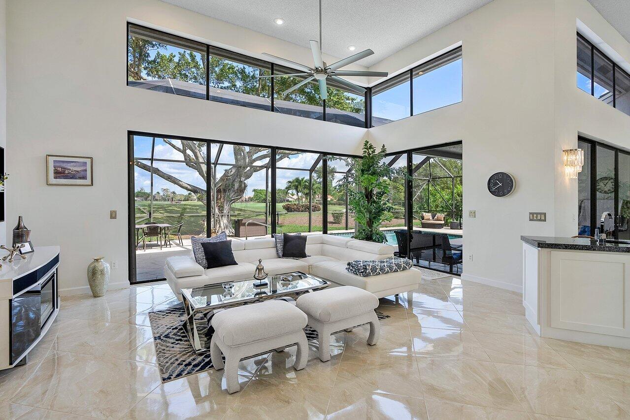 This rarely available, 3400 plus sqft stunning, light & bright renovated home located on a premium golf course lot overlooking two lakes in Stonebridge Country Club is like NO OTHER with 4 bedrooms, 3.5 Bathrooms and optimal design with no step down entry. The home has custom, kitchen with white Shaker cabinetry, luxury granite and backsplash, porcelain floors, and newer roof (2016), A/C (2021) and W/H (2021). Plus soaring ceilings throughout this one of a kind home. Designer lighting throughout. Fabulous master suite with two large walk-in closets. Split floor plan. New landscaping. Hurricane shutters. Spacious, 2 car + golf cart, garage. Many upgrades throughout. Enjoy your private Golf Course, Club room, State of the Art Gym, 6 tennis courses, Pickle Ball courts, restaurant and more.