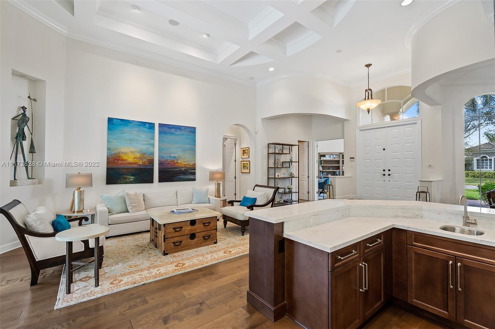 Tucked on Snowy Owl cul-de-sac street is this beautifully renovated home located in the prestigious Hawks Landing community. Boasting an open and bright triple-split floor plan with lots of natural light, featuring 4 large bedrooms, an office/den, and 3 1/2 bathrooms. Wood and marble flooring throughout, gorgeous remodeled kitchen, elegant bar area, updated master bath, all with a view of a tranquil, tropical paradise. Incredible pergola that opens/closes, heated pool, plus a shallow pool for the little ones, with attached spa. Hurricane protected, fenced-in backyard, and lush landscaping. This home has it all! 24 hour guarded gate, roving security, fantastic clubhouse, giant fitness center, resort-style pool, 7 tennis courts, basketball courts, tot lot playground, and pickleball!