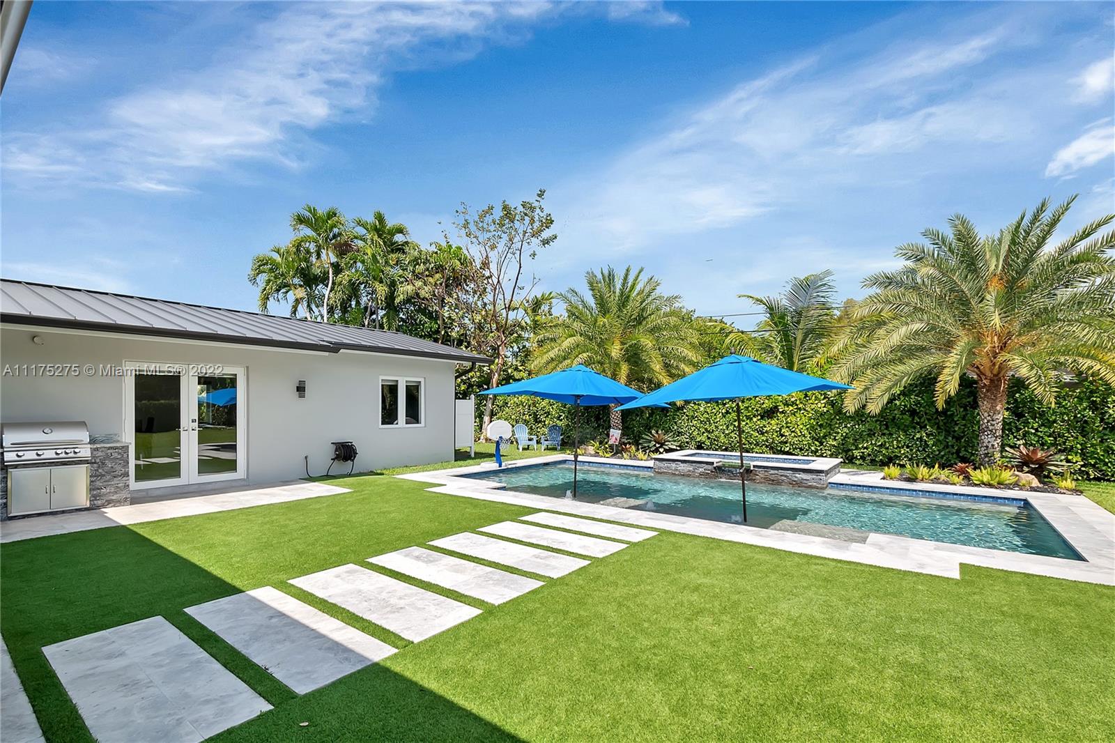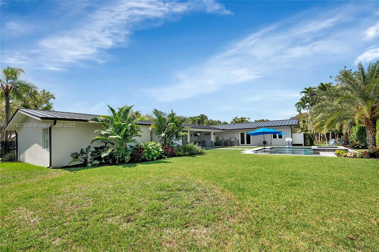 Spectacular and modern 4 bdrm, 4 bath home on a quiet, beautiful tree-lined street in the fantastic neighborhood of Pinecrest. No detail spared; this home has been meticulously renovated. Gorgeous kitchen features oversized island with seating, white cabinetry, glass backsplash, quartz counter tops and stainless-steel appliances including gas range and pantry with beverage station. Formal dining area. Wood plank-style tile flooring, recessed lighting, impact windows and doors and newer metal roof. Indoor laundry room. Expansive family room with wet bar opens out to a private resort-like backyard complete with pool and spa, summer kitchen and patio, surround sound inside & out, perfect for outdoor entertaining. Tropical landscaped yard with circular driveway and 2 car garage.