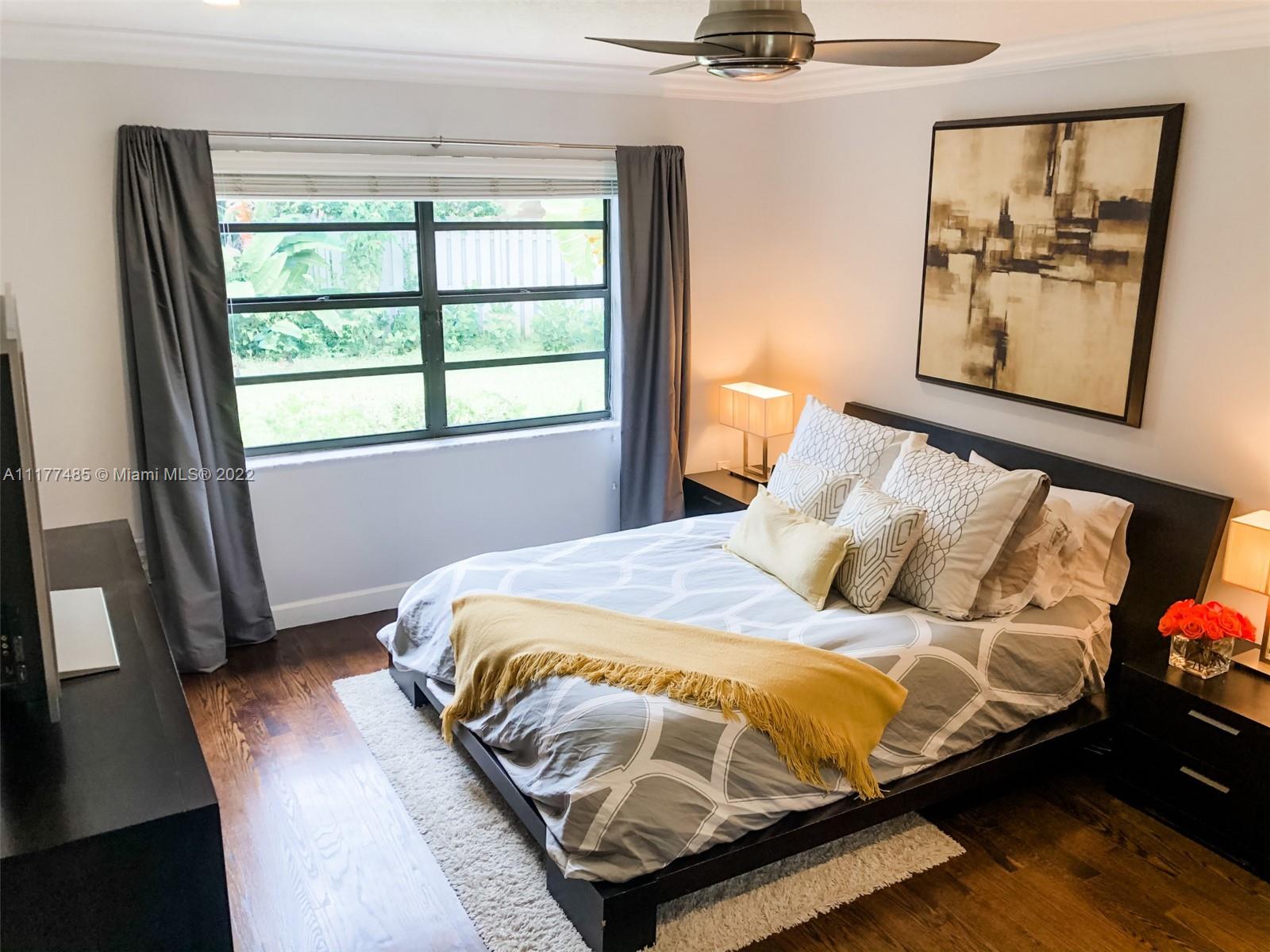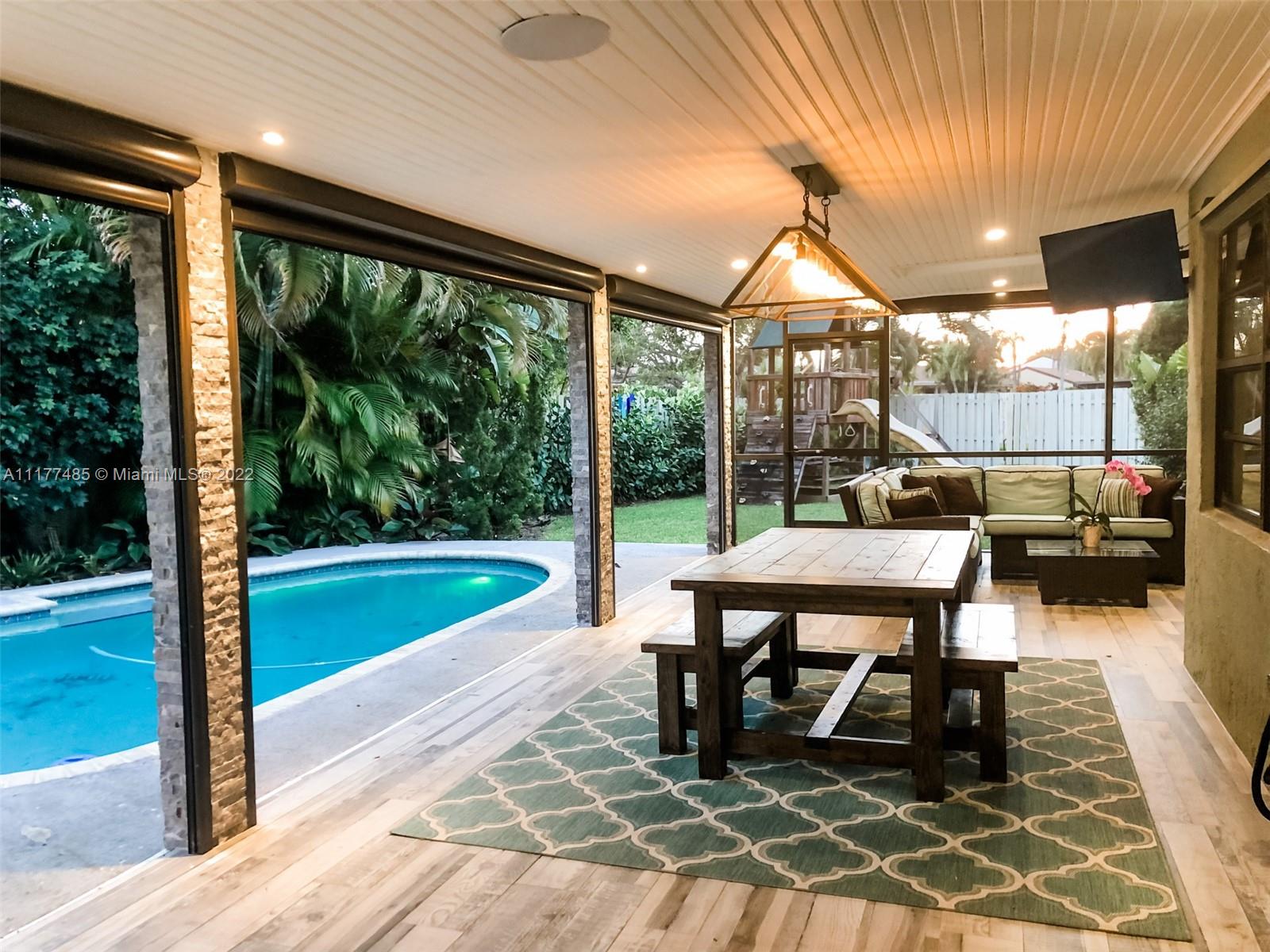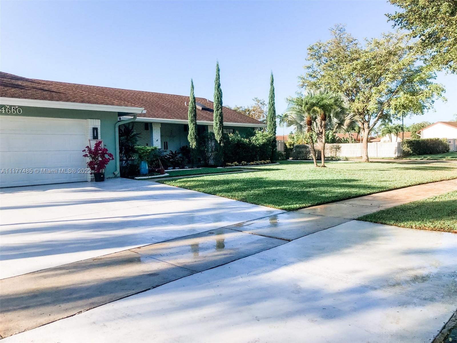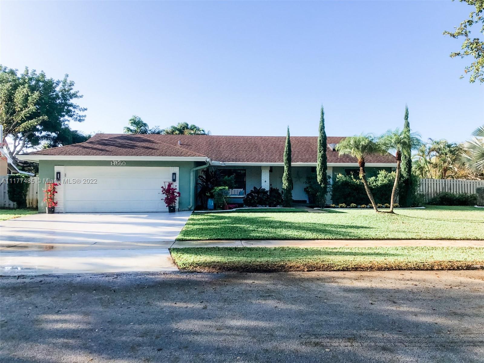 Updated 3/2 on a spacious corner lot in West Davie. Neighborhood living with sidewalks. Split floorplan with vaulted ceilings. Kitchen has granite countertops and stainless steel appliances. Completely upgraded patio is perfect for entertaining with recently tiled floors, insulated ceiling to cool it down, app-controlled speaker system, dimmable lighting, remote controlled roller screens with additional roller shade to block the afternoon sun. Neutral tile throughout main living areas and wood floors in bedrooms. Extra large washer and dryer. Pool has disco lighting and a fence. Extra-wide driveway. Very close to park and splash pad. Close to Weston, major highways, Mall, tons of activities and nightlife.