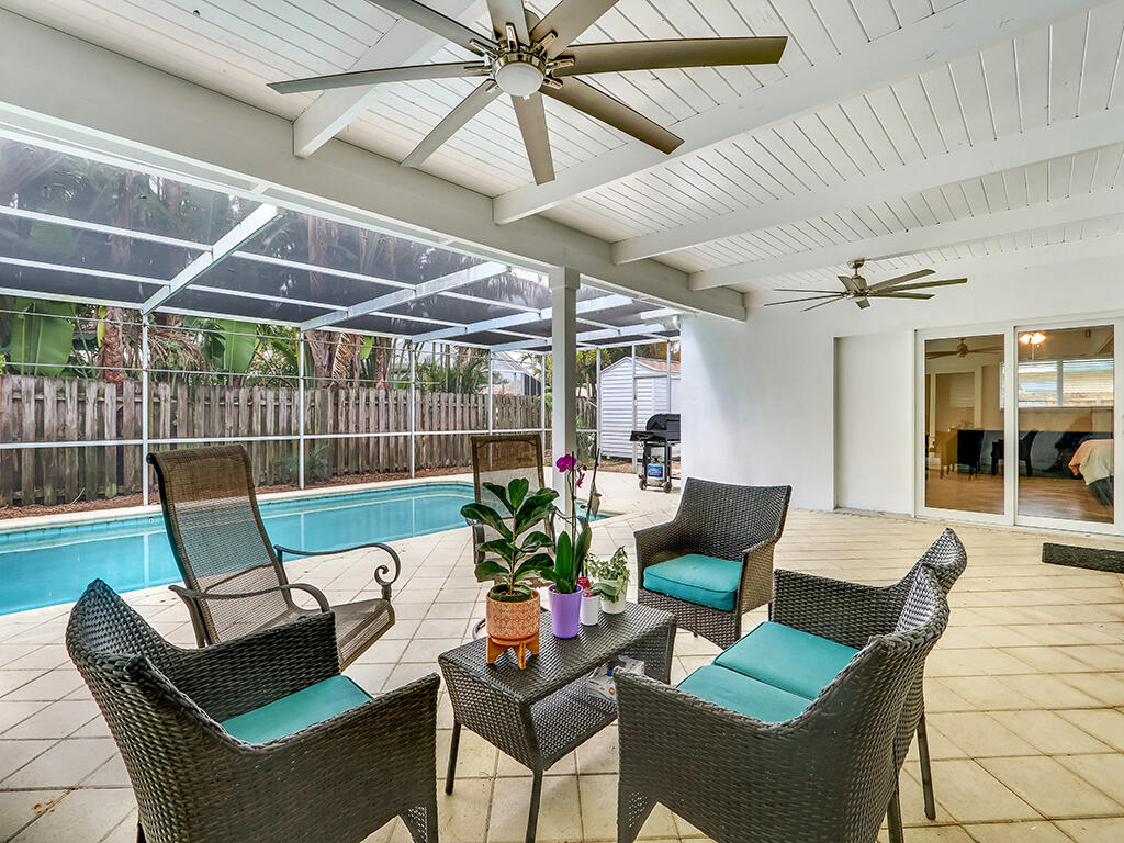 Be ready to love the mid century 4 bedroom 2.5 bath home. The spacious split design and the great room with vaulted wood beam ceiling in the great room makes this perfect. The heated pool/patio is fully screened. It offers sun and shade with a nice sized covered patio to enjoy your Florida lifestyle. This home is hurricane proof with impact windows and impact garage door. The kitchen has granite countertops, new stainless steel appliances and pull out shelves in the pantry. Other upgrades include digital sprinkler that uses an app, brand new circular driveway and new landscaping. The home has a gas range, hot water heater, dryer and new gas meter. There is plenty of room for all of your toys with a nice sized side/backyard with room for a playset, pets and oversized garage.