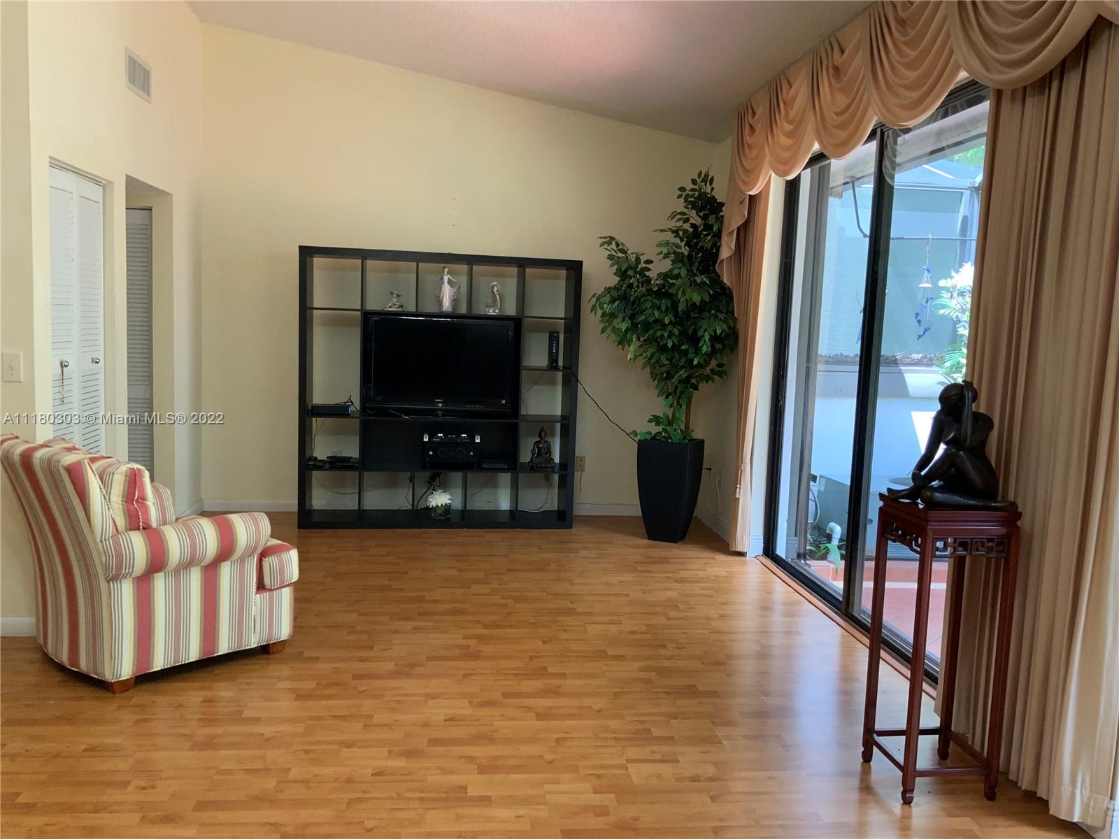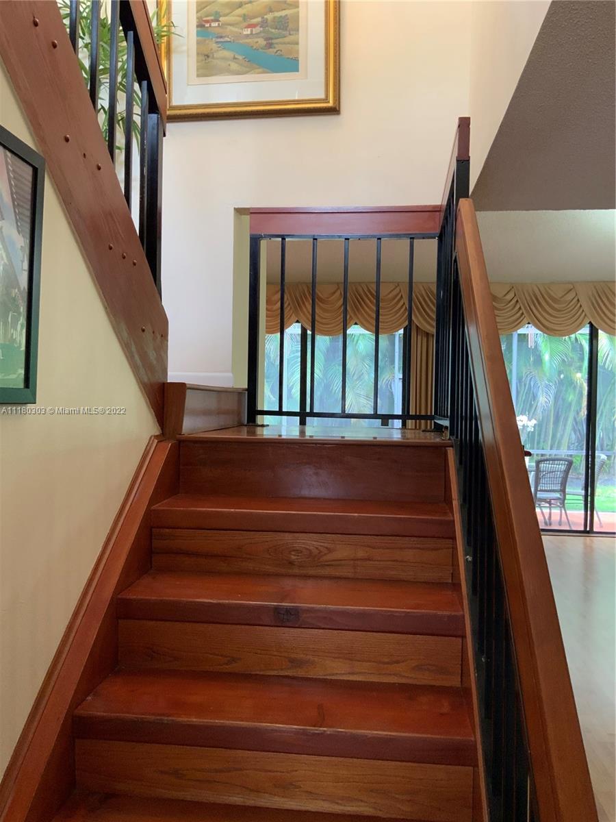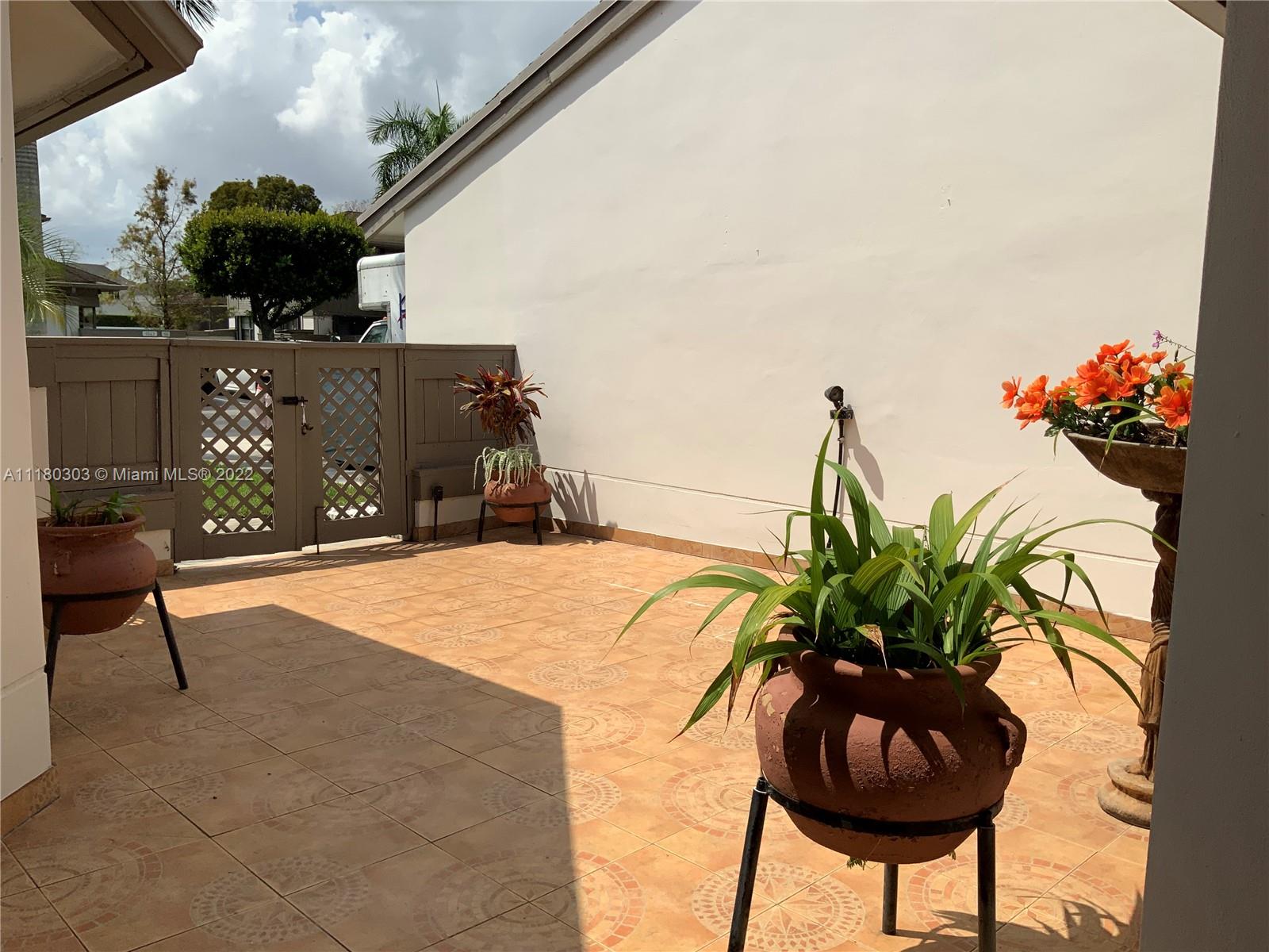 Lovely townhome with nice tiled front courtyard. Spacious open floor plan with volume ceilings, updated kitchen with beautiful granite top, plenty of cabinet space, nice size pantry, breakfast nook, one bedroom and full bath downstairs.Second floor features the huge master bedroom with plenty of closet space, bathroom with double sink, shower and tub.Lovely screened back patio , pavers, nice fountain and outdoor sink, very private, ideal to enjoy all year round. This home is a 3 bedrooms as per public records but presently used as a 2 bedroom and easy to convert to a third bedroom. Accordion shutters, tiled garage with garage door opener and 2 more parking spaces in driveway. Walking distance to school and great clubhouse with gym, pool, tennis and racket ball, party room, restaurant.
