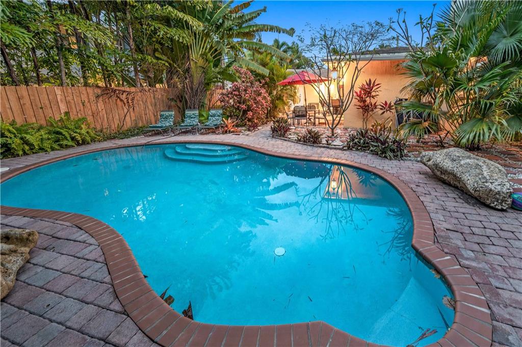 Victoria Park 3 bedroom 2 bath pool home with a terrific park-side location. This property checks all the boxes: an open floor plan, contemporary kitchen with two breakfast bars, formal dining room, a private pool side primary suite with French doors to the terrace and private yard. Rooms are generously-sized. The house has impact rated windows and doors. The yard is fenced for privacy with pretty gardens and a paved patio surrounding the free form pool. This property is currently licensed and operated as a vacation rental and is available furnished.