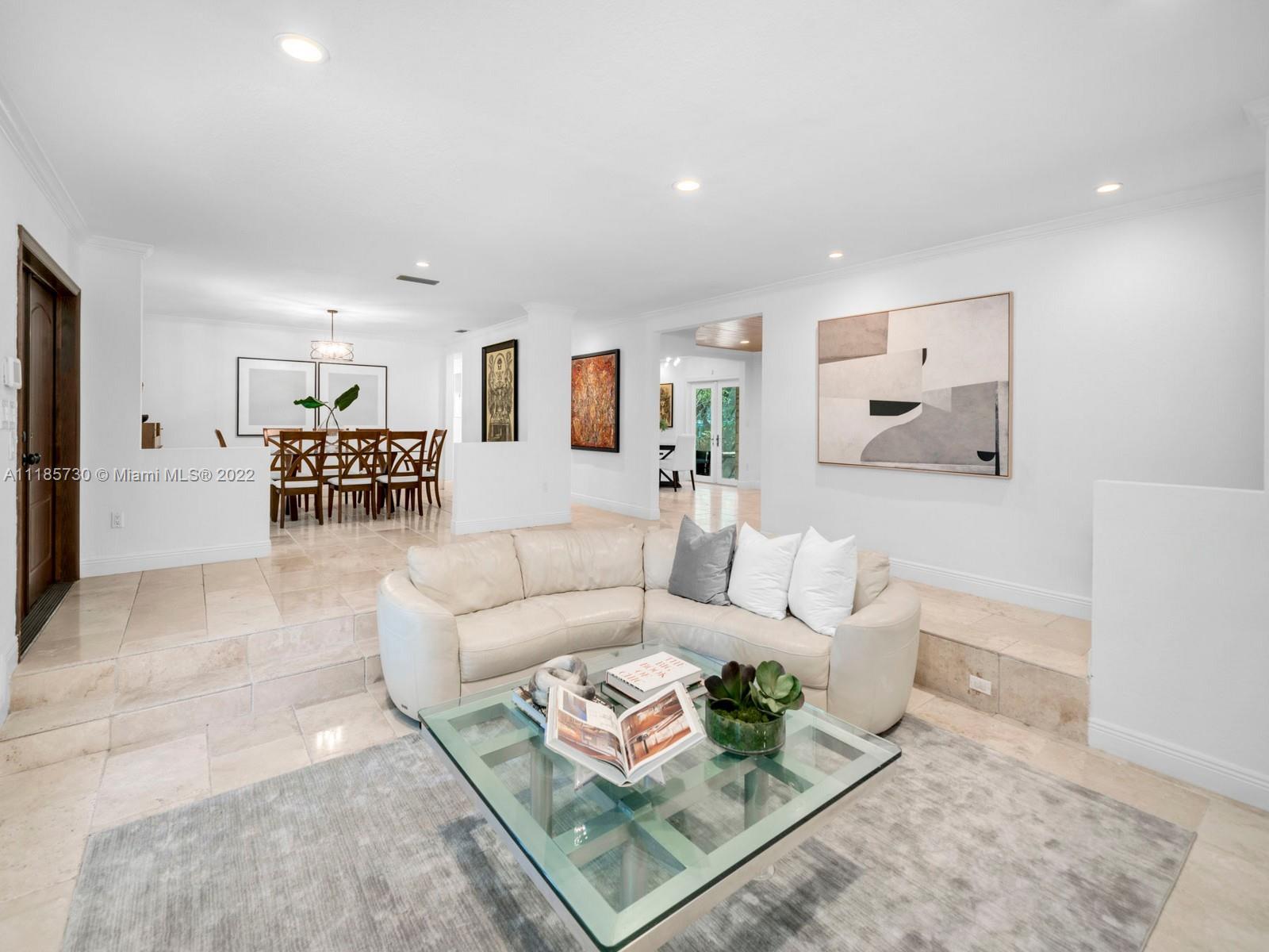 Gorgeous and completely renovated one-story home in highly sought-after Pinecrest by the Sea. An exclusive guard gated community offering a neighborhood park, pedestrian friendly roads, top municipal services, and an excellent voluntary HOA. Elegantly renovated move in ready home that includes 5 bedrooms and 5 full bathrooms plus home office/den and converted garage. Home features elegant interiors, spacious living areas, formal living and dining, family room adjacent to an updated kitchen with quartz countertops and stainless-steel appliances overlooking a beautiful pool surrounded with luscious landscaping. Features include impact windows and doors, travertine floors, saltwater pool, and Tesla charger. Beautifully elevated and oversized corner lot. Elite schools nearby