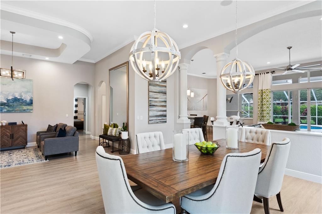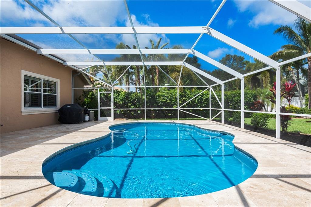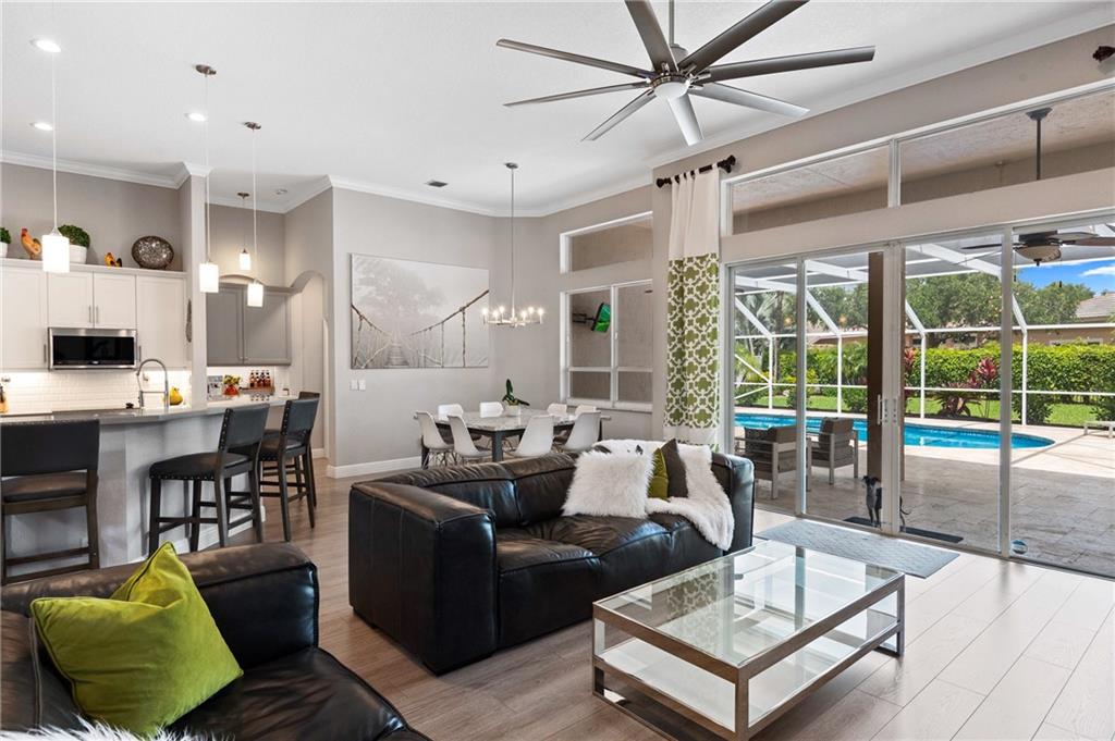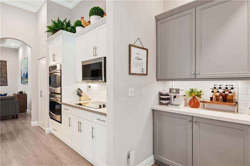 Stunning, turn key 4 bedroom (4th bedroom is currently used as an office), 3 full bathroom pool home located in the guard gated community of Grand Reserve. This home features an open floor plan with volume ceilings and an updated kitchen with white shaker cabinets, new quartz counter top, subway tile backsplash, a built in coffee bar, upgraded kitchen pantry shelving, GE Profile Stainless Steel Appliances. Laminate and tile flooring throughout with upgraded baseboards. Large master with a walk in closet, bathroom has dual sinks with a separate shower and tub. Screened in pool w/ salt water pool and travertine. Enjoy your fully fenced, private back yard w/ lots of green space and a fenced dog run w/ a gate to the main yard. Laundry room has 2 stackable washers and dryers with laundry sink.