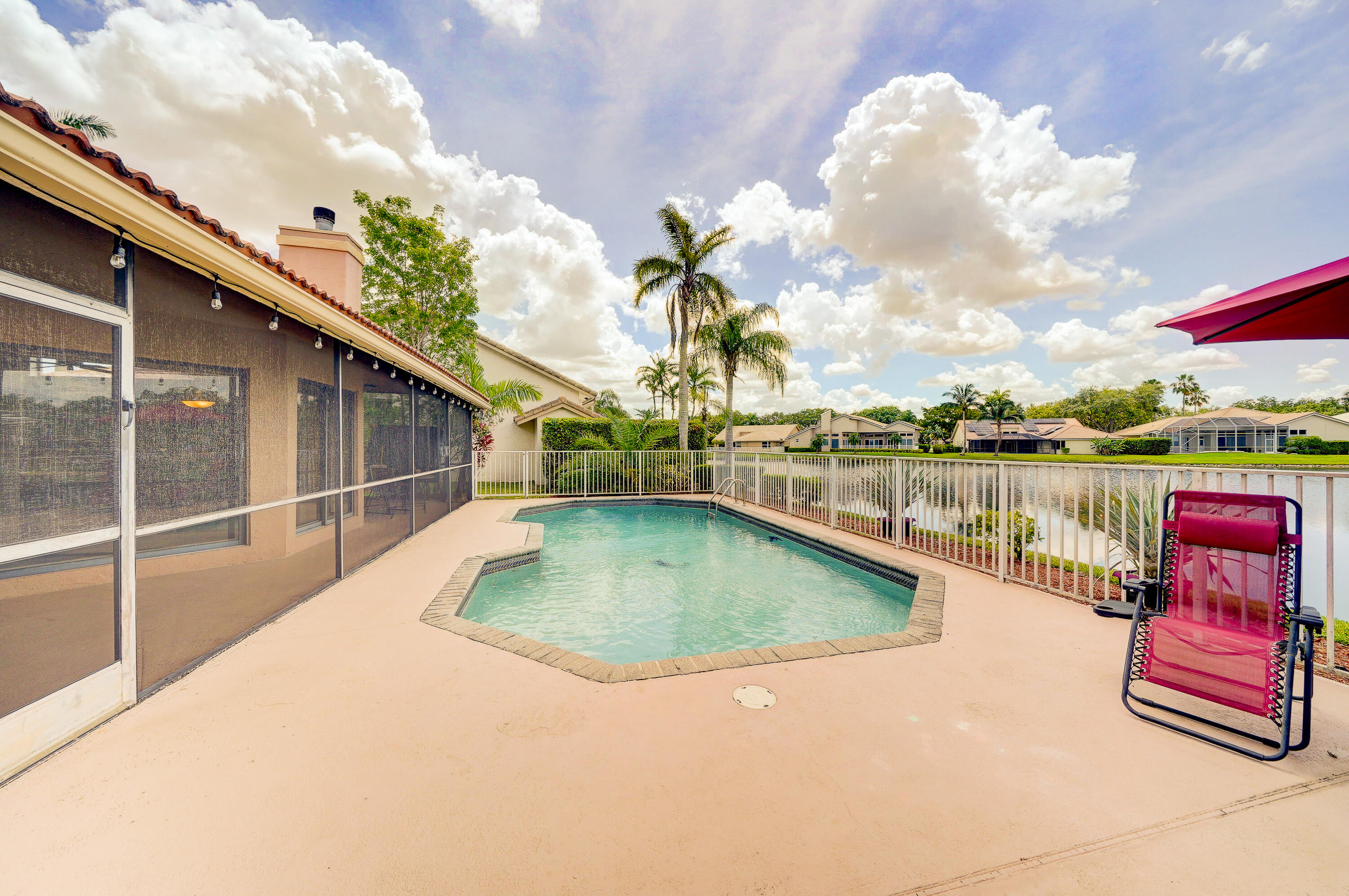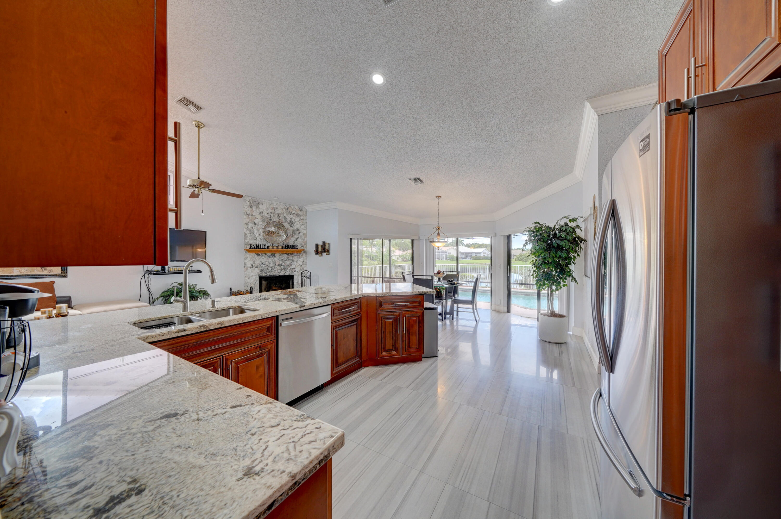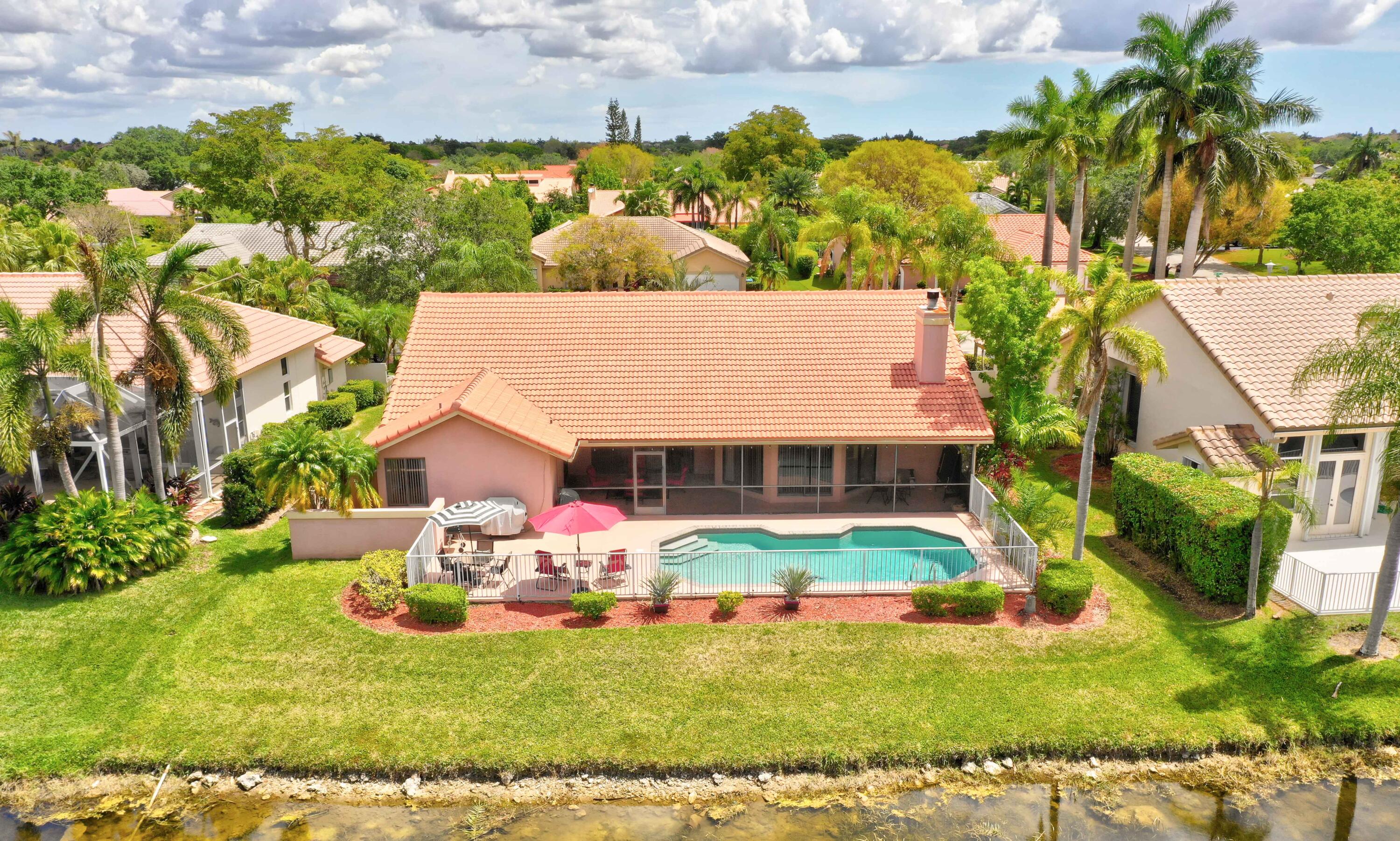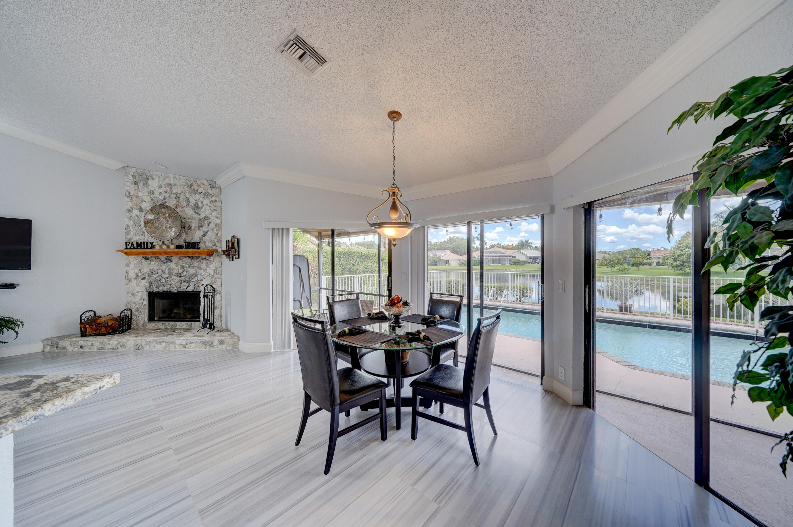 A true 5 bedroom home with 3 full baths, a split floor plan. This one story home has a 2 car garage with a circular driveway, fire place, crown molding throughout, new kitchen with granite counters and wood cabinets.. Home has been recently upgraded with new flooring and appliances. Roof is 2020. 2 A/C zones. Pool and back patio gives beautiful lake views.Screened in porch overlooks the pool and lake.