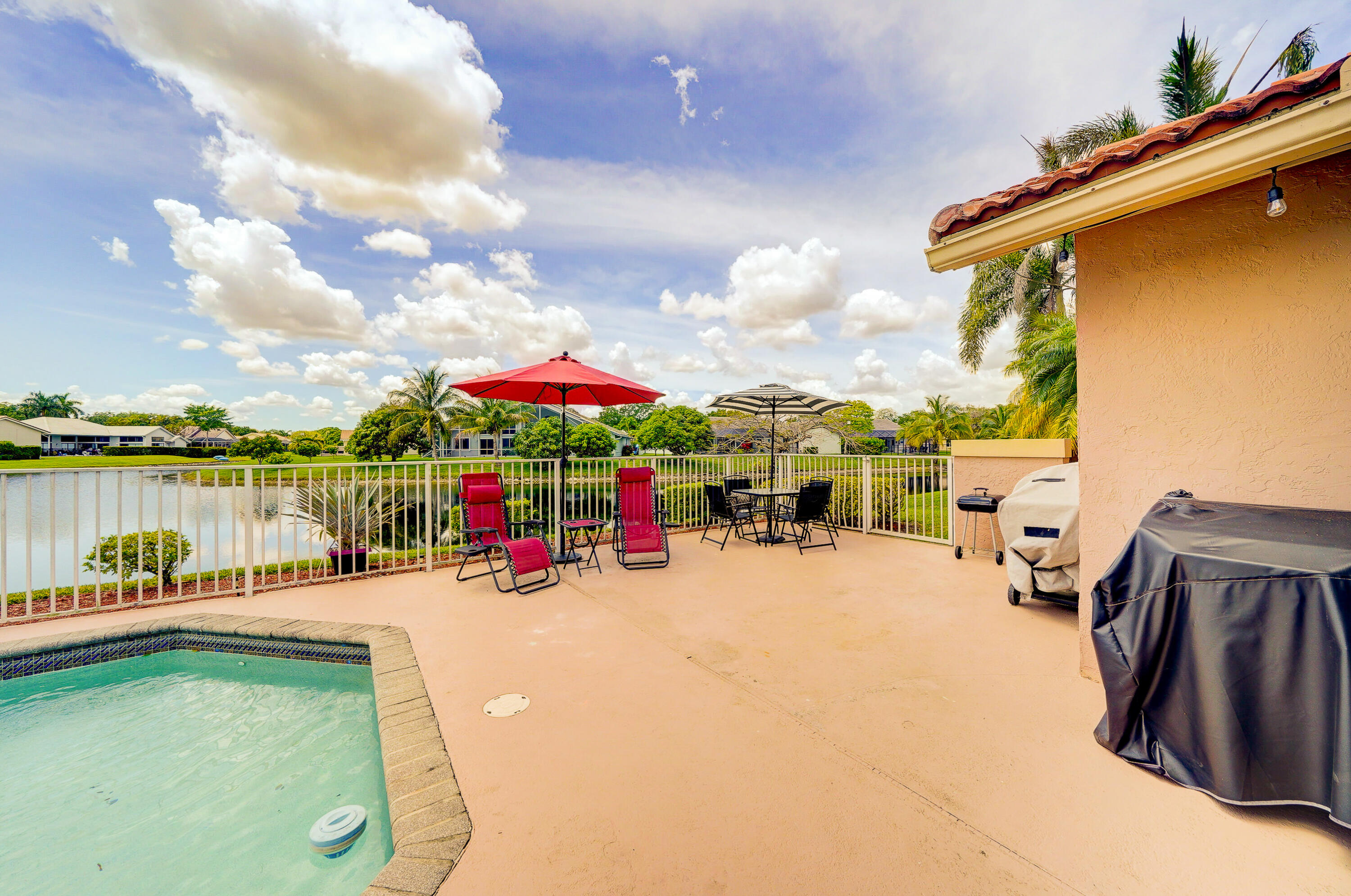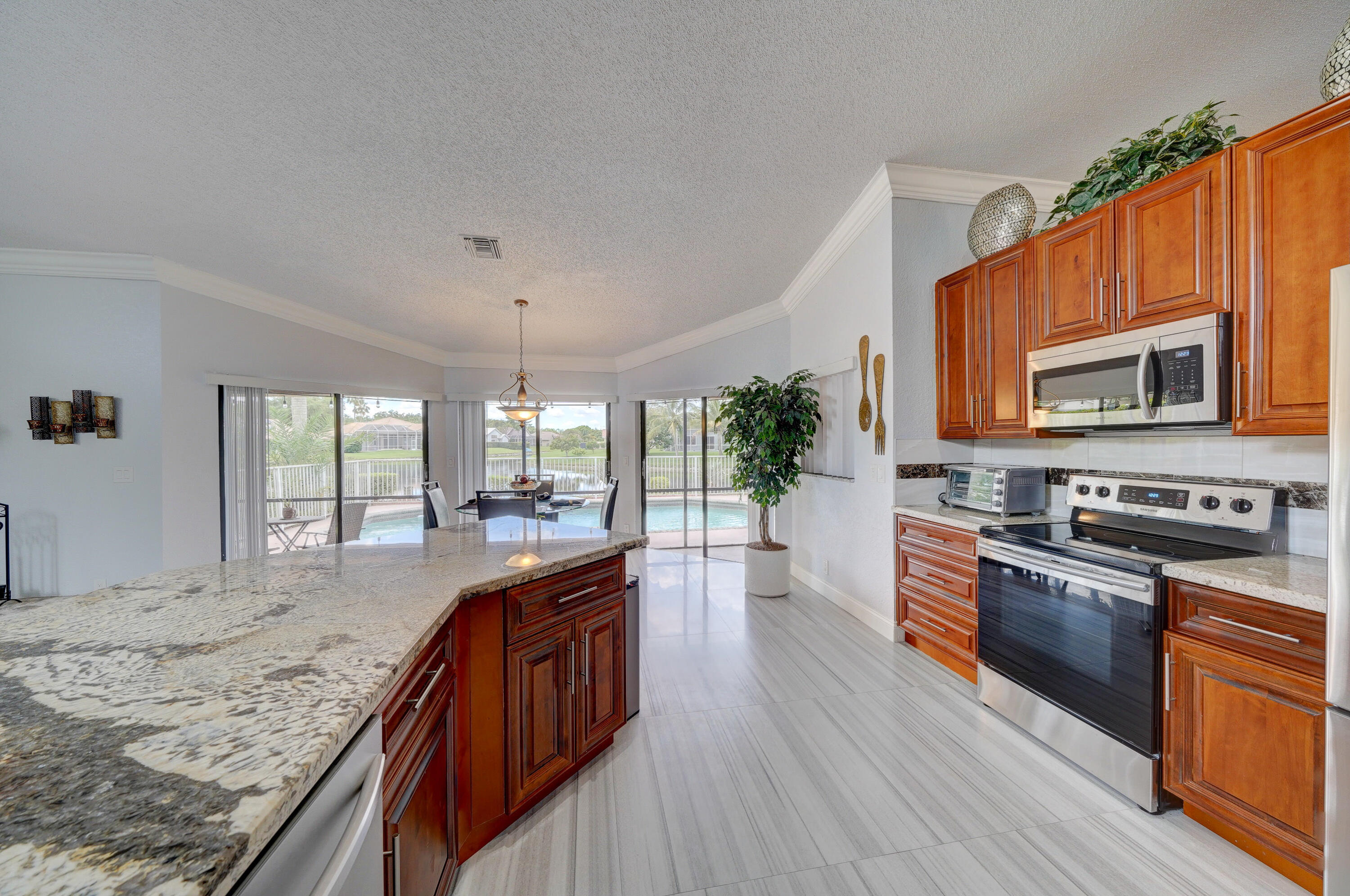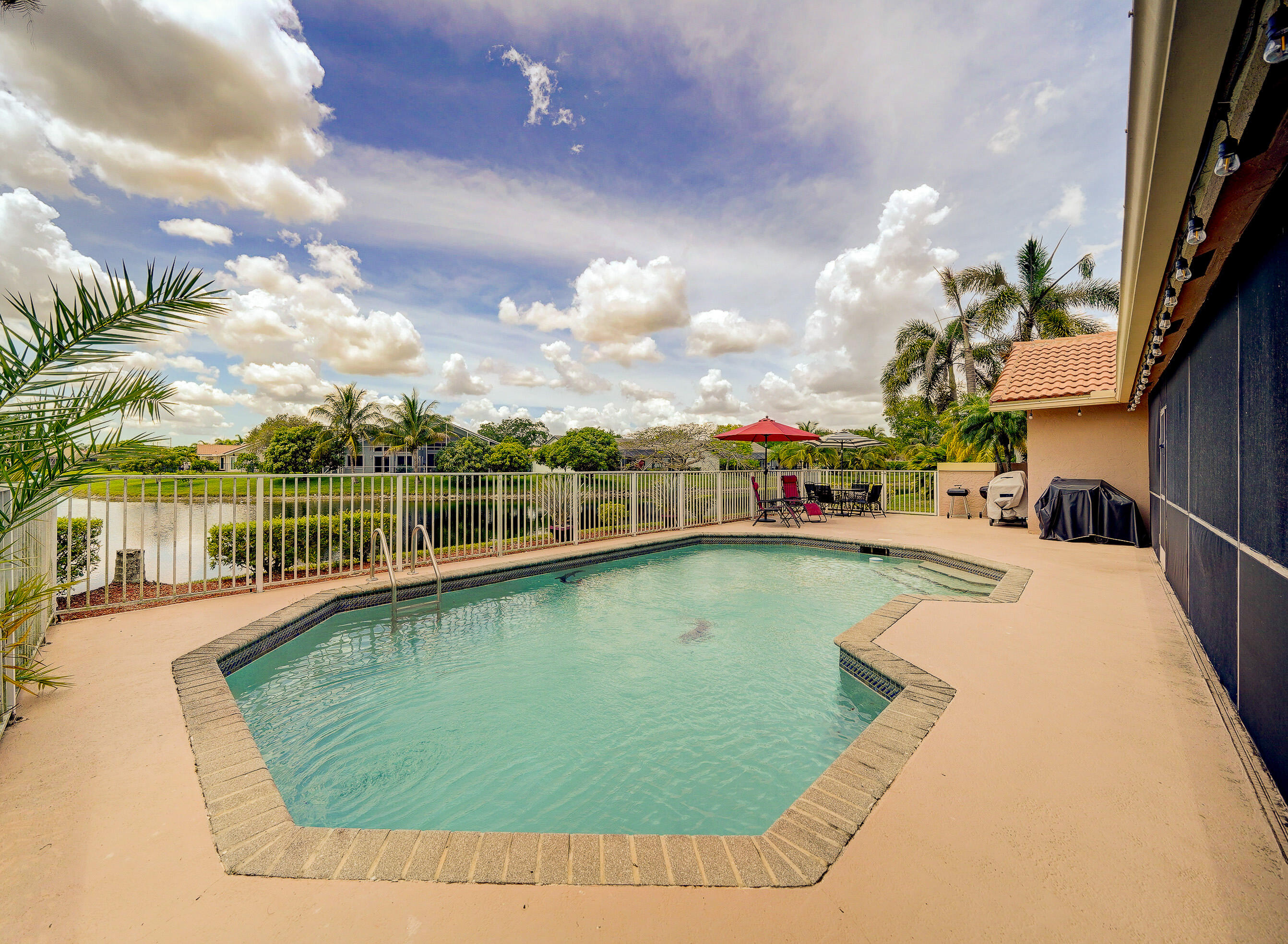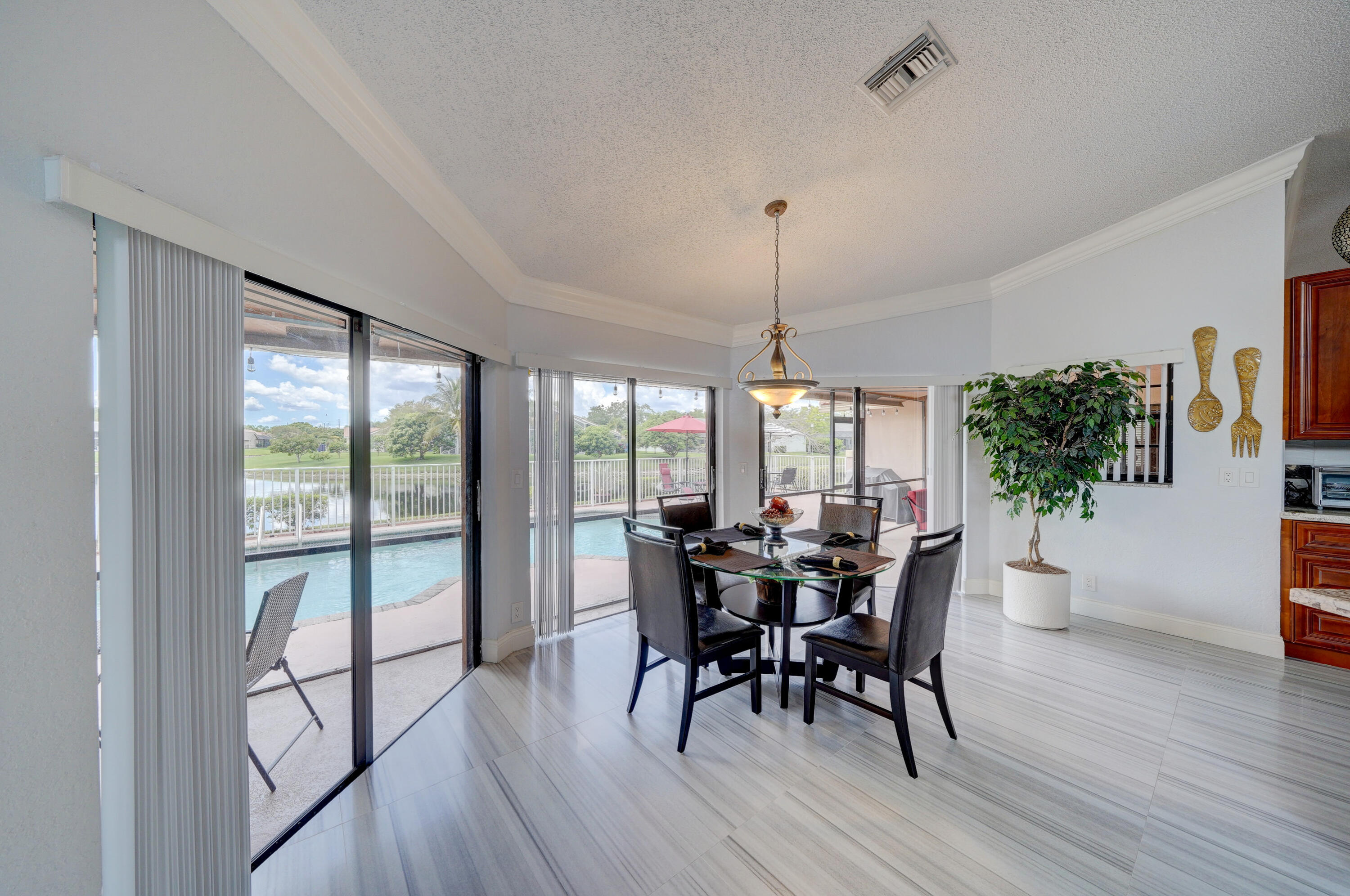 A true 5 bedroom home with 3 full baths, a split floor plan. This one story home has a 2 car garage with a circular driveway, fire place, crown molding throughout, new kitchen with granite counters and wood cabinets.. Home has been recently upgraded with new flooring and appliances. Roof is 2020. 2 A/C zones. Pool and back patio gives beautiful lake views.Screened in porch overlooks the pool and lake.