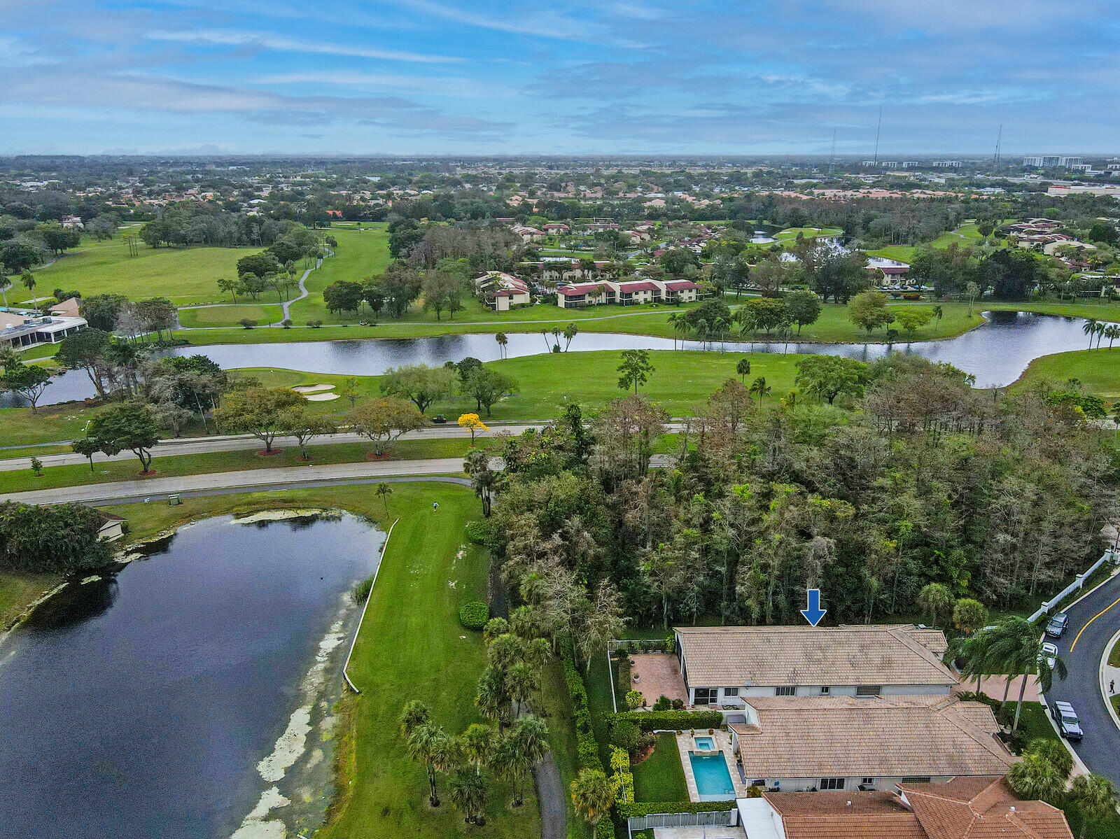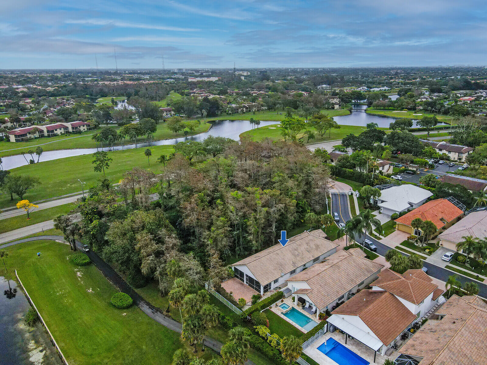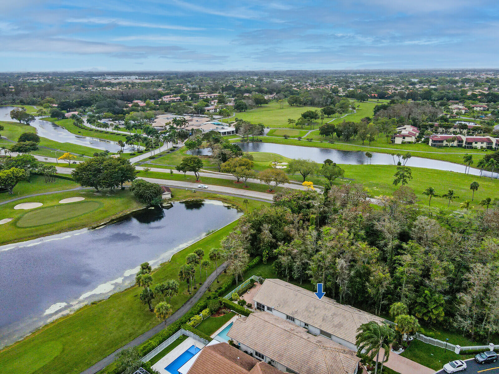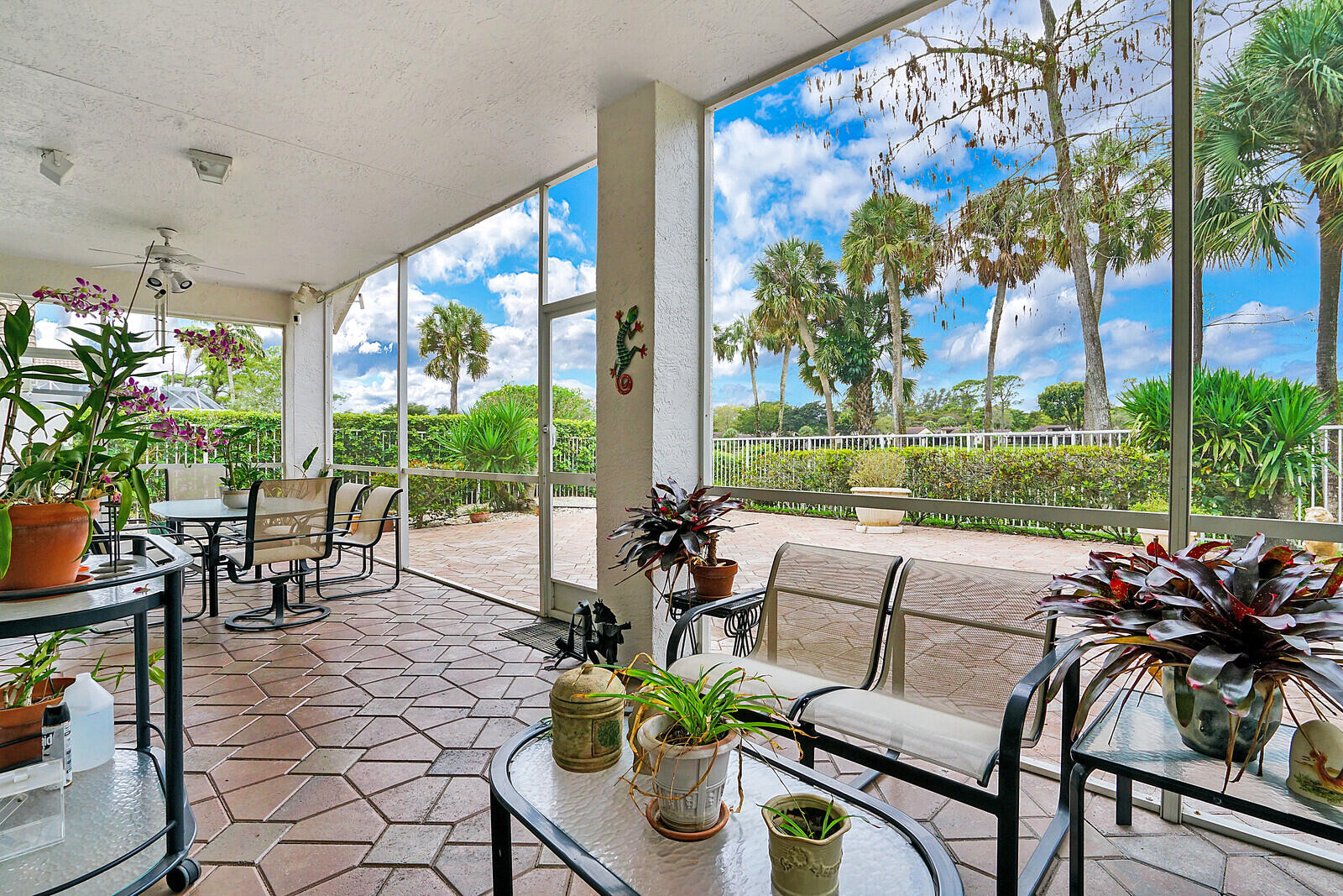 Let this home treat you to vibrant sunsets and views of the golf course-- with no mandatory buy in, this is scenery you can simply soak in from the breezy comfort of an enclosed porch or open sprawling patio. Ample outdoor space overlooking the 5th hole with water vista on the south course of Boca Lago Golf Club; this is the ultimate for year around living and entertaining. The features include a corner lot with full lush landscaping surrounding this property, offers a split floorplan with added features such as increased interior square footage, accordion shutters, private primary bedroom suite with views, custom outfitted closets, double vanity sinks in bathrooms with tile and marble throughout. This light bright 3 bedroom 2 1/2 bath with vaulted ceilings home is move in ready or