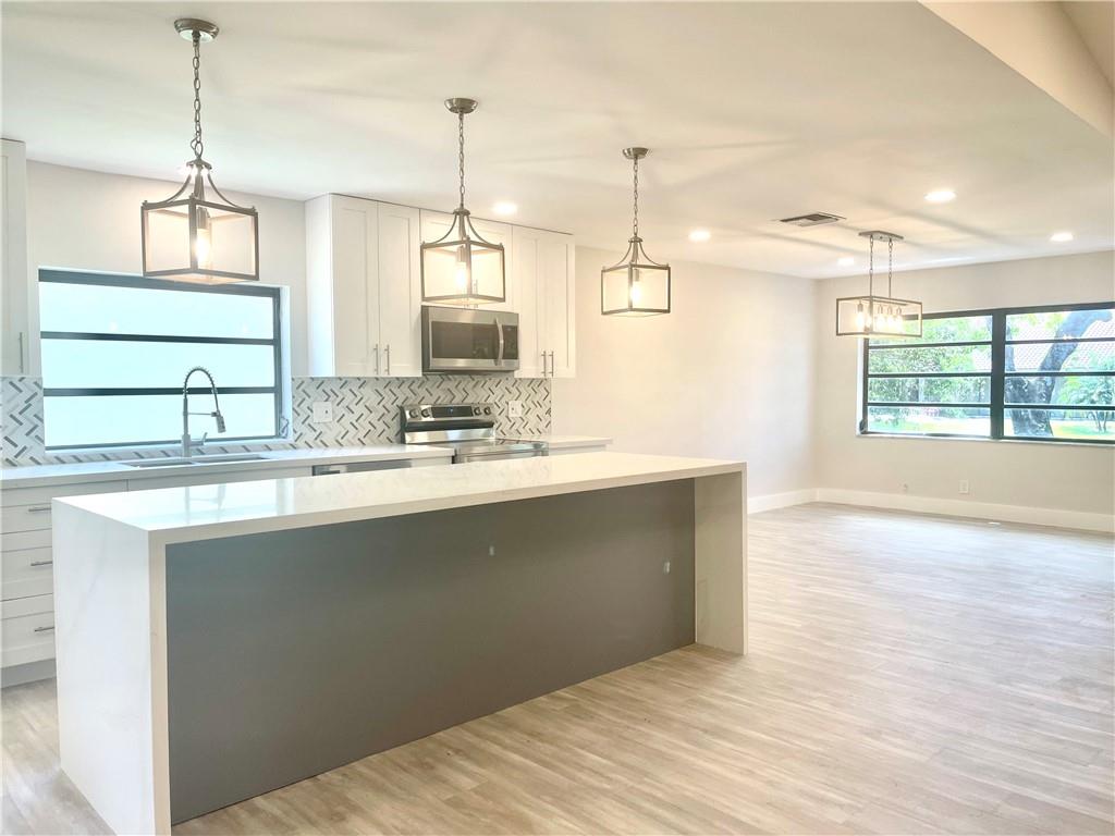 Gorgeous Waterfront Home in desirable Boca Chase area with Brand New Roof 2022. Tastefully Remodeled 2-bedroom 2-bathroom 2 car garage Single Family features an open floor plan with vaulted ceiling; Stunning Kitchen with beautiful Calacatta quartz countertops and waterfall island, high-end 42” cabinets, stainless steel appliances & modern back splash; Luxury Waterproof laminate flooring, modern baseboard, & light fixtures. Beautifully remodeled bathrooms. Spacious Master bedroom with huge walking closet. Oversized 2nd bedroom with walking closet. Screened patio with amazing water views. Laundry room, brand new washer & dryer. Low HOA fee covers lawn, clubhouse (pool & tennis courts), exterior paint. 2 pets up to 20 lbs each. 55+ Community, one buyer must have 700+ credit score.