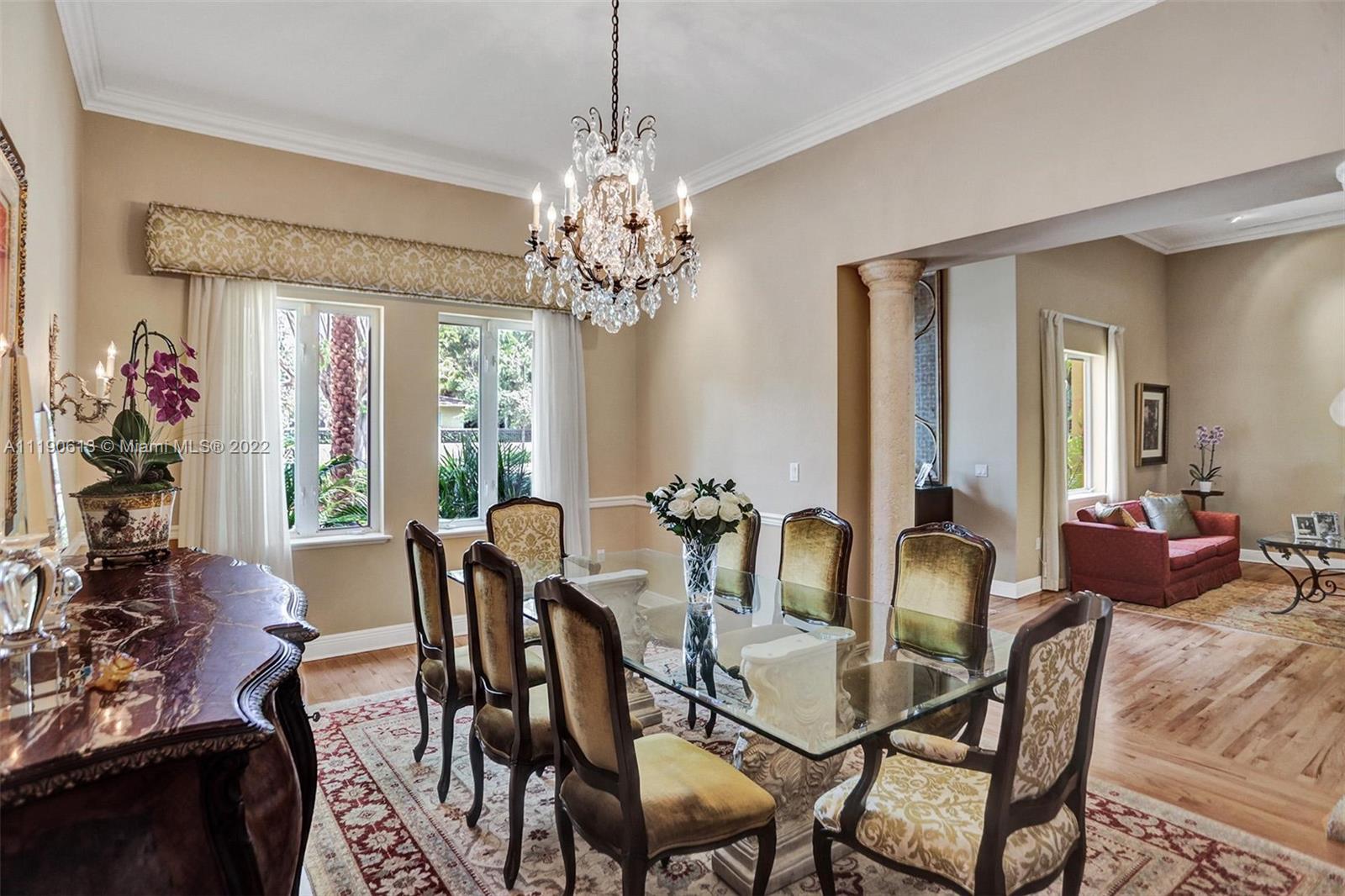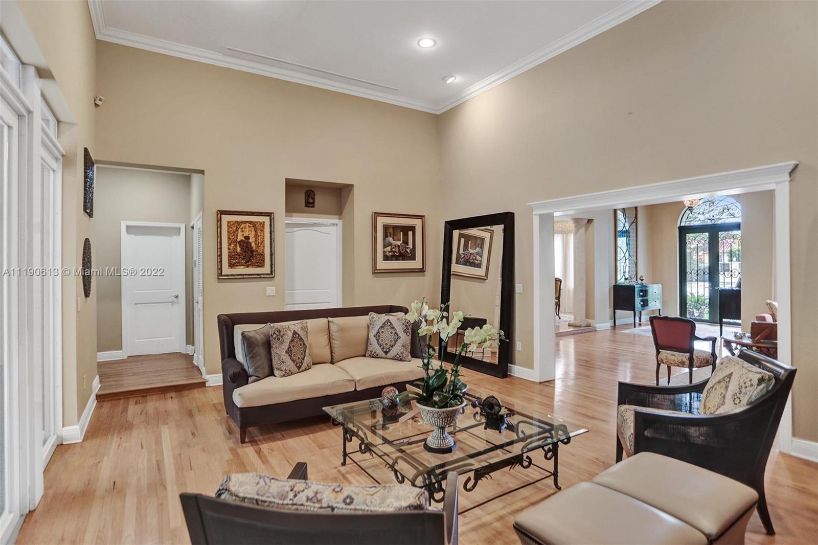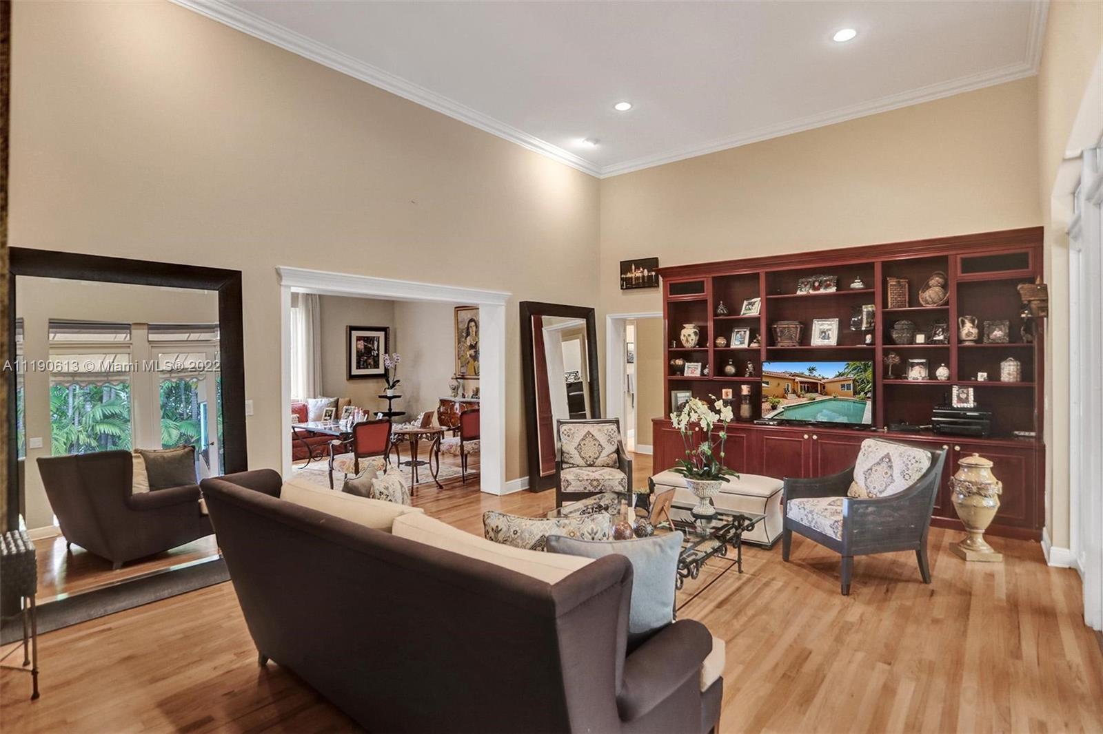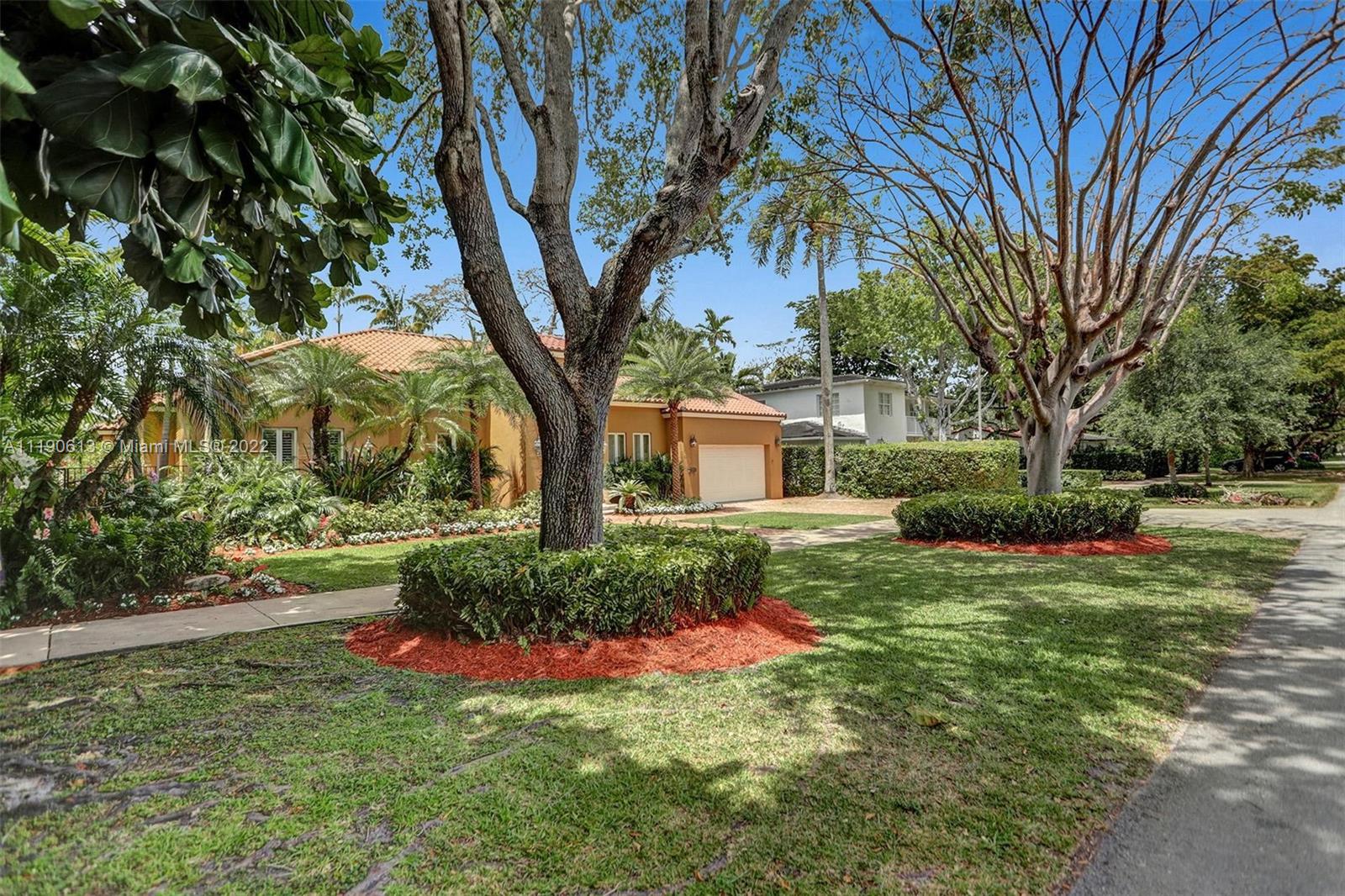 Stunning residence in a sought-after central Coral Gables area location awaits. An inviting foyer leads to a spacious living room, formal dining, entertainment room, and a large kitchen with cooking island with an informal dining area. The principal suite and two bedrooms with a hall bath are on one wing of the home; the 4th bedroom or office is opposite, with an adjacent hall/guest/cabana bath. Soaring ceilings throughout, and a bonus gardener's bath in the garage. Poolside, a covered terrace and pergola with a summer kitchen make the tropical outdoors quite inviting. Expanded and updated in 2002, the property offers a fabulous lifestyle in a desirable residential area, yet close to all the Downtown Gables amenities that our treasured City Beautiful offers.