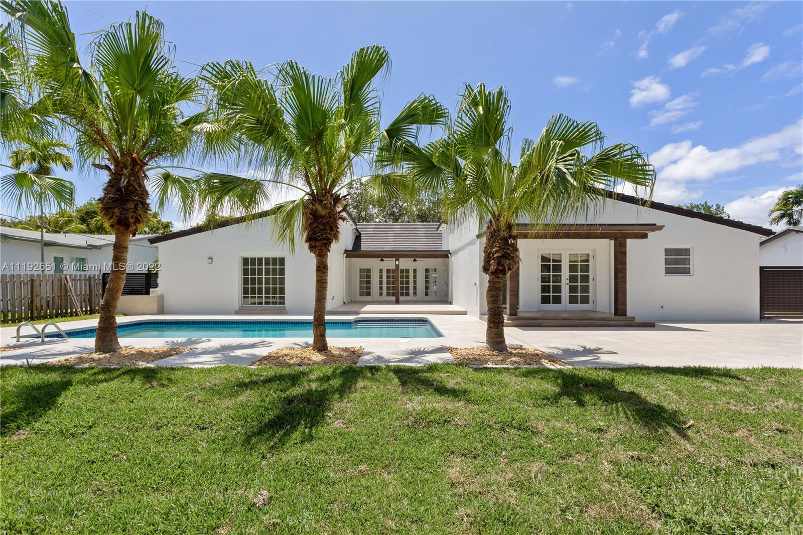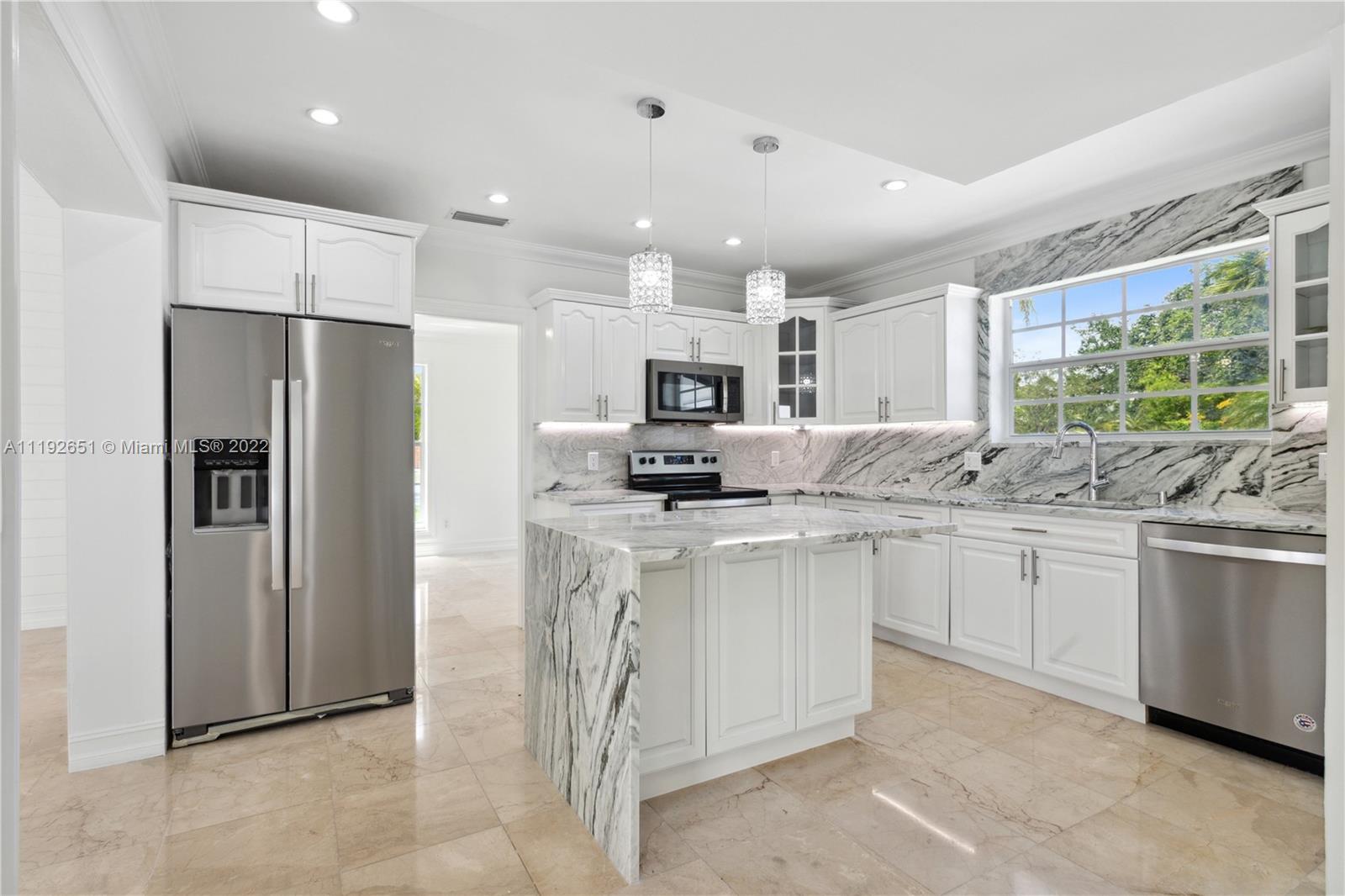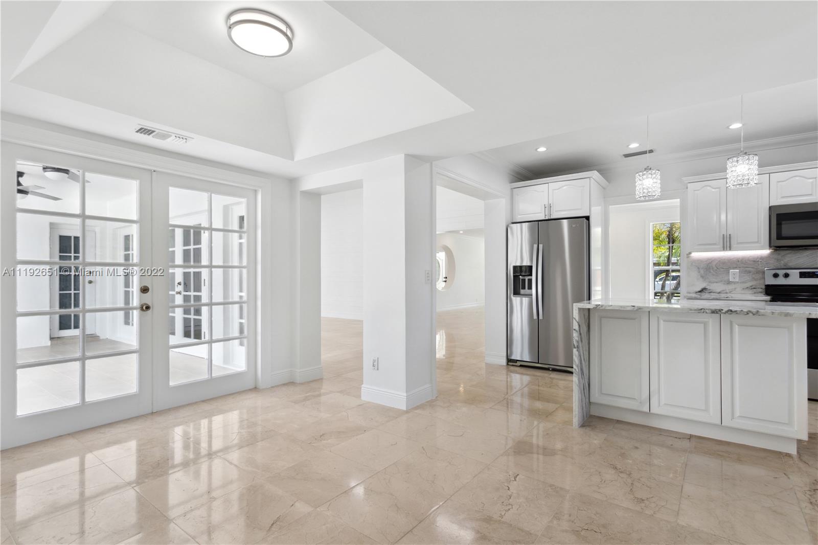 Florida dreaming in this fabulous updated home in the sought-after Kings Bay gated community in Coral Gables. The newly updated spacious and airy split-floor plan in this 4,000 sf space feels bright and welcoming. 5 bedrooms, (2 primary suites), plus an office and 3 full bathrooms, marble flooring throughout, an eat-in kitchen with new stainless steel appliances, and a laundry room. Light-filled interiors feature soaring vaulted ceilings, and beautiful French doors beckon you to the pool area and spacious backyard, a comfortable spot to relax with a morning cup of coffee or watch the sunset. The shaded covered patio is perfect for enjoying the outdoors and entertaining. A wonderful place to call home. This community has riparian rights to the Deering Bay Marina boat ramp.