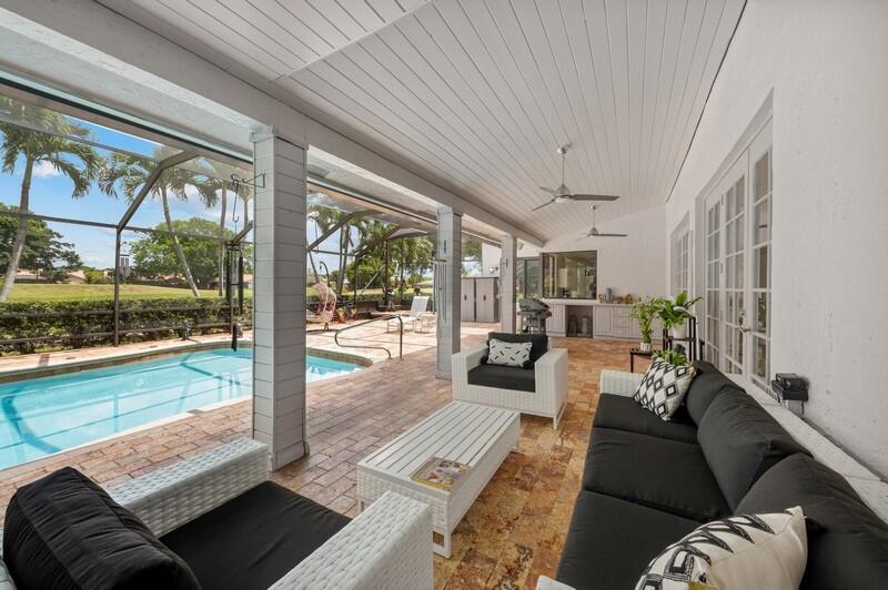 Your search for a truly turn key home is over. Elegantly situated on over 1/3 an acre in the Estate section of Boca Greens, this sprawling four bedroom, three and one half bath waterfront home has been meticulously redone with the highest taste and finishes. As you enter the open, sun-filled single story home you are greeted with soaring ceilings and stunning pool, lake, and golf course views through the French doors comprising the north side of the home. New wood floors and LED lights run throughout. The stunning eat-in chef's kitchen has been completely remodeled (2022) to include marble countertops, induction stove top, double wall oven, two sinks, and custom cabinetry. The private master suite includes a new custom double sink designer vanity (2022), oversized walk in closet, and