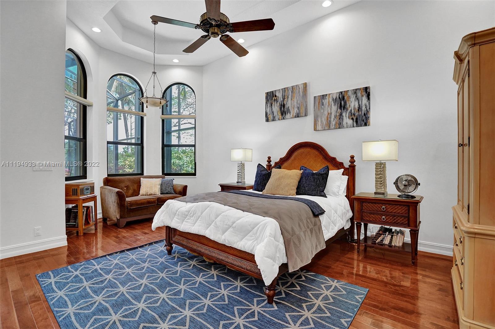 Stunning custom-designed home in the gated community of Windmill Lake Estates that sits on a 1+ waterfront acre. This home features NEW impact windows and doors. 5 bedrooms, 5.5 baths, a formal office, office in the master bedroom, custom theatre room, and den. Newly screened expansive paver patio and salt pool/spa area w/ summer kitchen, 3 car side garage, long circular driveway w/ grand porte-cochere. Marble in all living areas, wood in bedrooms. Sunken bar w/ wine fridge. Fireplace in living rooms and master bedroom. Freshly painted interior. Gourmet kitchen w/ center island, granite countertops, spacious pantry and top of the line appliances. Master bedroom w/ soaring ceilings, and 2 large walk-in closets w/ cabinetry. Marble master bath w/ jacuzzi, bidet, and large walk-in shower.