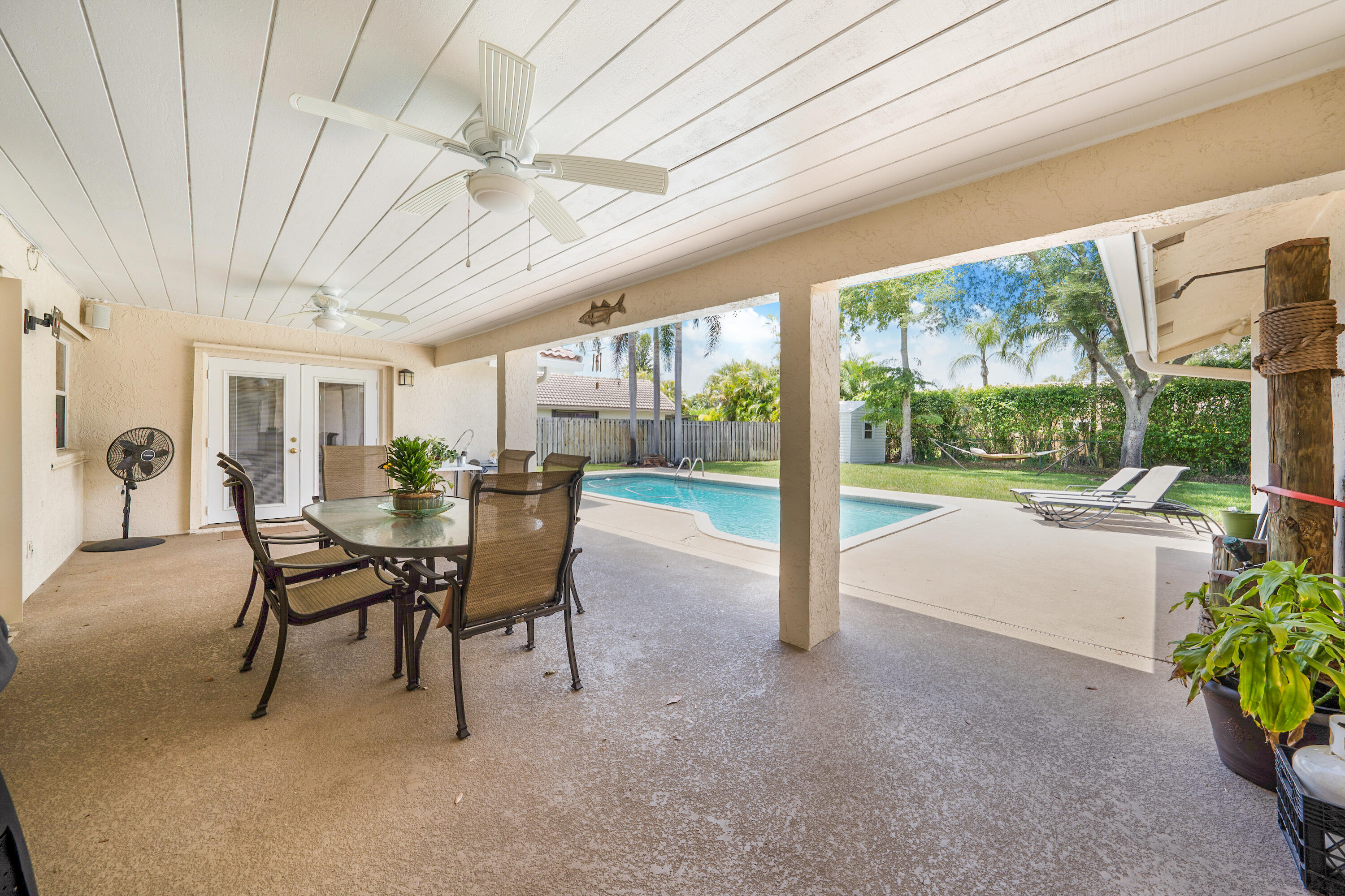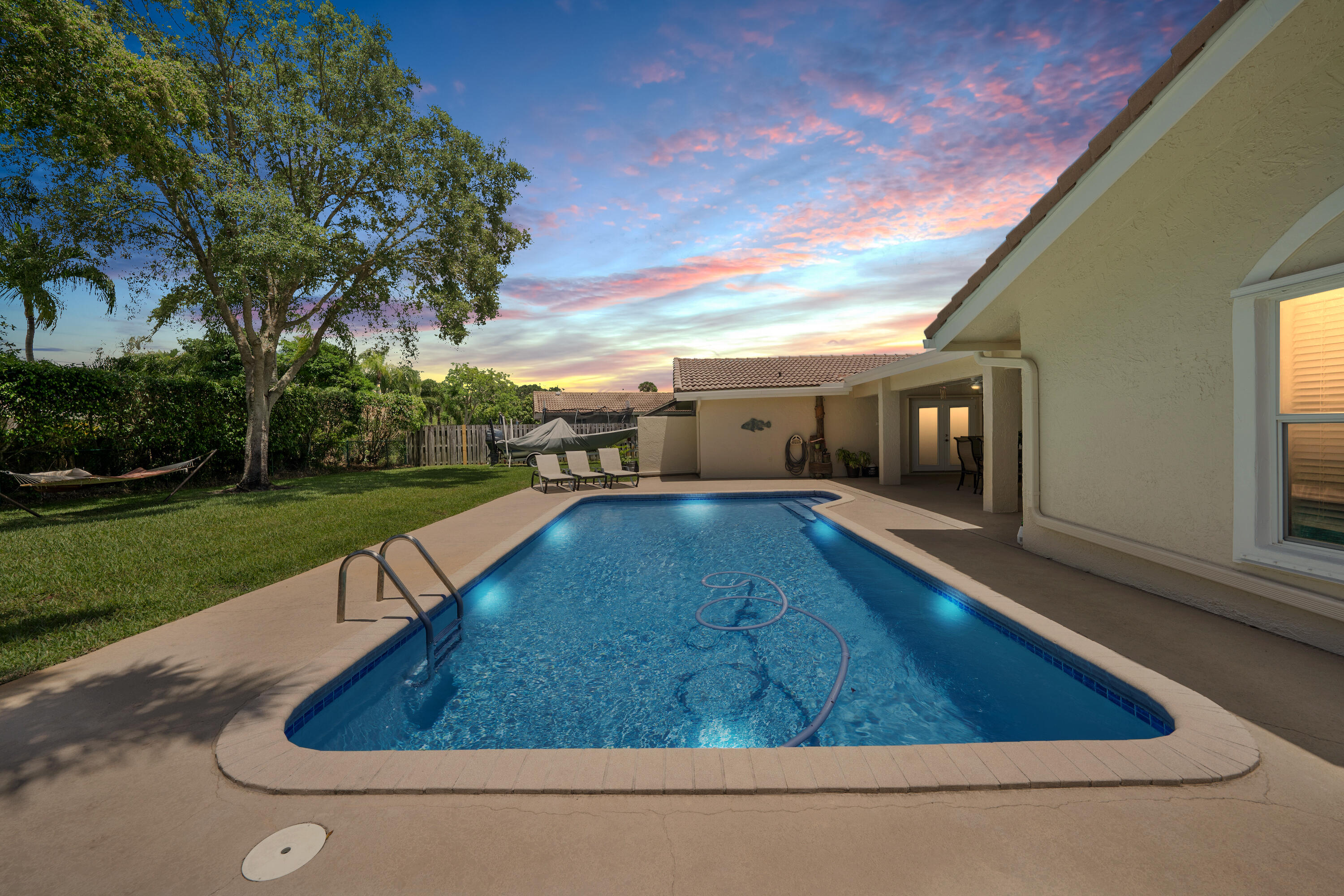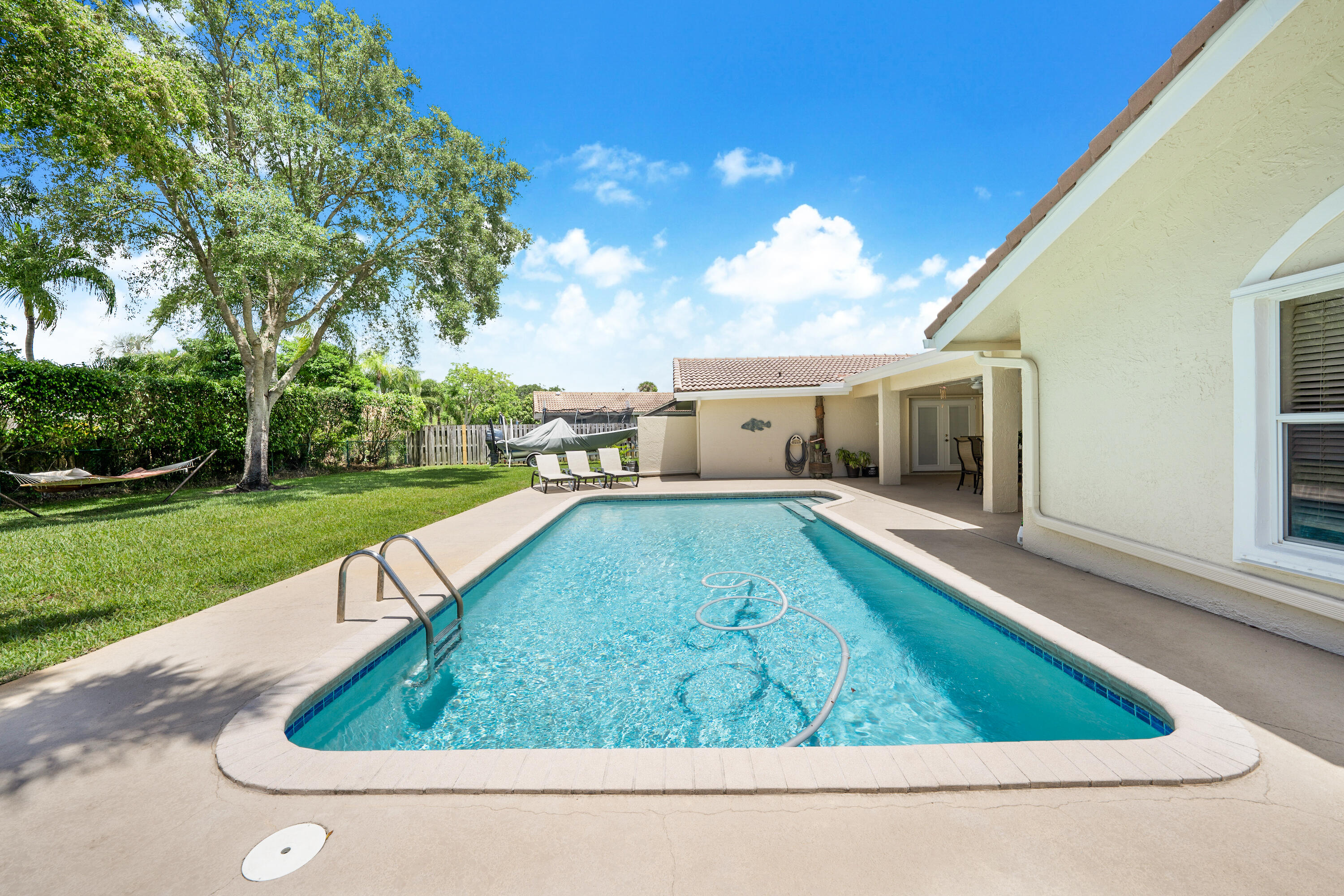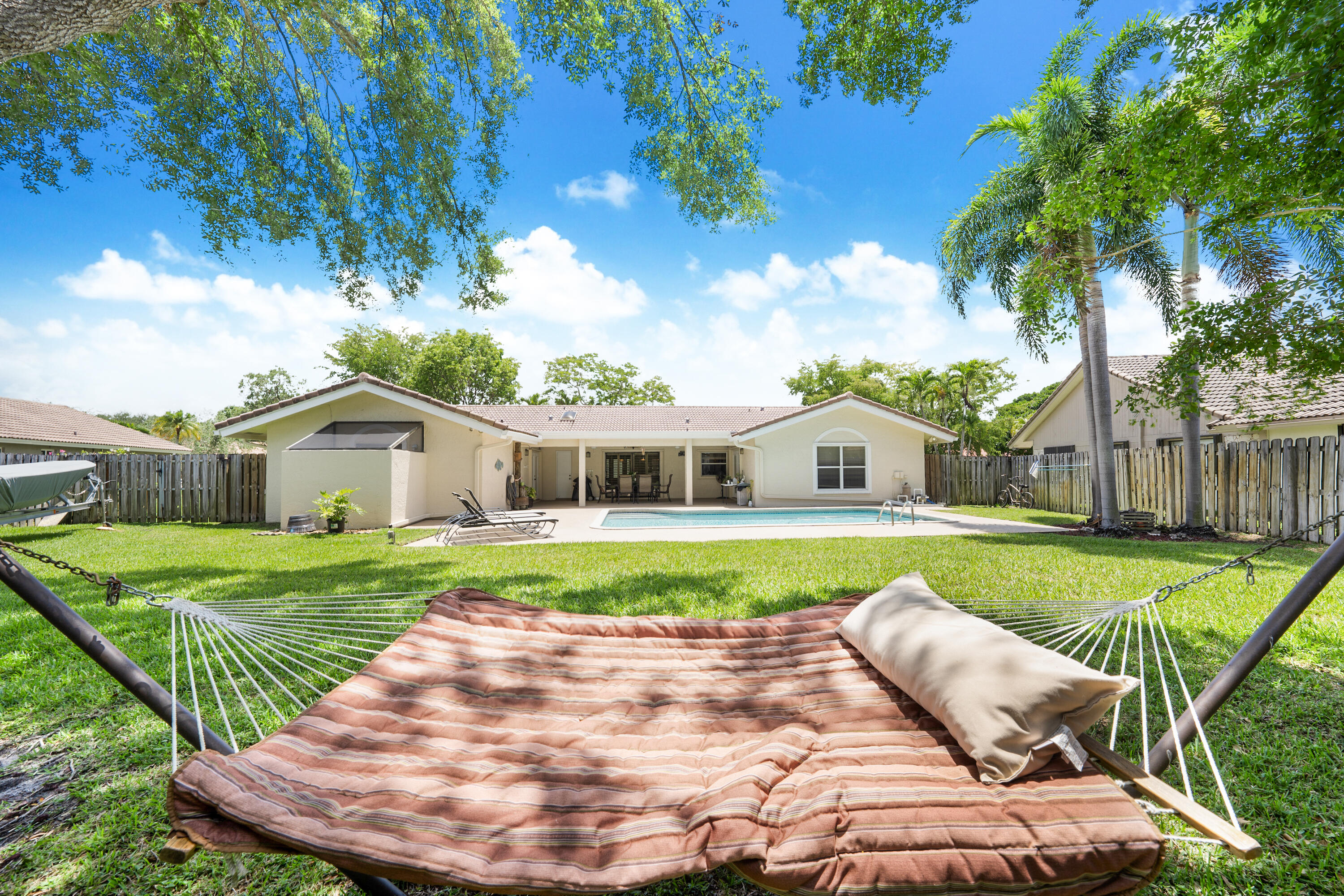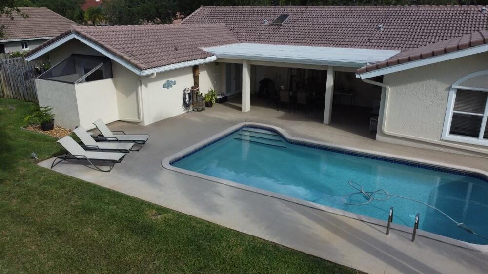 Spacious 4 bedroom 2.5 bathroom 2 car garage Pool home in highly desirable The Oaks of Coral Springs. Oversized fully fenced private lot on a quiet cul-de-sac street. Large open concept updated kitchen with granite counters, island, and stainless appliances. Huge Eat-In kitchen area. Neutral tile and crown molding throughout. Private covered lanai overlooking the serene pool and spectacular backyard. Formal dining and living areas with vaulted ceilings. Primary suite and all bedrooms are generous in size, including large walk-in closets. Circular driveway, hurricane shutters, indoor laundry room, and backyard shed complete this wonderful family home. Super well maintained pride of ownership. No HOA. Close to shopping malls, restaurants, and highways. A rated schools