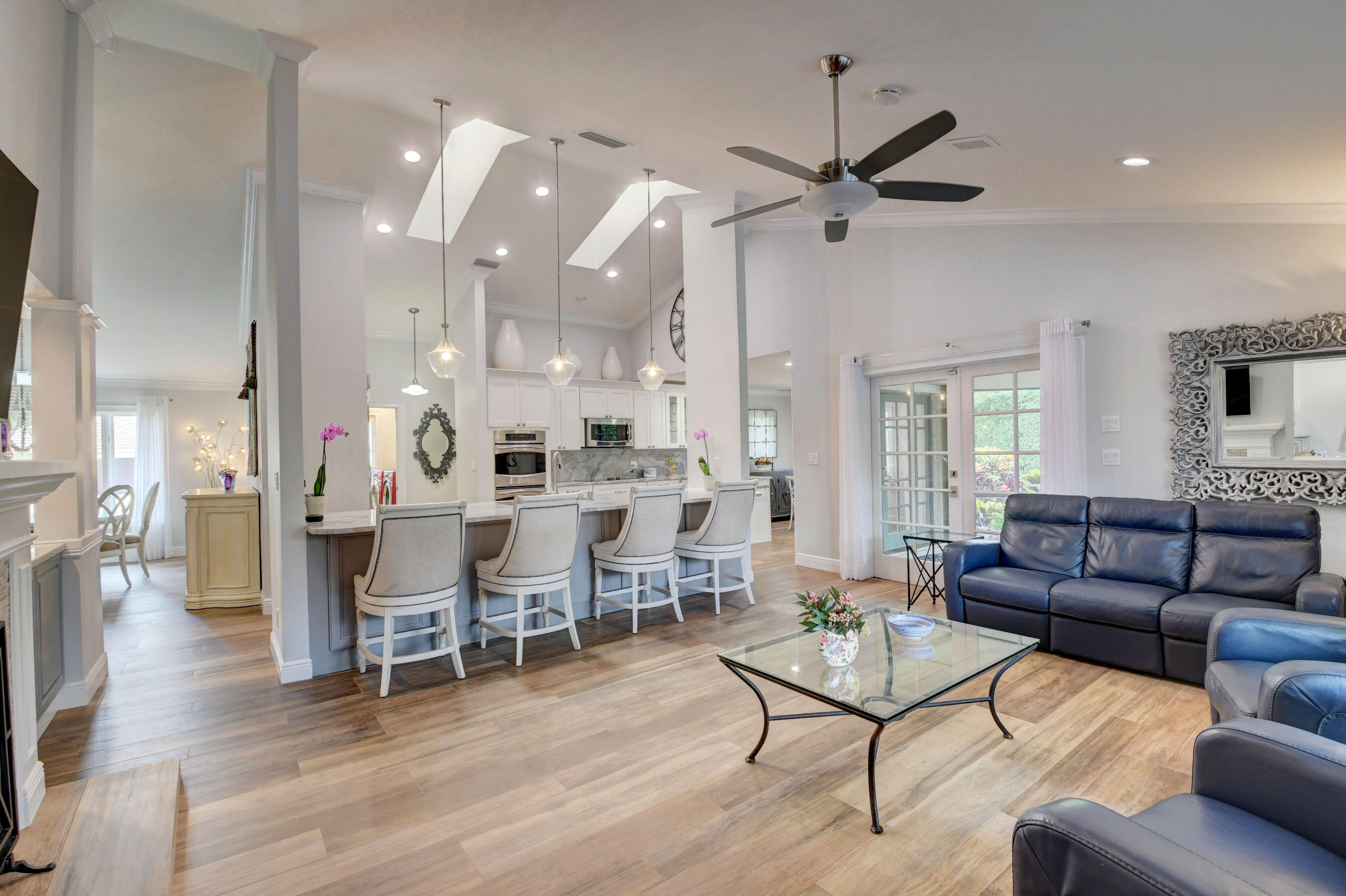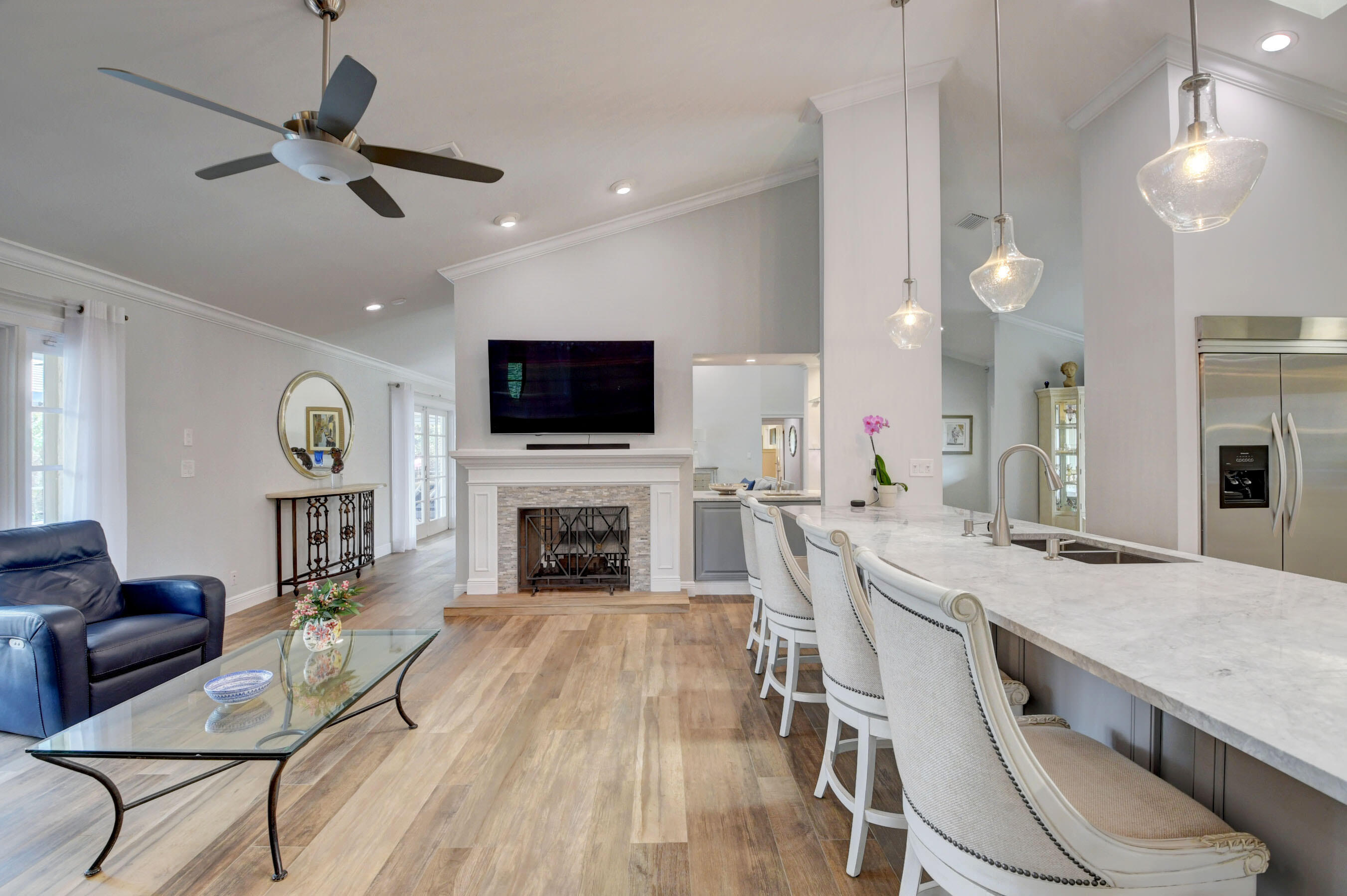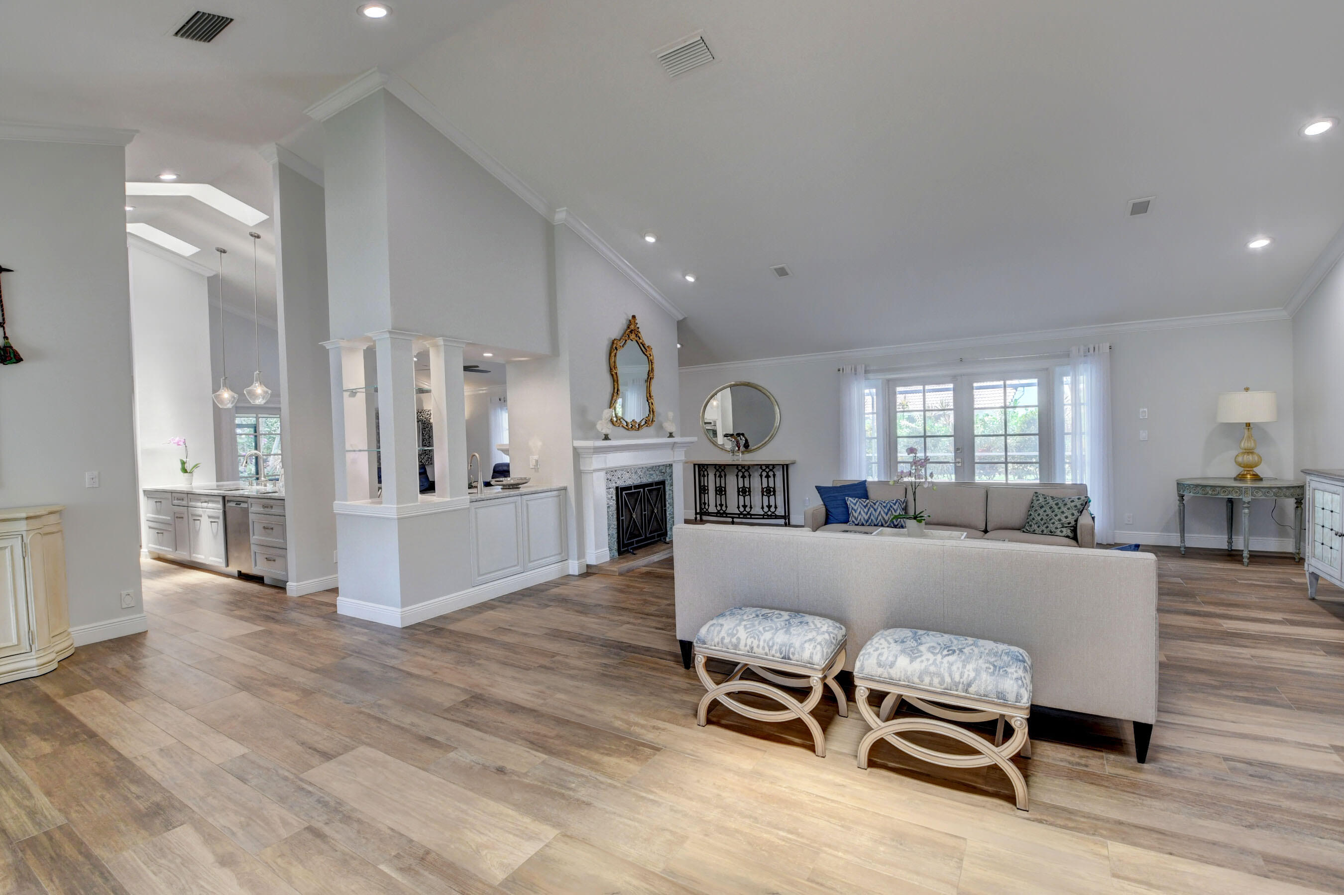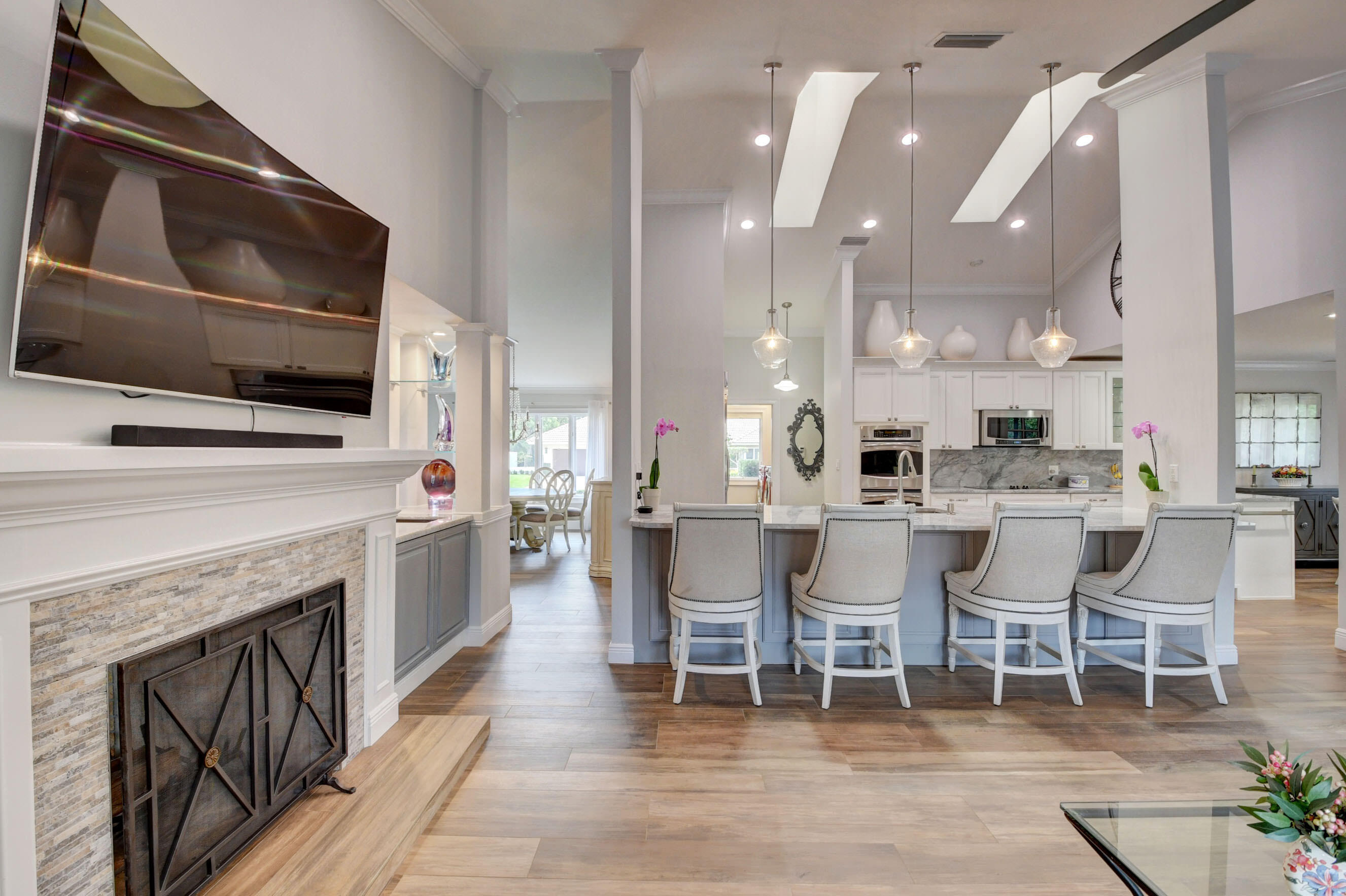 EXCLUSIVE WOODFIELD HUNT CLUB 4 BEDROOM , 3.5 BATH HOME . DESIGNER WHITE AND GREY OPEN KITCHEN. ALL STAINLESS STEEL APPLIANCES. HUGE CENTER ISLAND WITH QUARTZITE COUNTERTOPS AND GORGEOUS BACKSPLASH. ITALIAN PORCELAIN WOOD PLANK STYLE FLOORS THROUGHOUT. THE PRIMARY BATH COMPLETELY REMODELED WITH HIS AND HER BATHROOMS.MASTER BEDROOM HAS 2 WALK IN CLOSETS. ALL BEDROOMS HAVE ENSUITE BATHROOMS. 4TH BEDROOM COULD ALSO SERVE AS AN OFFICE OR PLAYROOM. DUAL WOOD BURNING FIREPLACES IN FAMILY ROOM AND LIVING ROOM. NEWER AC. COMPLETE OUTDOOR KITCHEN WITH NEWLY LANDSCAPED OVERSIZED BACKYARD.. LARGE POOL AND SPA AND ROOM FOR SWING SET. EXTERIOR NEWLY PAINTED. COMPLETE ACCORDIAN HURRICANE SHUTTERS.