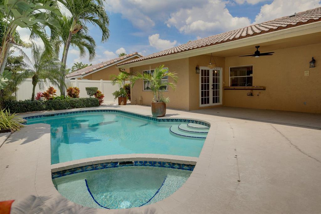 Spacious, spectacular 4 bedroom 2-1/2 bath home in Escondido within walking distance of house of worship. Stylish ceramic tile throughout, freshly painted interior, vaulted ceilings, and beautiful architectural details. Gourmet kitchen includes custom, white maple cabinets, gas stove, and newer appliances. Huge family room with custom white maple bar and French doors leading out to the large pool and lush landscaping. Plenty of room to entertain on the covered patio and take in the garden view. Large primary bedroom with French doors leading out to the outdoor oasis. Three additional, large bedrooms complete this perfect family home. Newer A/C and water heater. Escondido offers the lowest HOA fees in Boca Raton and includes a manned gate. Close to shopping, beaches, restaurants,etc