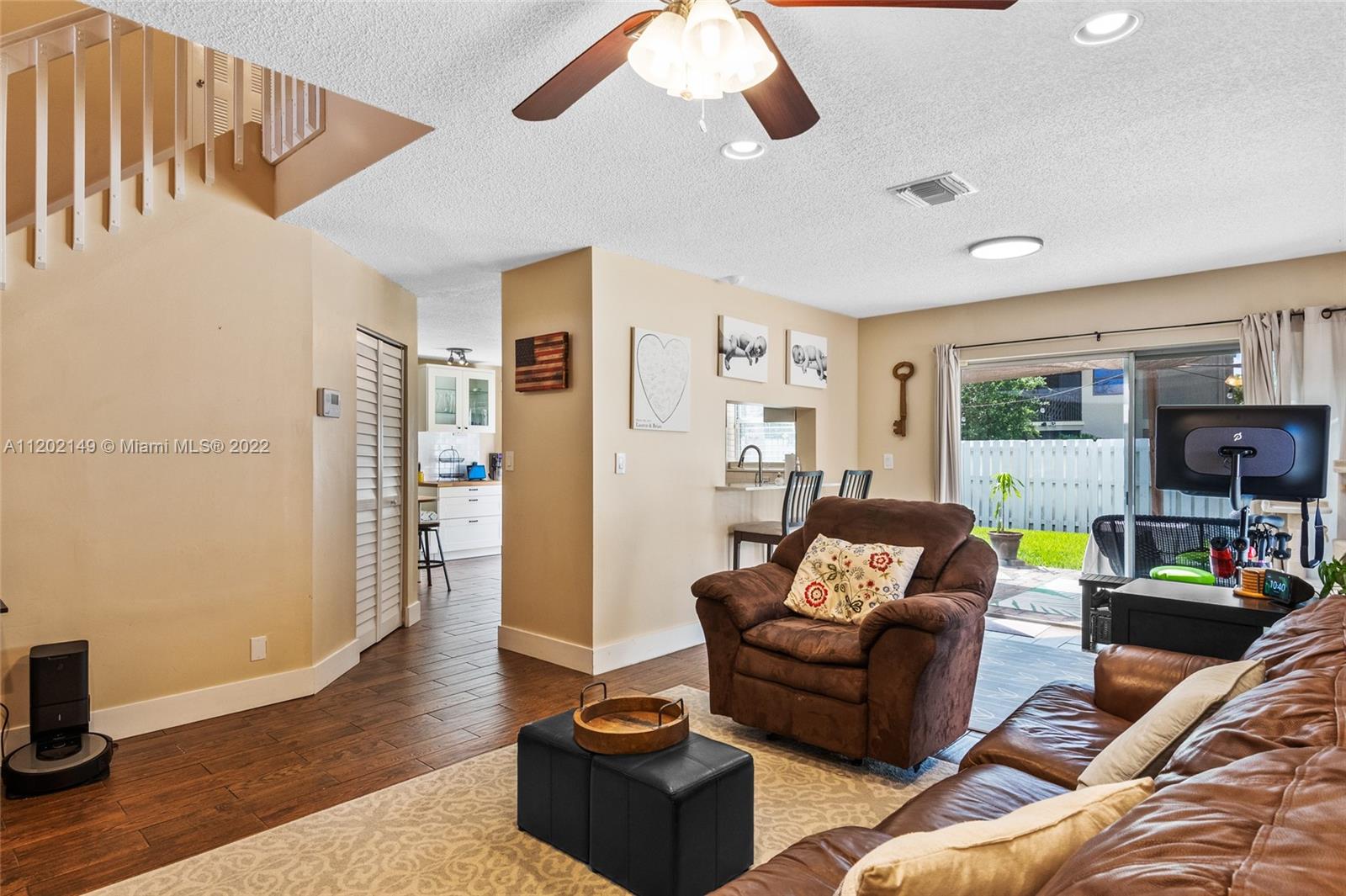 Nice starter home in Quatraine in Central Park, Plantation. This home features: 3 bedrooms, 2 1/2 bathrooms, Eat-in kitchen & family Room. Nice size back yard w/ pavered patio & white wood privacy fence & shed. The garage is a partial space for storage. Updated kitchen w/ white cabinets, built-in breakfast nook table w/storage & stainless-steel appliances.1st floor has wood look porcelain tile & laminate floors upstairs. Bathrooms have been updated. Accordion shutters for 2nd floor & panels for ground floor. Broten garage door. This home qualifies for the windstorm insurance credit. Roof is 2015, Water heater 2021. HOA covers common areas, sprinkler system & mowing the front yard. Own 2 years prior to leasing. Close to parks, shopping & entertainment. Easy access to main roadways