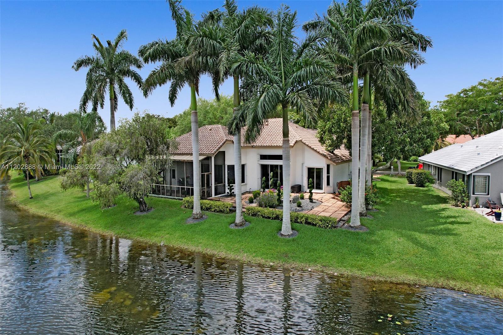 Navigate home to this custom waterfront estate in Brookside. The home has wonderful curb appeal with the half moon travertine driveway, manicured landscaped borders, Sylvester palms and has plenty of parking. This 4 bedroom 3.5 bathroom features a split floor plan, wood flooring in living and dining, open concept kitchen, volume ceilings and has large windows and sliders throughout that maximizes the water views and natural lighting. The large point lot sits in the middle of the channel and the backyard has a large covered patio great for entertaining, open zen area, pond with rock waterfall and numerous large royal palm trees. Great bones with new roof and Rheem water heater installed in 2014. Accordion shutters for opening protection.