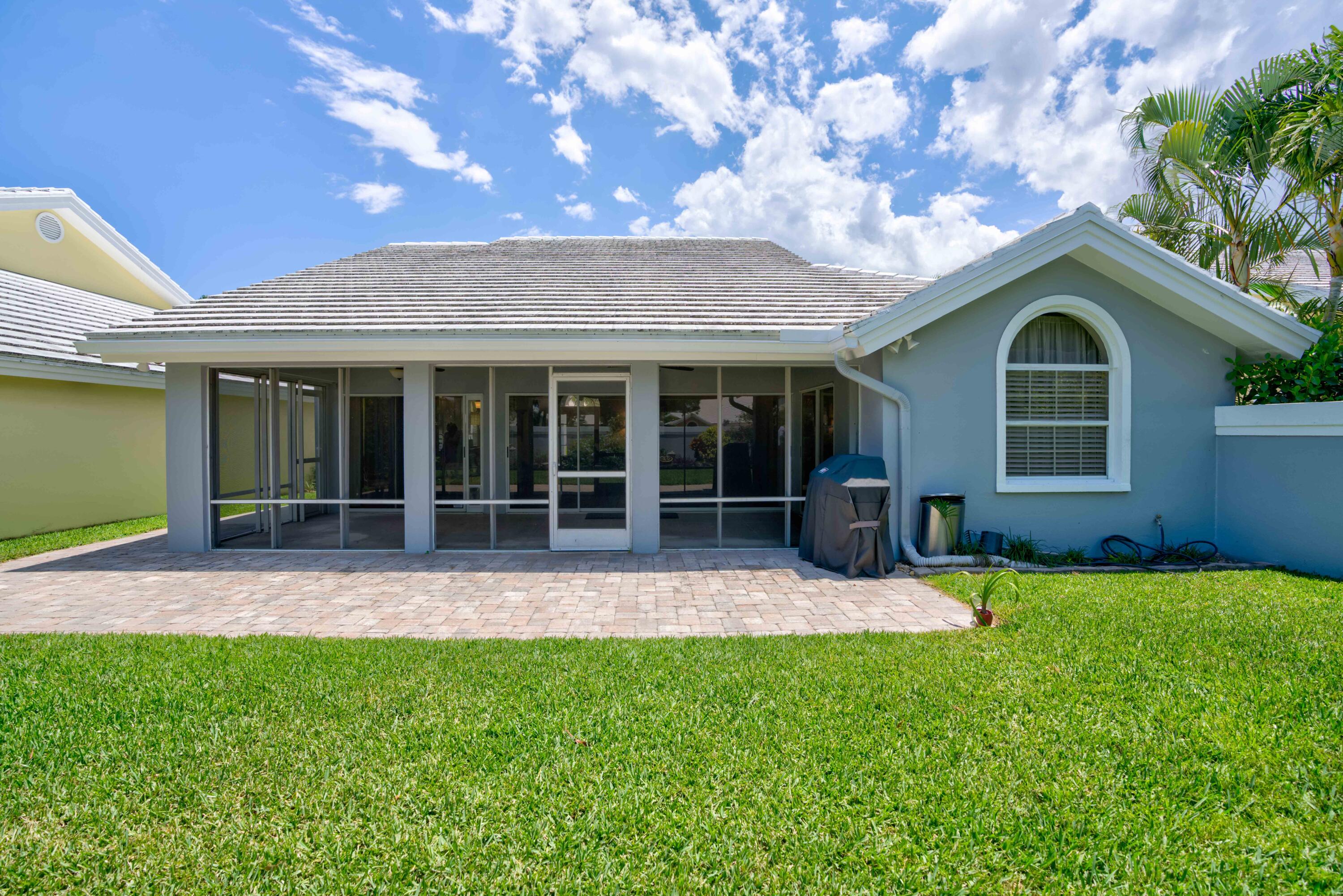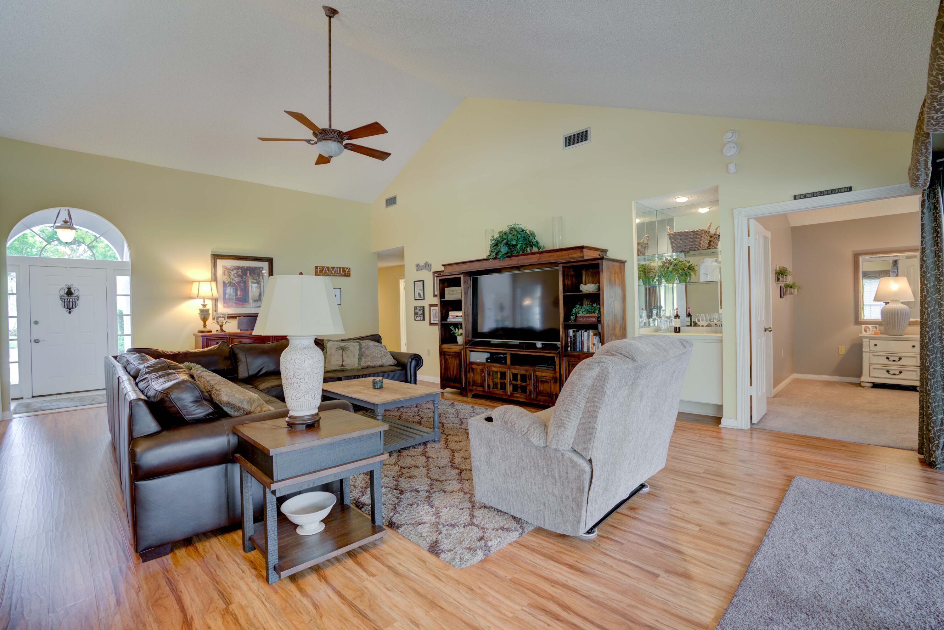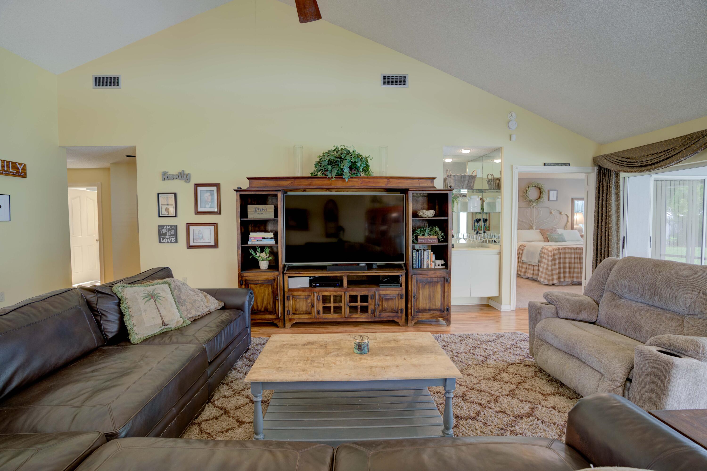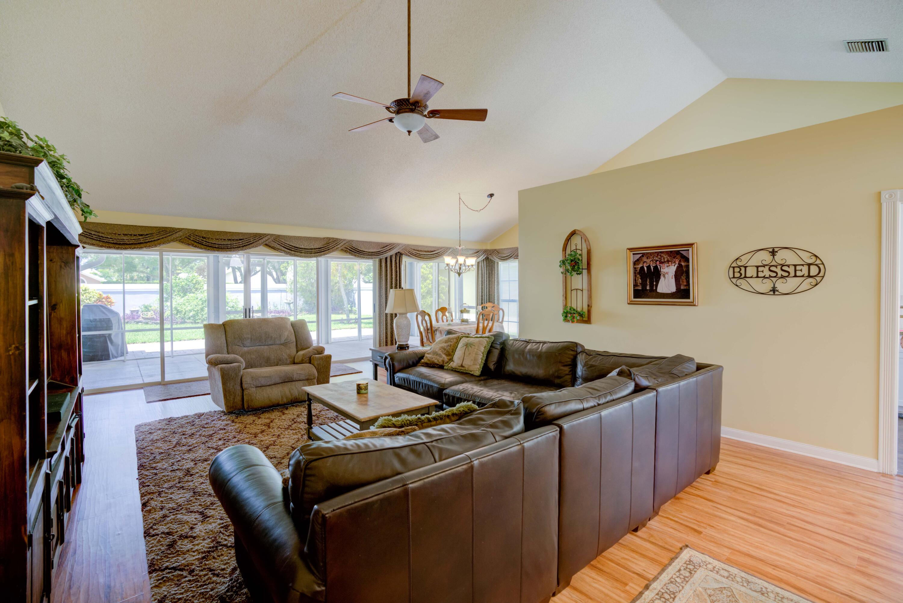 Secluded location off a quiet cul-de-sac in gated community. 26x11 lanai faces north to x-large yard & privacy wall.Updated kitchen & both baths. A/C 5 ton,recently installed. Mostly w/vaulted ceilings, , 2 car garage w/16' wide door, folding staircase to attic. Maintenance fees also include high speed internet/ cable, use of (3 parks & pools, racquet ball, pickle courts, tennis, & fitness trail. Landscaping front & side of homes, common areas & more. Bear Lakes Country Club w/2 18-hole championship golf courses designed by Jack Nicklaus. Social & golf memberships available. Minutes to PBIA/I-95, discount mall, Whole Foods & restaurants. Beaches approximately 20 minutes away.