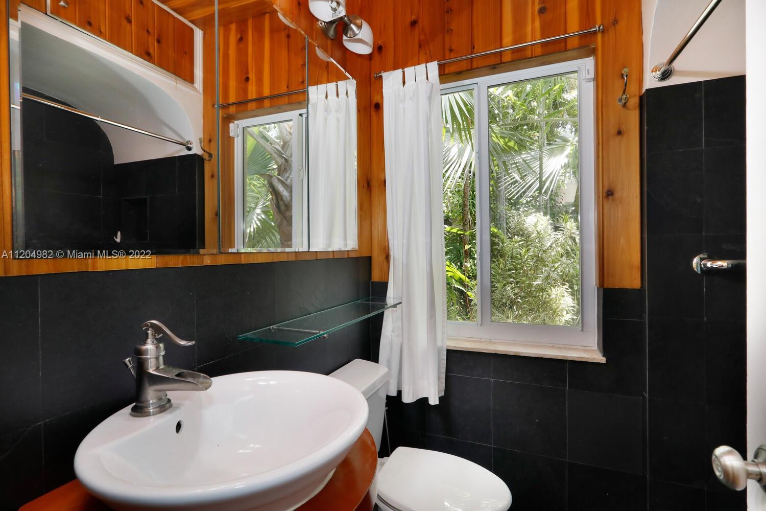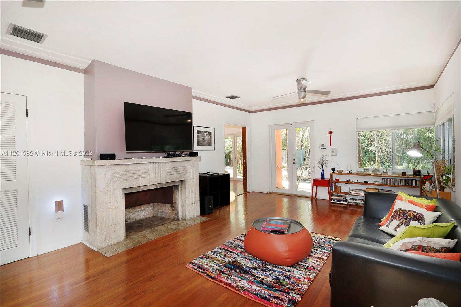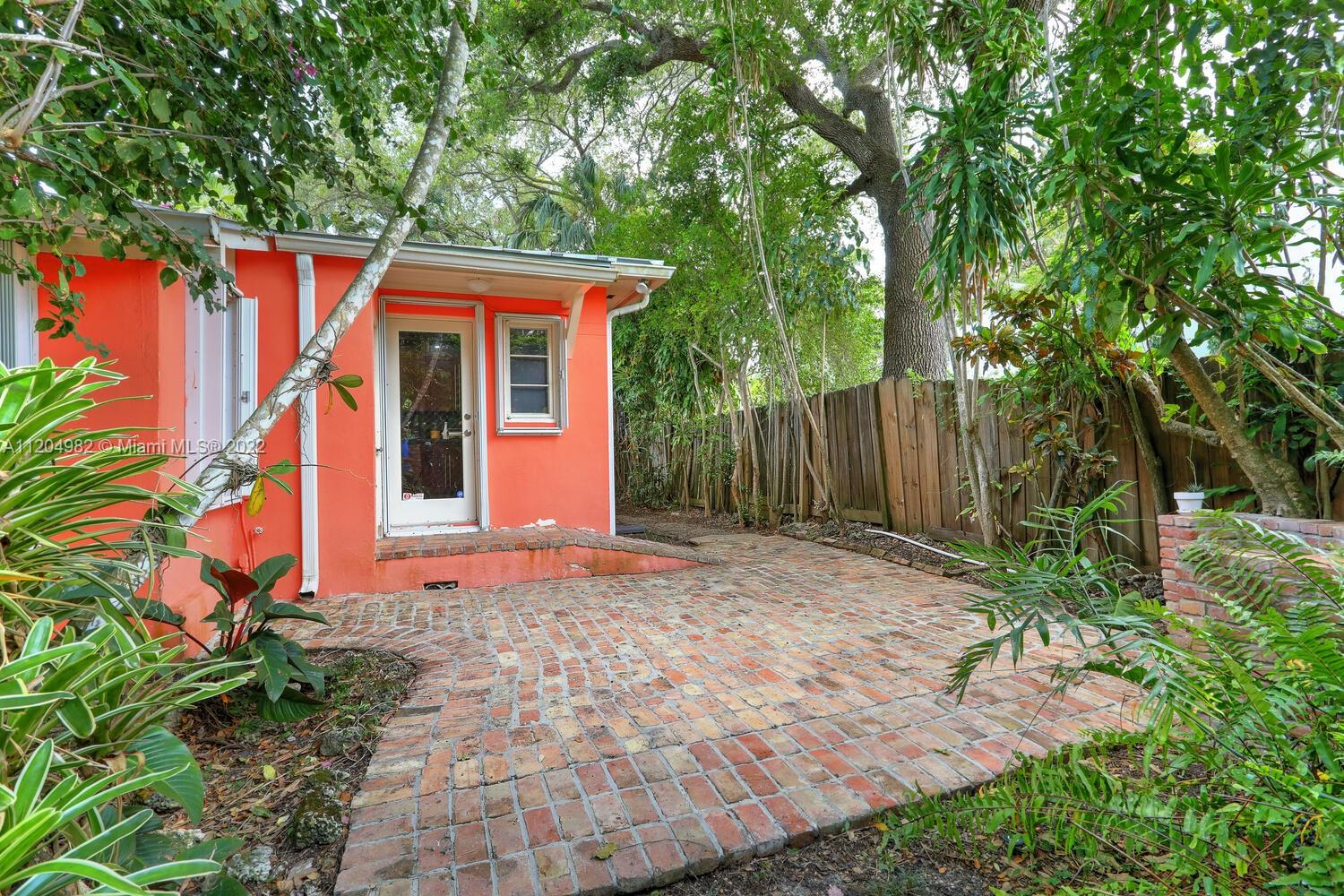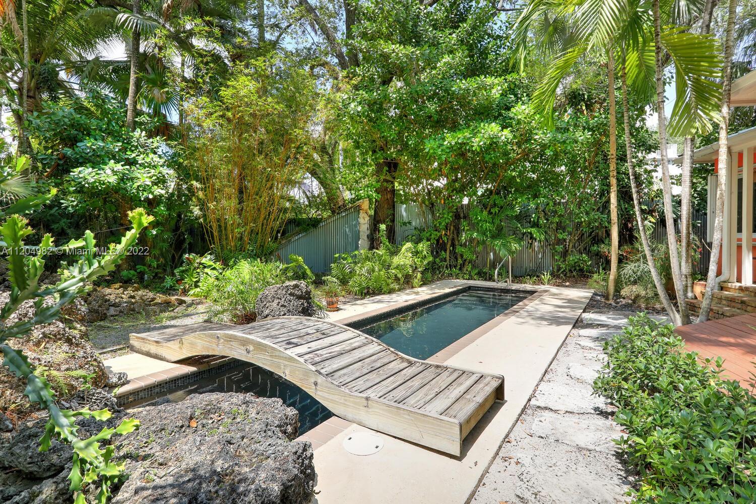 Enchanting, gated cottage set behind a high privacy fence and surrounded by a lush tropical garden featuring native palms, winding pathways & a magical pool with footbridge. French doors open to light-filled living spaces with beautiful wood flooring & stone fireplace. Large updated kitchen w/ wood cabinetry, slate flooring & stainless steel appliances. 2BR/1BA + living, dining, office & sunroom w/walls of glass. Enjoy outdoor living & entertaining on the tree-canopied wood deck & bricked patio. (10,800 SF lot). Additional features of the home include: detached garage structure currently used for storage, a generator & accordion shutters for all windows/doors. Walk or bike to the Grove village center’s galleries, boutiques, cafes and bayfront parks & marinas.