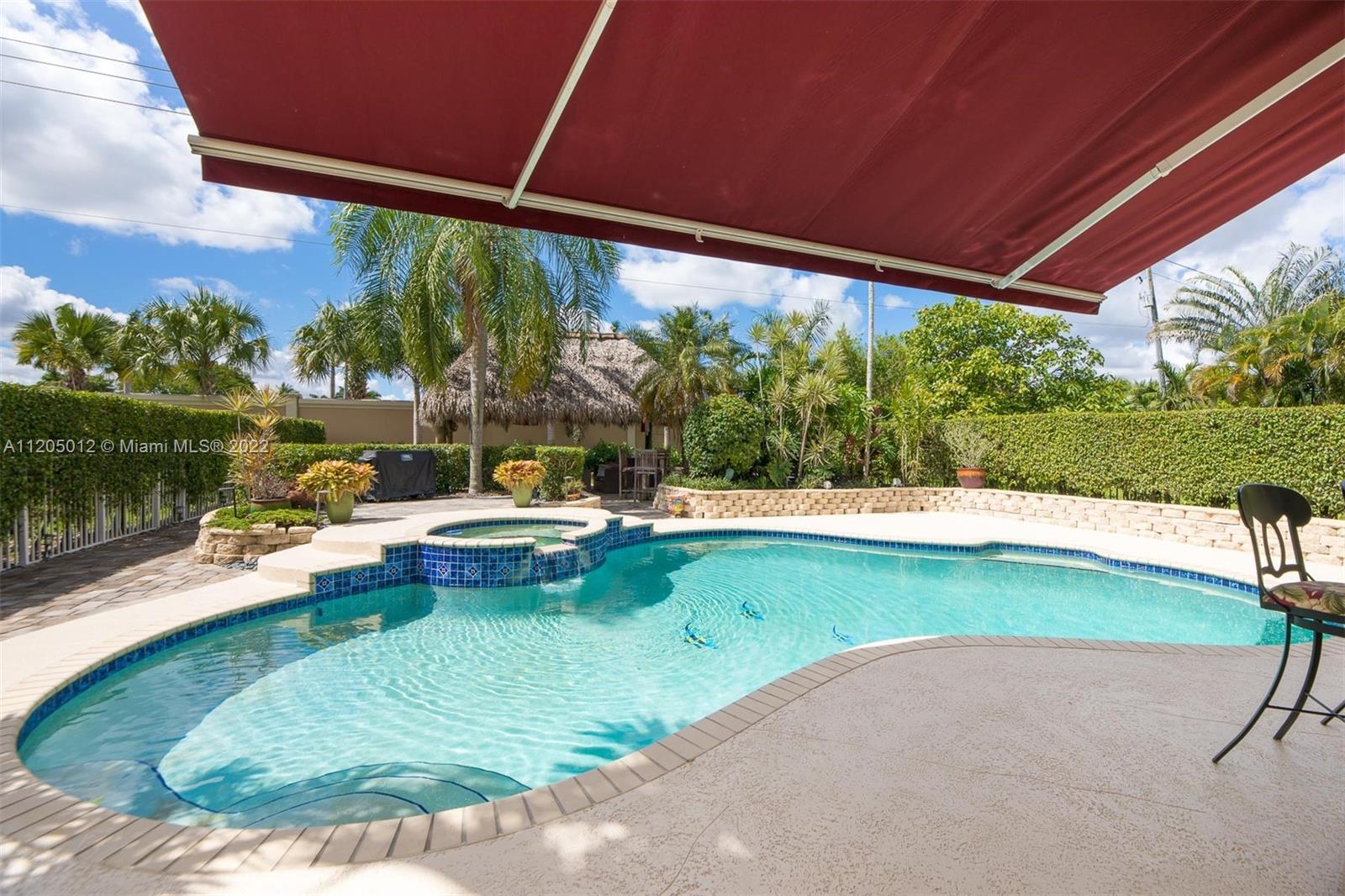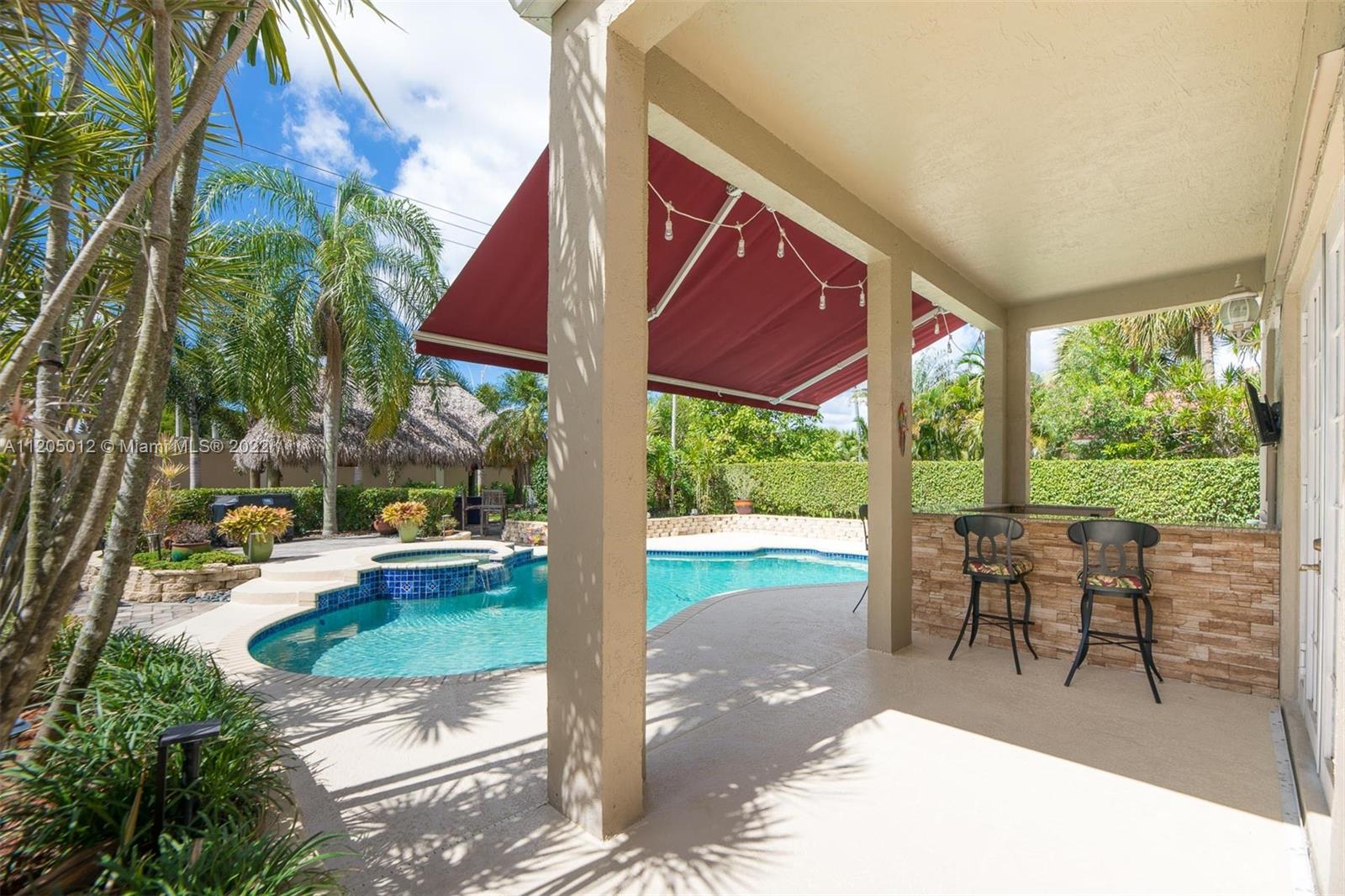 Stunning Entertainer's Paradise! Situated in prestigious and much sought after Grand Palms Golf Resort. First time ever on the market, this beautiful home features 4 spacious bedrooms and 3 full baths, updated kitchen w granite counters, wood cabinetry and SS appliances. Large family room, formal living room, formal dining room with very high ceilings, laundry room and first floor cabana bath. NEW ROOF! Spectacular outdoors with built-in bar, outstanding landscaping, large pool and jacuzzi spa, 12X20 Tikki Hut, and oversized balcony coming off the main bedroom to overlook your fabulous lush and inviting backyard space. A+ school district, Whole Foods, Publix and Costco nearby and 25 minutes from FLL.