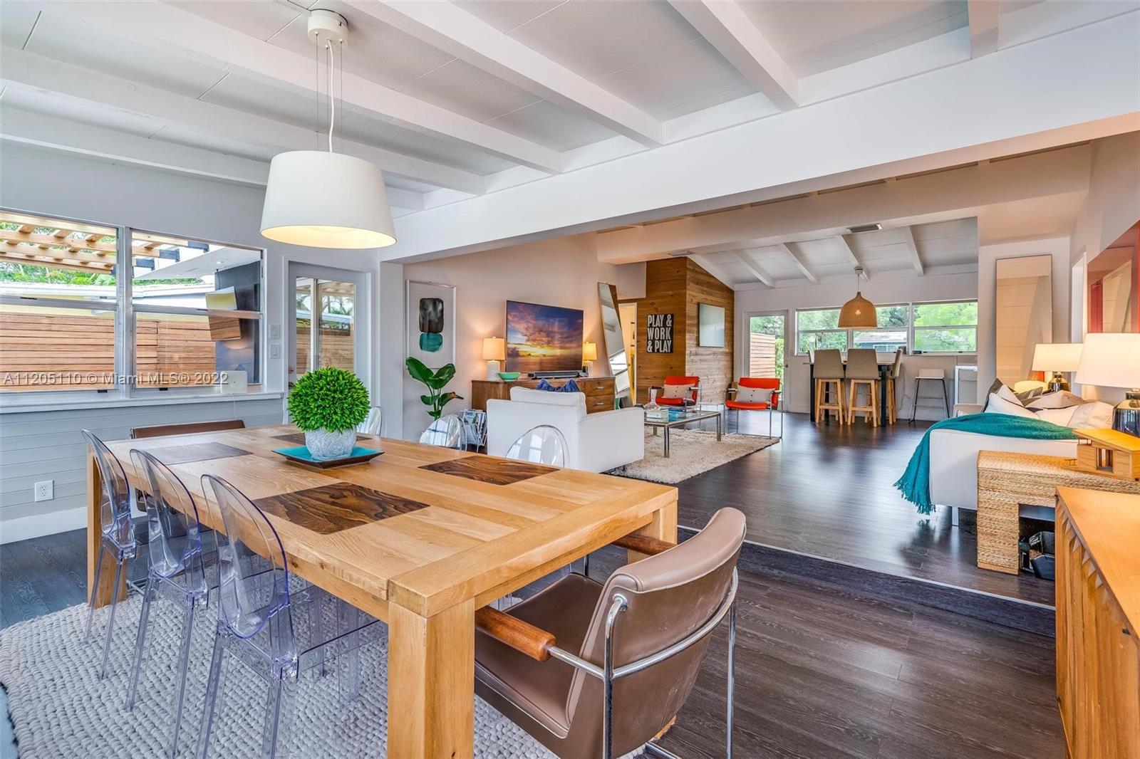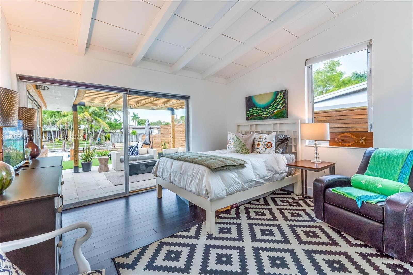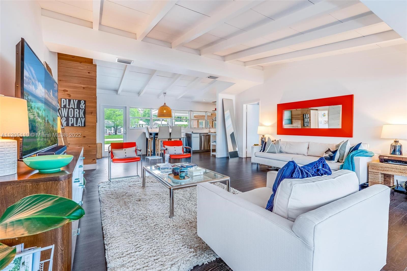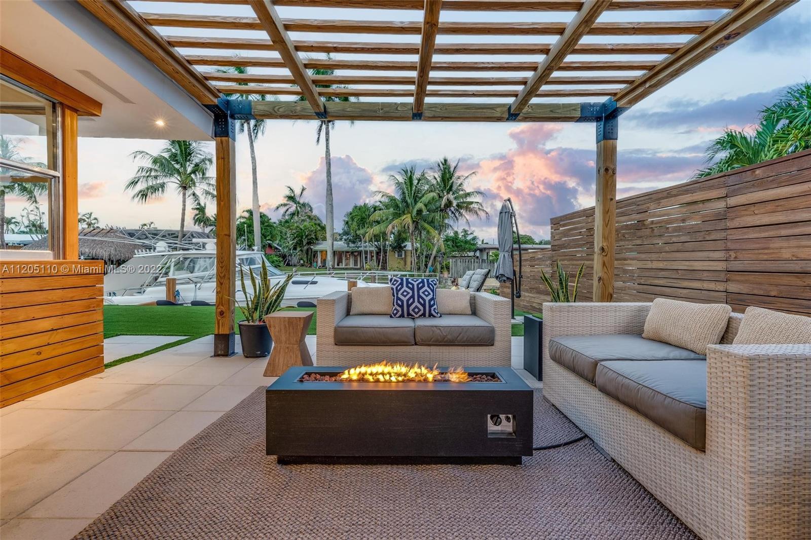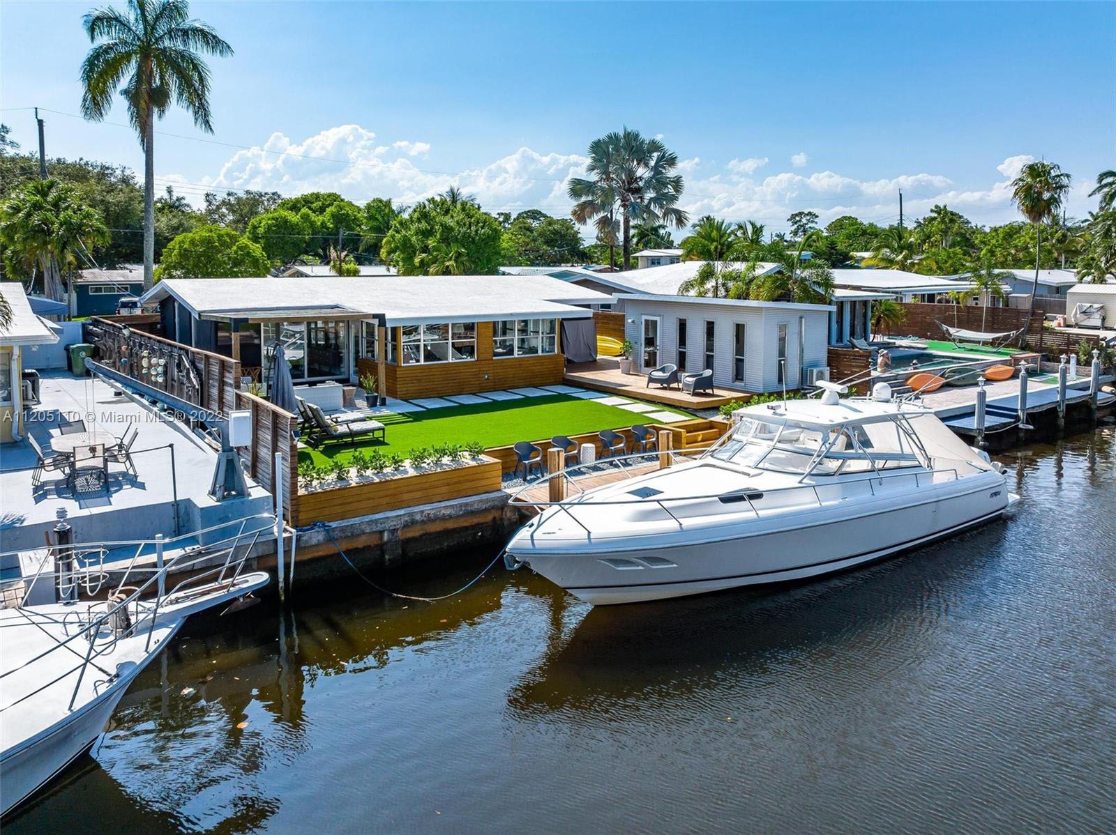 Mid-Century Modern Turnkey Stunner! High-End Waterfront remodel with an open concept layout and vaulted ceilings on 60' of deep water ocean access and no-fixed bridges. Free-standing modern bonus space office/guest structure overlooking the canal that can be a live/work at home space or a 4th guest bedroom. Updated Kitchen and Bathrooms, new electrical and plumbing, impact windows and doors. Extended outdoor gathering space around a fire pit and covered 14' x 14' pergola. Outdoor shower, artificial turf and pavers throughout the entire private backyard. This amazing modern California vibe boating home is in the hidden gem of the Lauderdale Isles neighborhood. Only 3 miles from Las Olas, downtown, beach and FLL International Airport.