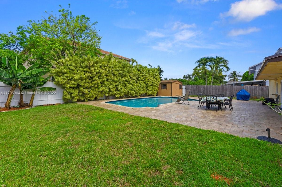 Cooper City- NO HOA! Beautiful 1 story, 4 bed 2 bath pool home in Cooper City. Brand new roof, impact windows and Maple hardwood floors. Travertine pavers surround the spectacular salt system pool. The home also features a fenced private yard with 4 banana trees and a permitted shed ready for work. Possibly the best part is the 35x12 pre-permitted addition with slab and footers already complete. A-rated schools and luxury homes surround this sought after Cooper City community and school bus pick up is just a couple houses away. Kitchen chandelier is excluded from the sale.