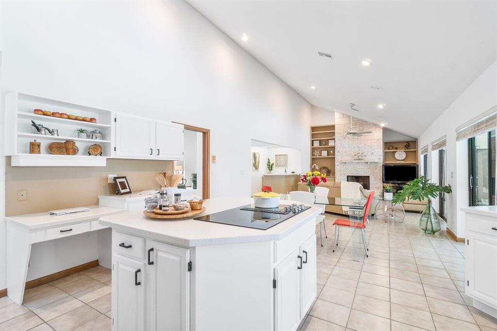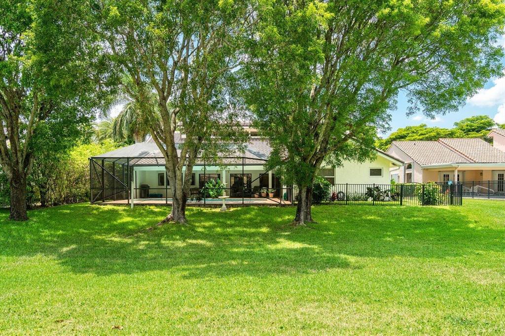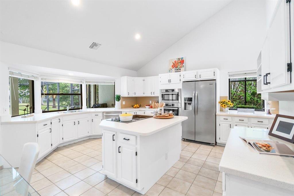 Prime location in sought after Parkside on a park lot with lake views. Parkside now zoned for new Addison Mizner K-8 elementary district. Immaculate home - new roof 2020. Also 2020, new primary bathroom and newly redone island kitchen. Stainless appliances including Miele wall oven and combo micro/convection oven, lots of cabinets plus a pantry and kitchen desk. Family room has coral fireplace surrounded by bookshelves and a wet bar with wine refrigerator. Living room is light and bright with dramatic vaulted ceiling. Primary bedroom has dual closets leading into the new white bathroom. Bedrooms 2,3 and 4 have built in closet systems. Screened pool with large covered patio area looks out to greenspace and lake. One side of yard is fenced for pets.For more details click