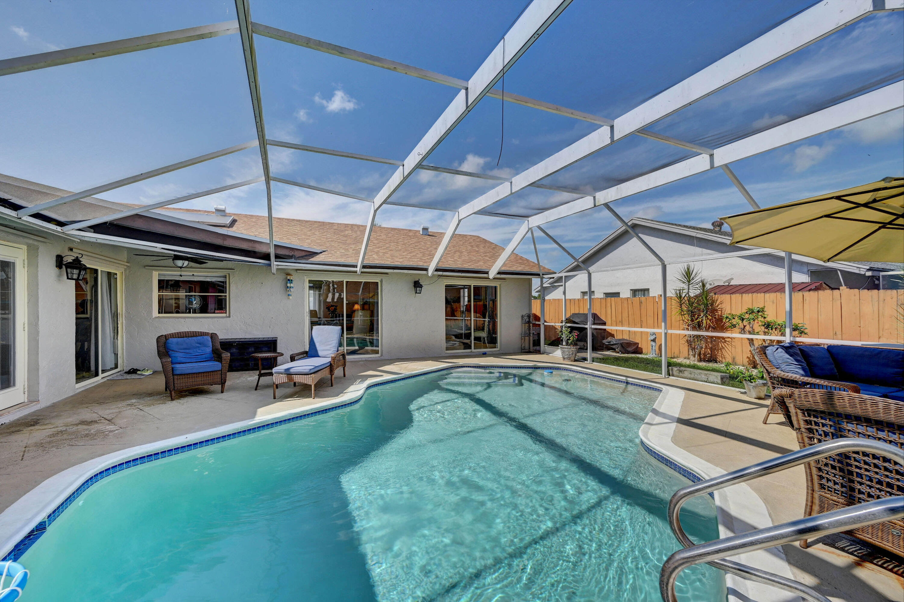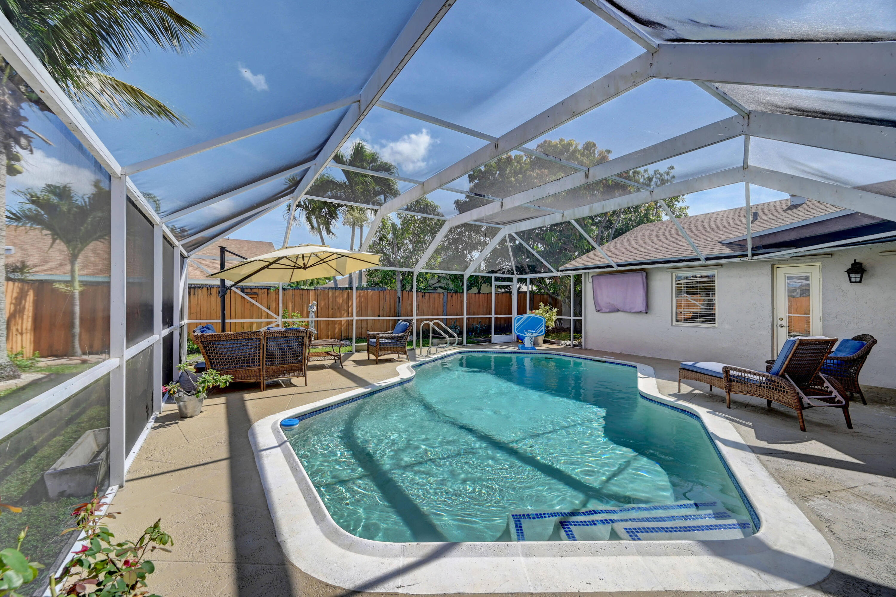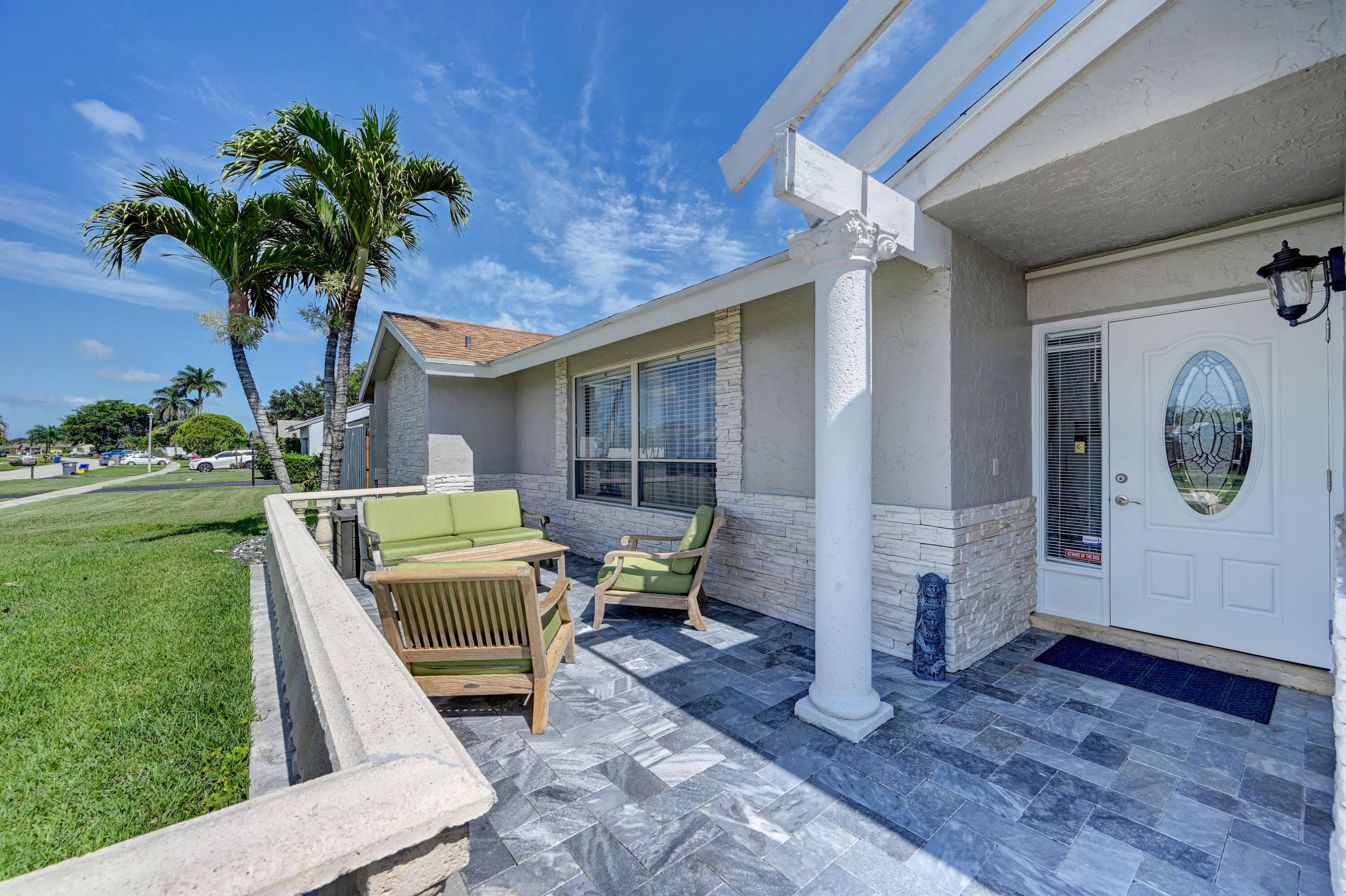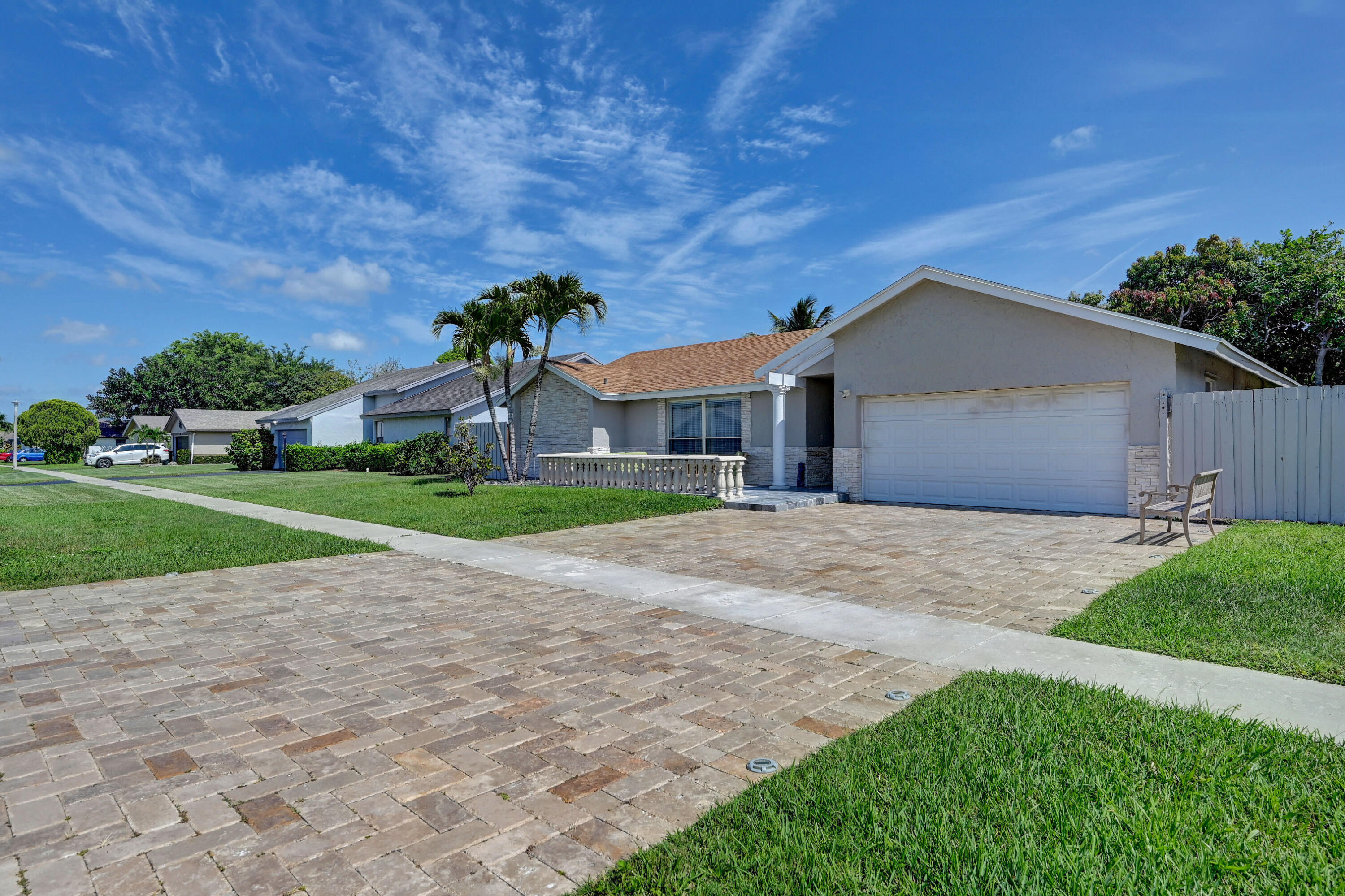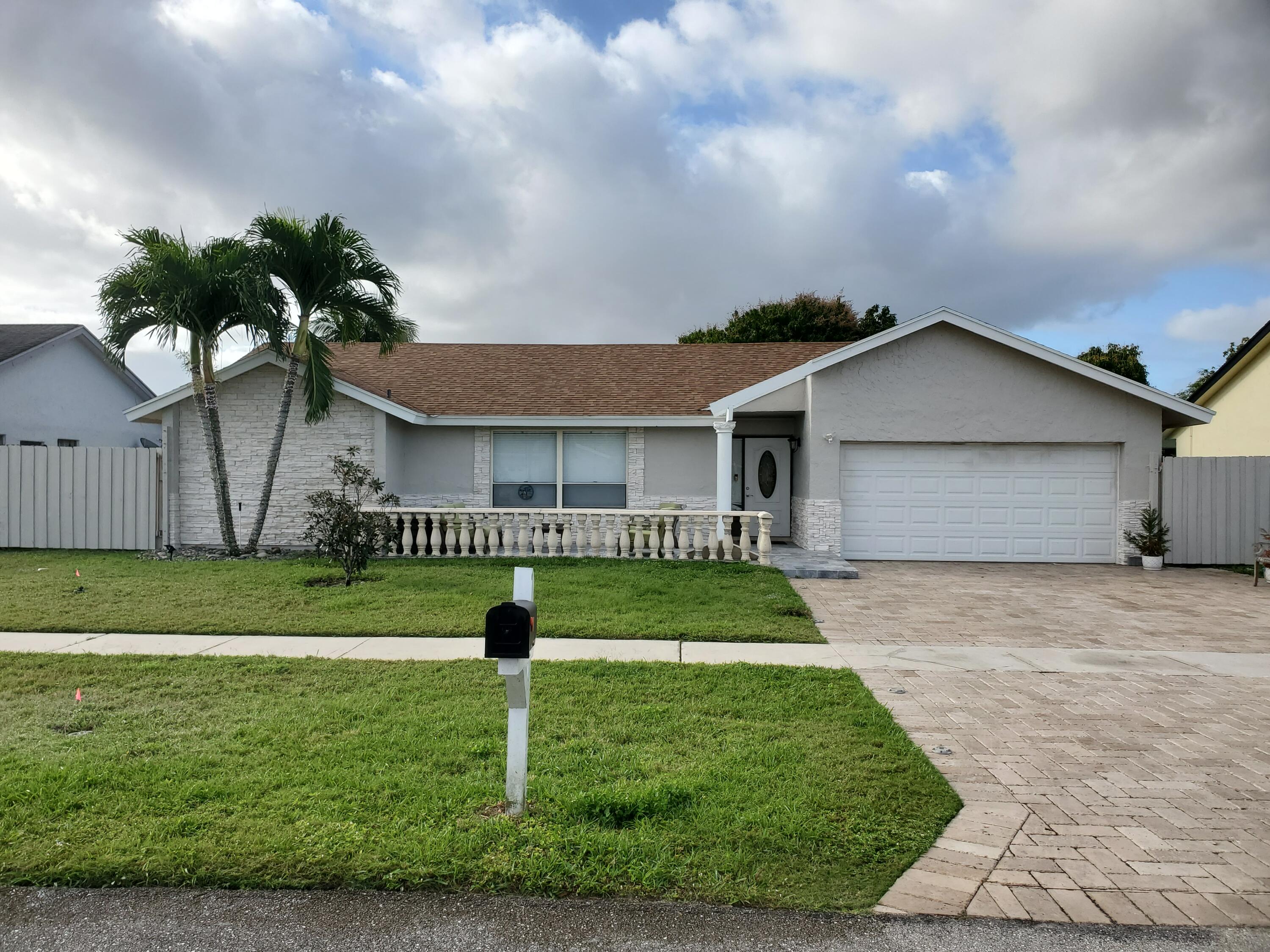 Open and airy spacious home with breathtaking stone work. 4 bedroom and 2 bath with pool in one of Boca's great neighborhoods. Largest model with over 1900 sq feet! Kitchen has granite countertops and stainless appliances. White marble floors in main living area. Vaulted ceilings in living and dining room newly Diamond Brite pool. Roof from 2018. Solar water heater. New electric panel garage with work area. Split bedrooms 3 on one side near updated cabana bathroom Expansive master suite with large walk-in built out closet.Newly updated bathroom and dressing area with granite tops. Large glass enclosed shower.Plenty of space for storage and gates to allow large recreational vehicles to be parked. Driveway widened all travertine. Large great marble deck rock surface