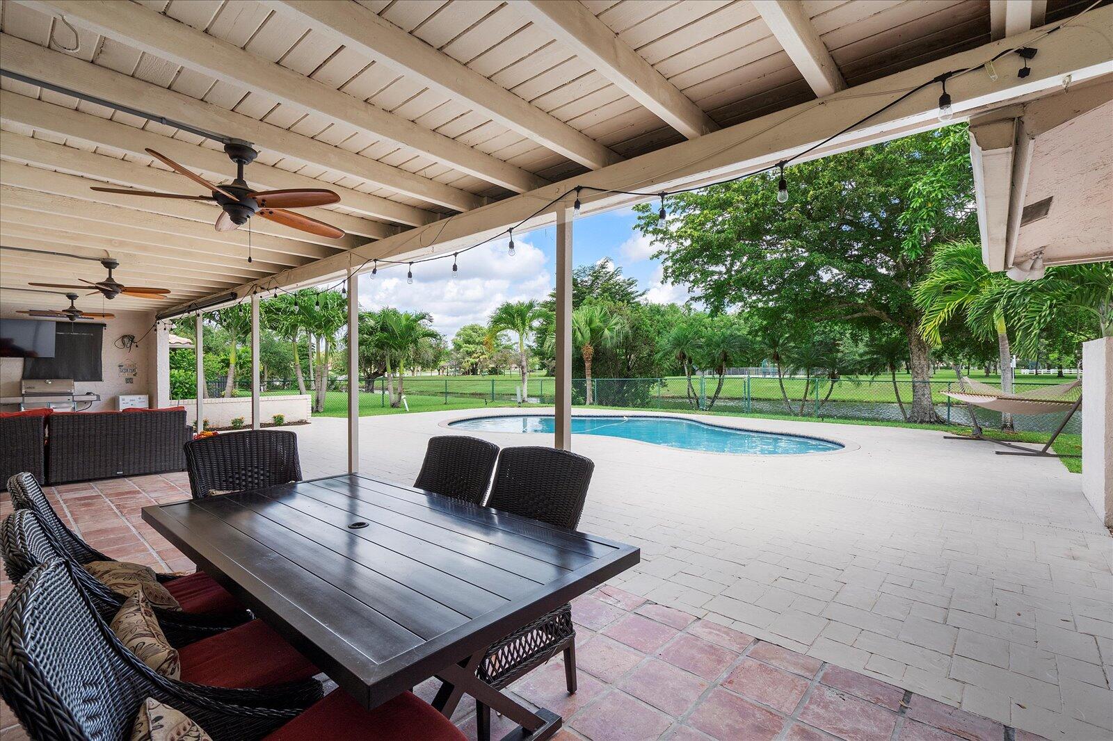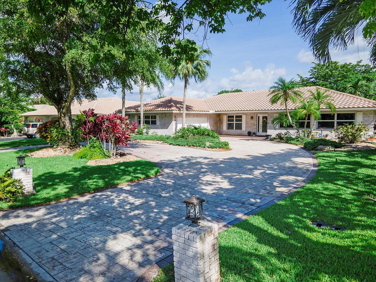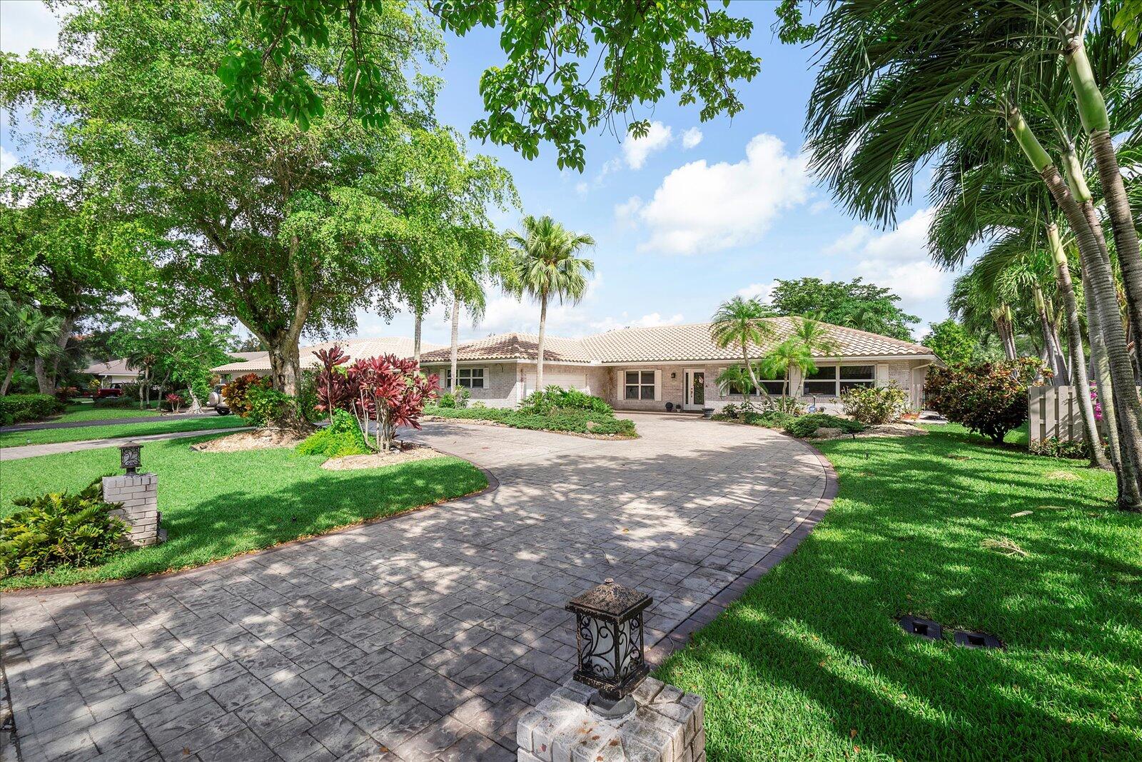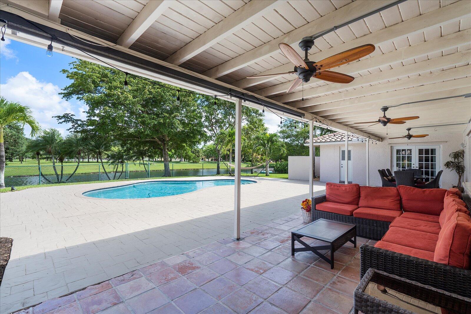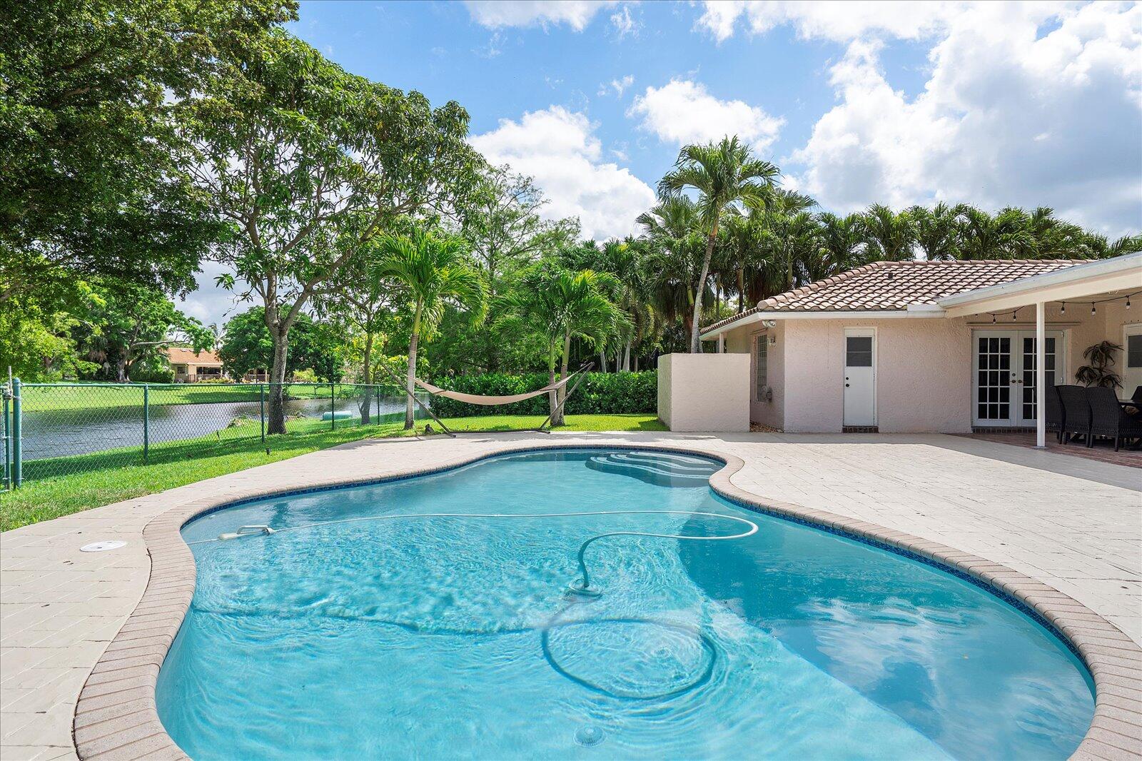 This Coral Springs ranch style 4 bedroom 2.5 bath home is located in the highly desirable, NO HOA community of Oak Wood. 2013 Roof, A/c's 2017 and 2019(with new ductwork in 2019), 2017 Water Heaters, 2022 Pool Resurfacing, Impact Glass and Impact Garage Door! The property boasts a massive .31 acre lot with resort style pool, huge patio area and fenced backyard. The water view from the covered porch is of an adjoining community park, giving you the privacy of no rear neighbors. As you pull up, you immediately notice the gigantic stamped concrete driveway, which provides tons of parking. As you enter the home, you see the vaulted ceilings in the living areas, ample natural light, stacked bedroom floorplan, multiple French doors and tile flooring throughout. Featuring an updated kitchen