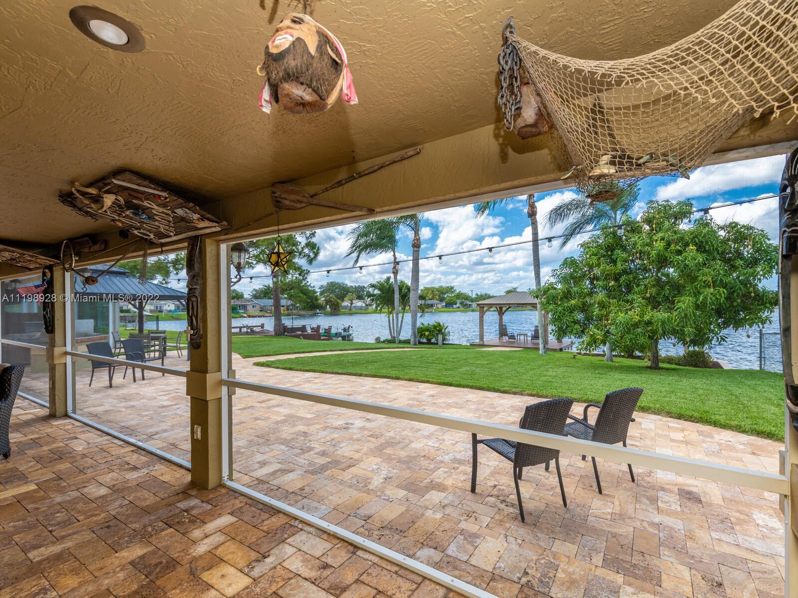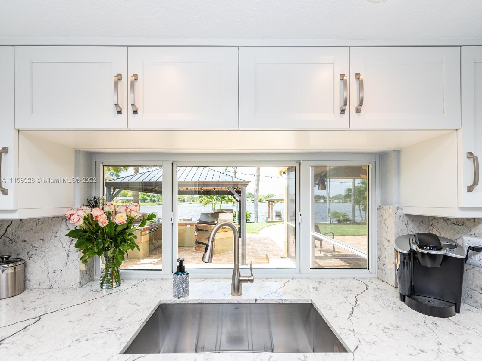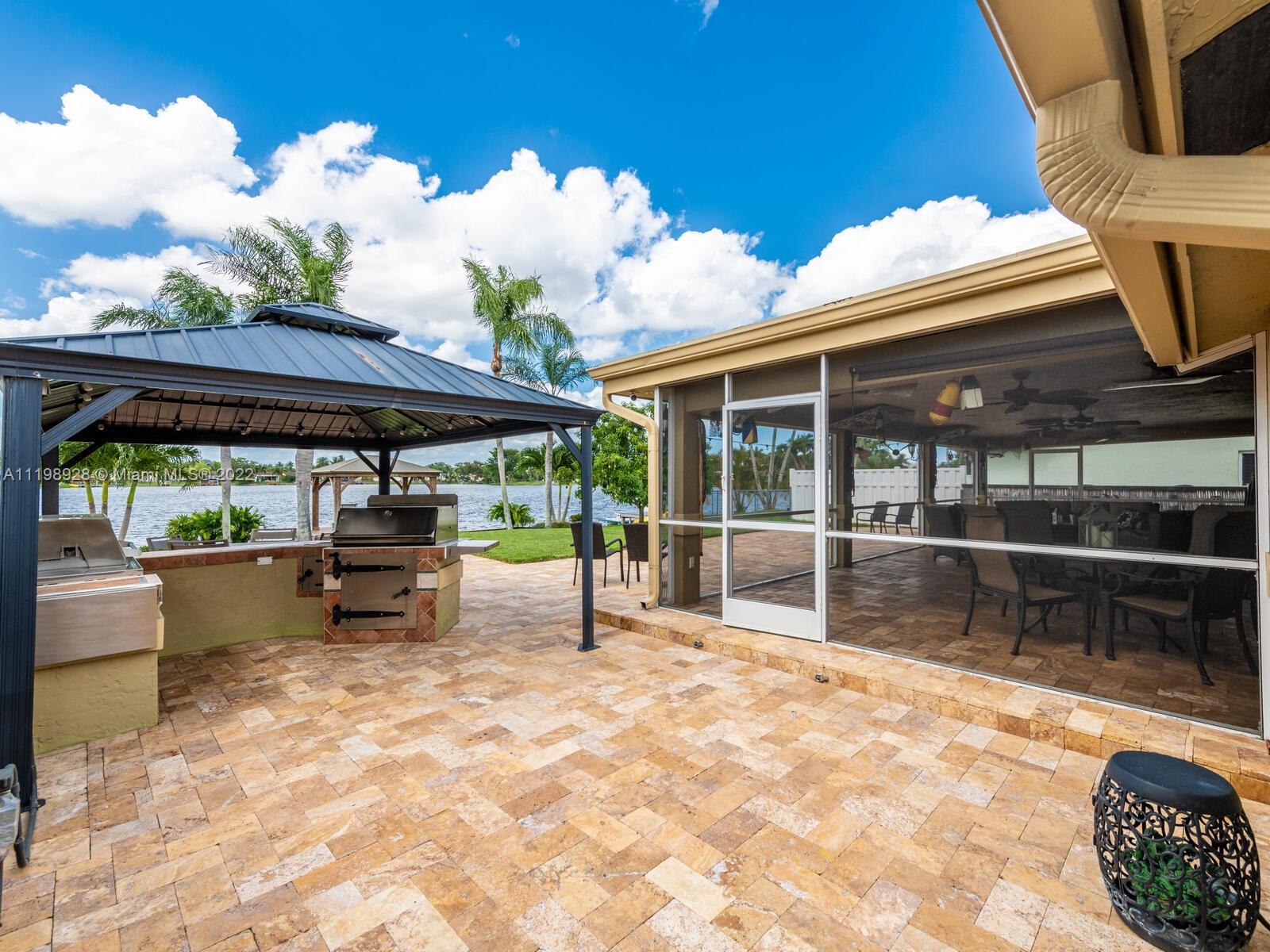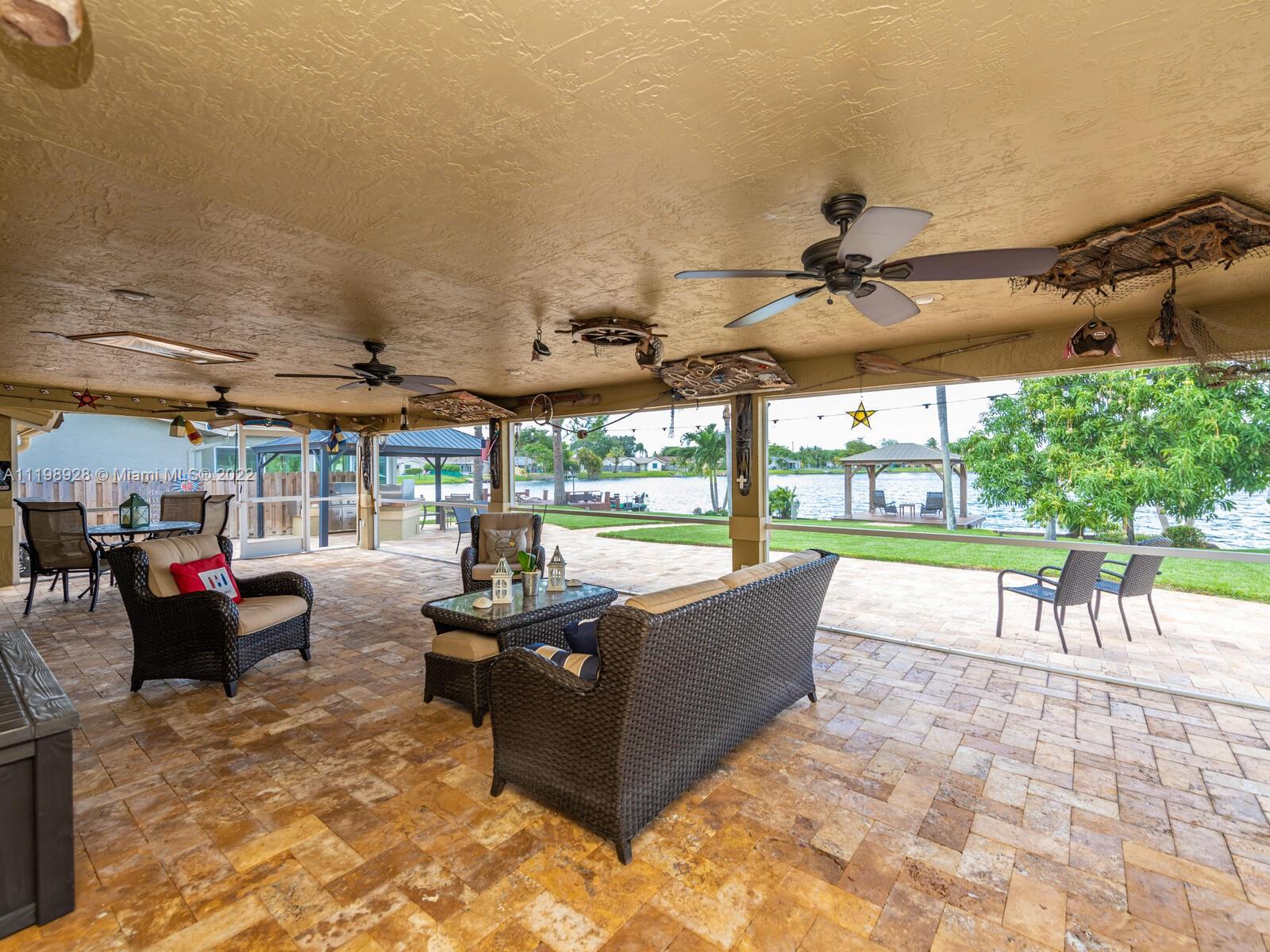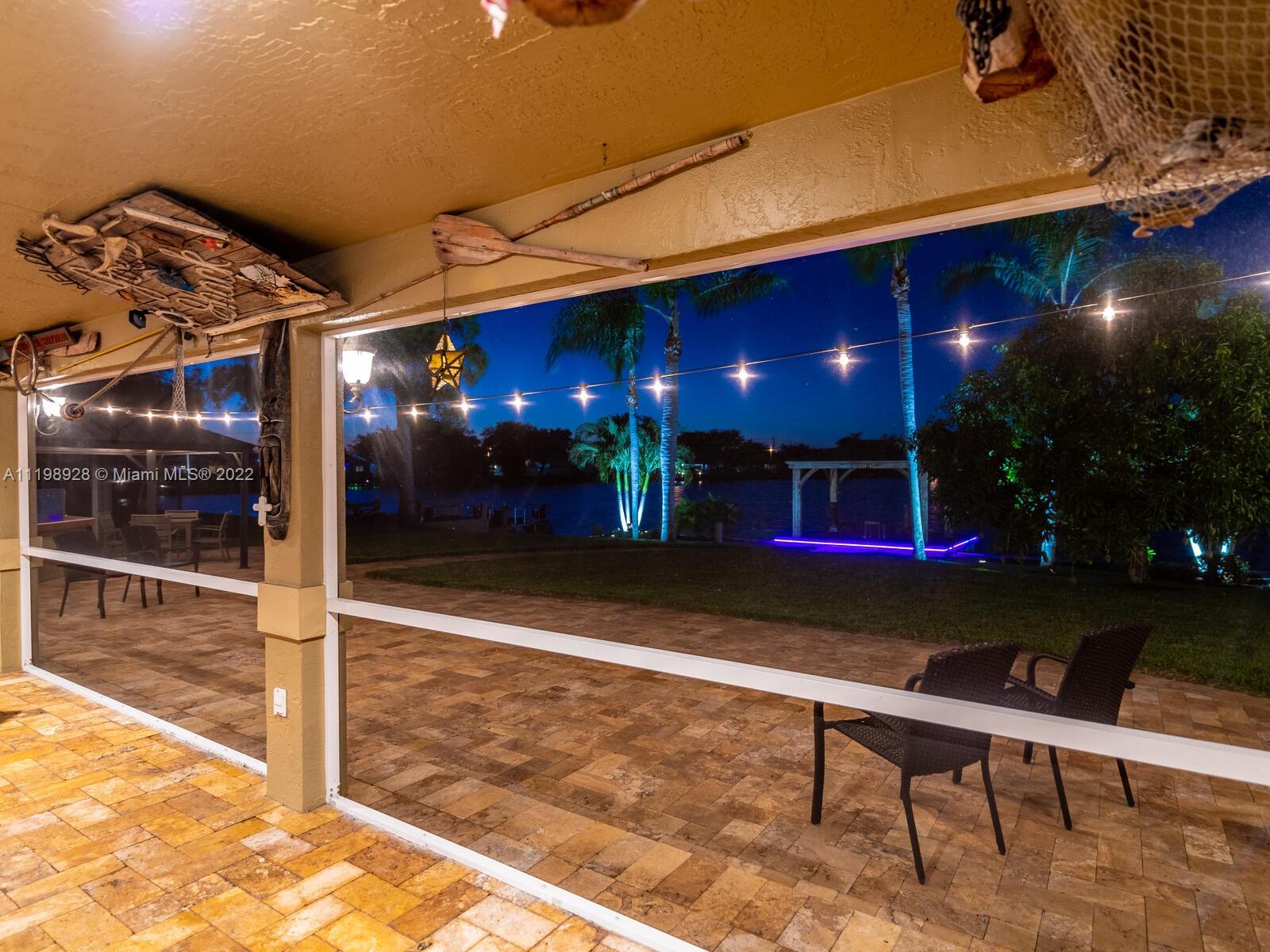 Indulgent tropical paradise from the moment you step out of the back doors leading to an enclosed & covered 20x80' travertine patio, just outside that you will find the outdoor kitchen & shed. The yard has a mature mango tree, sprawling palms, & massive lake view with 80' water frontage. Extended yard leads to a custom dock with pavilion & sunshade. The home has been immaculately maintained & extensively updated with all impact windows and doors (including the garage) & a newly upgraded kitchen, including spotless Samsung appliances & a/c unit all about a year and 1/2 new. You'll enjoy the customs closets, updated guest bath, & high end laminate flooring in most of the main area. You can see the pride in ownership reflected throughout this highly sought after lakefront home in Sunrise!!!