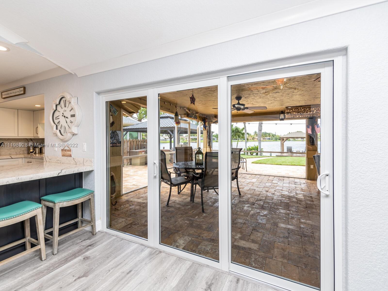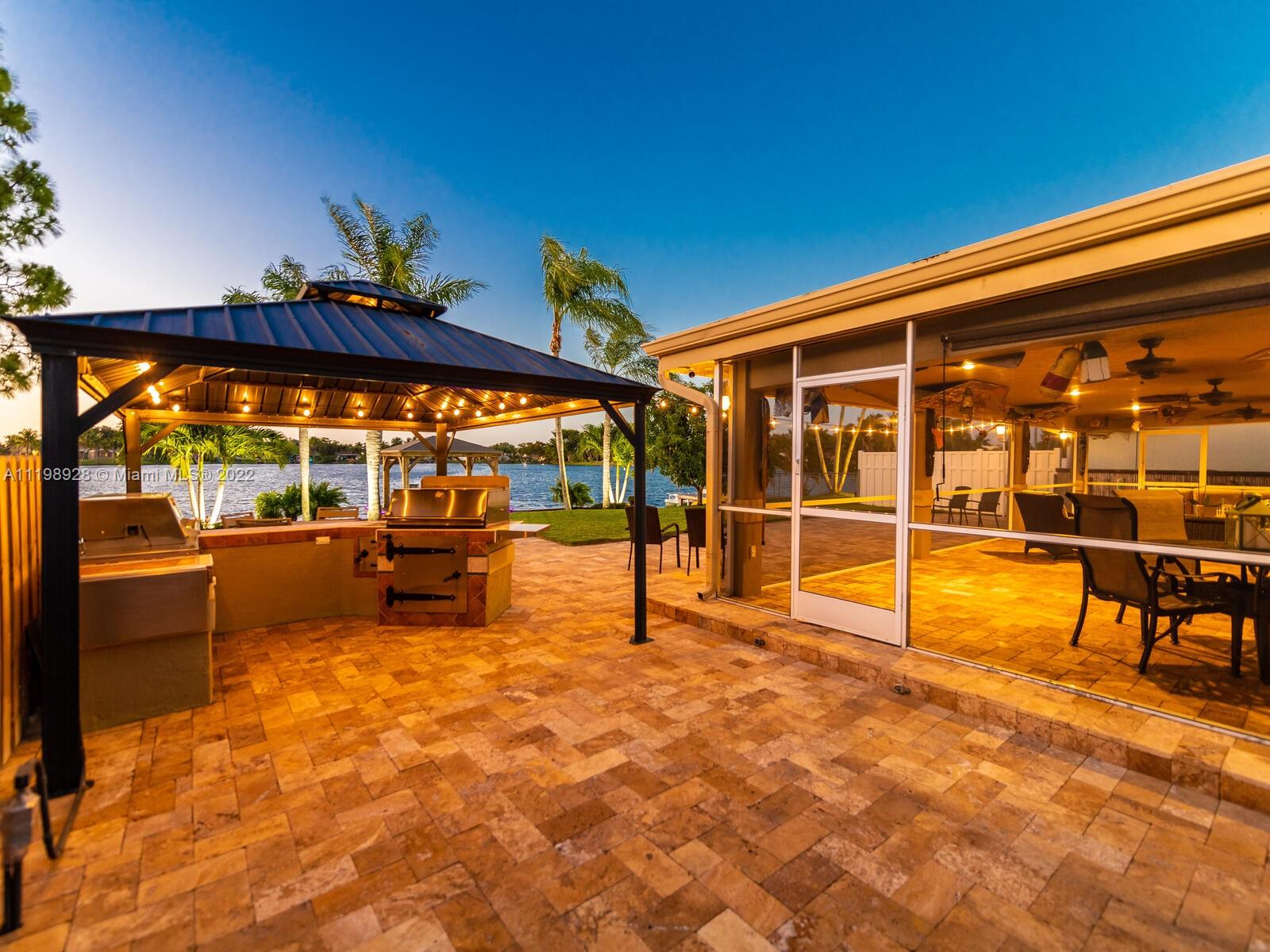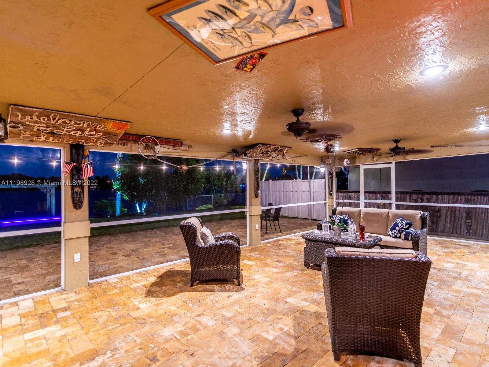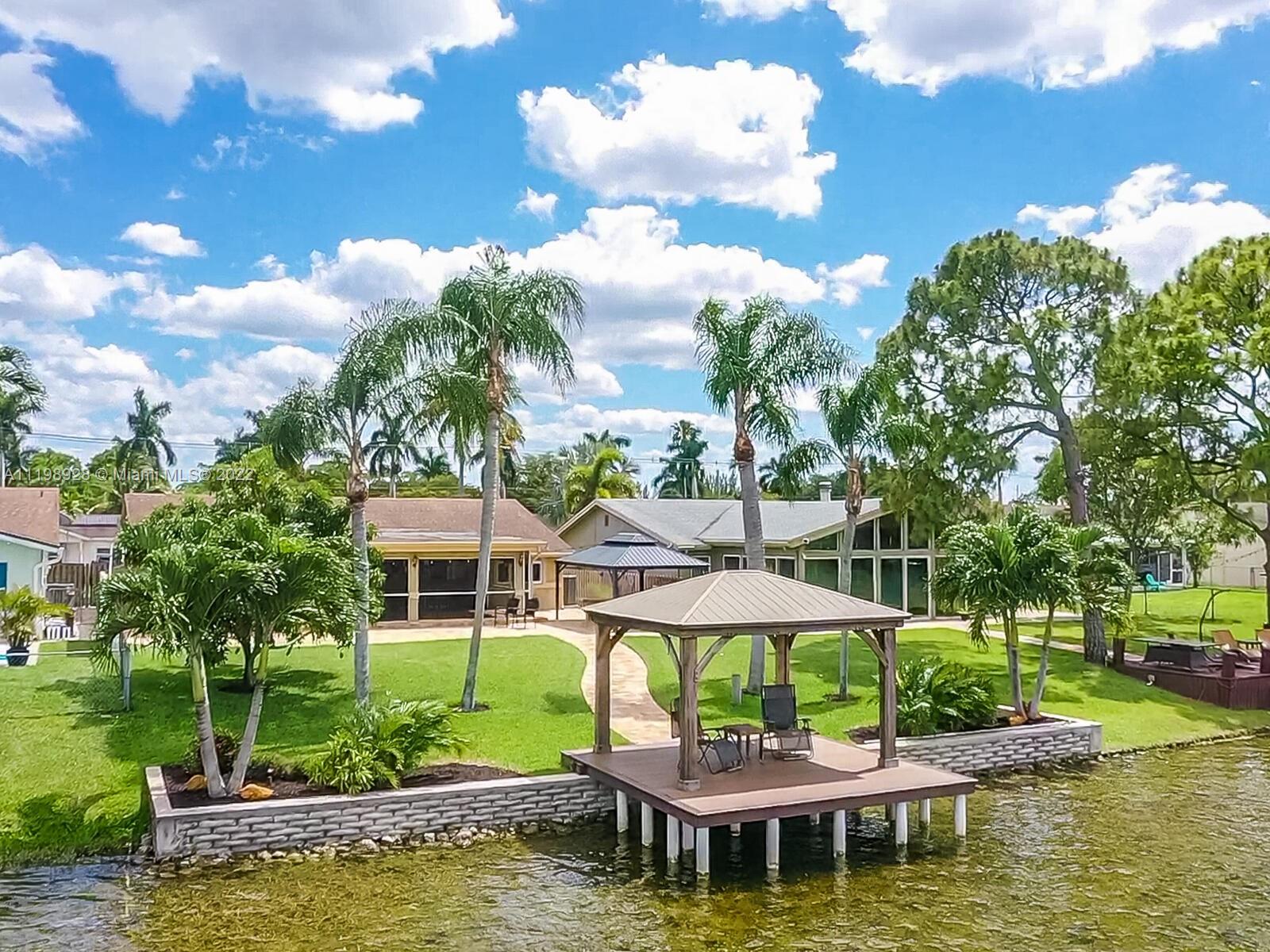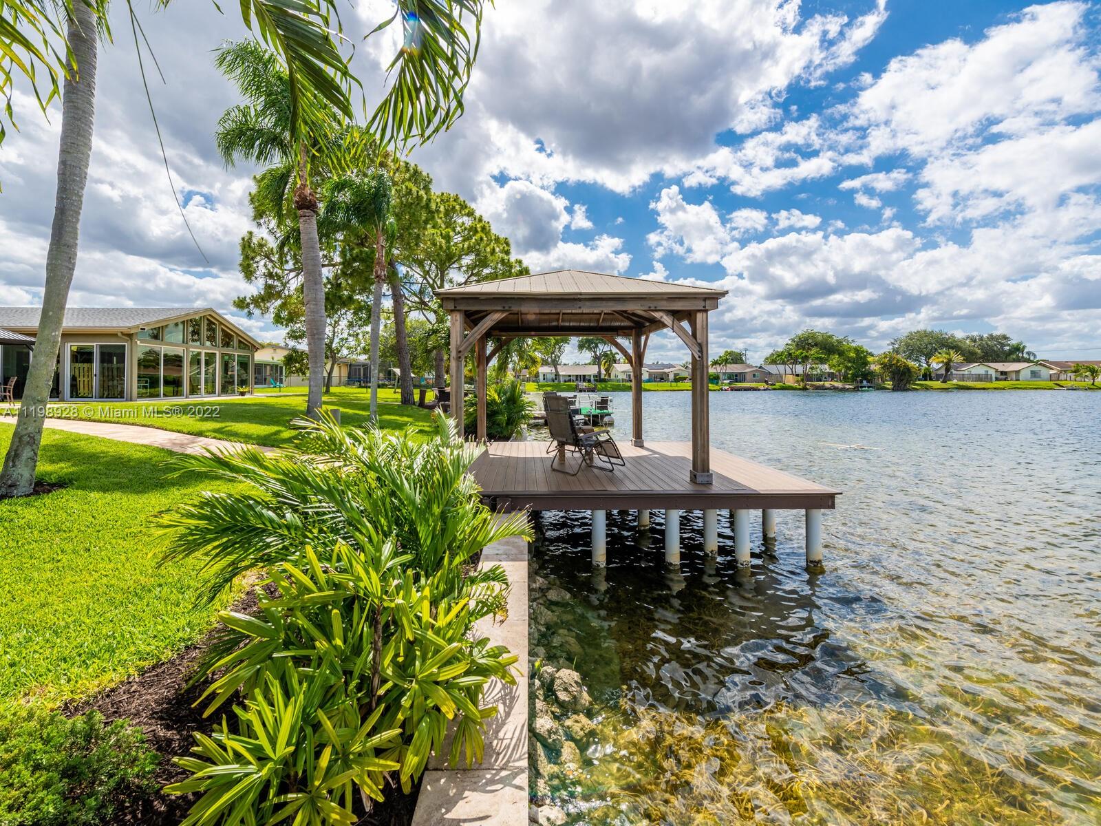 Indulgent tropical paradise from the moment you step out of the back doors leading to an enclosed & covered 20x80' travertine patio, just outside that you will find the outdoor kitchen & shed. The yard has a mature mango tree, sprawling palms, & massive lake view with 80' water frontage. Extended yard leads to a custom dock with pavilion & sunshade. The home has been immaculately maintained & extensively updated with all impact windows and doors (including the garage) & a newly upgraded kitchen, including spotless Samsung appliances & a/c unit all about a year and 1/2 new. You'll enjoy the customs closets, updated guest bath, & high end laminate flooring in most of the main area. You can see the pride in ownership reflected throughout this highly sought after lakefront home in Sunrise!!!