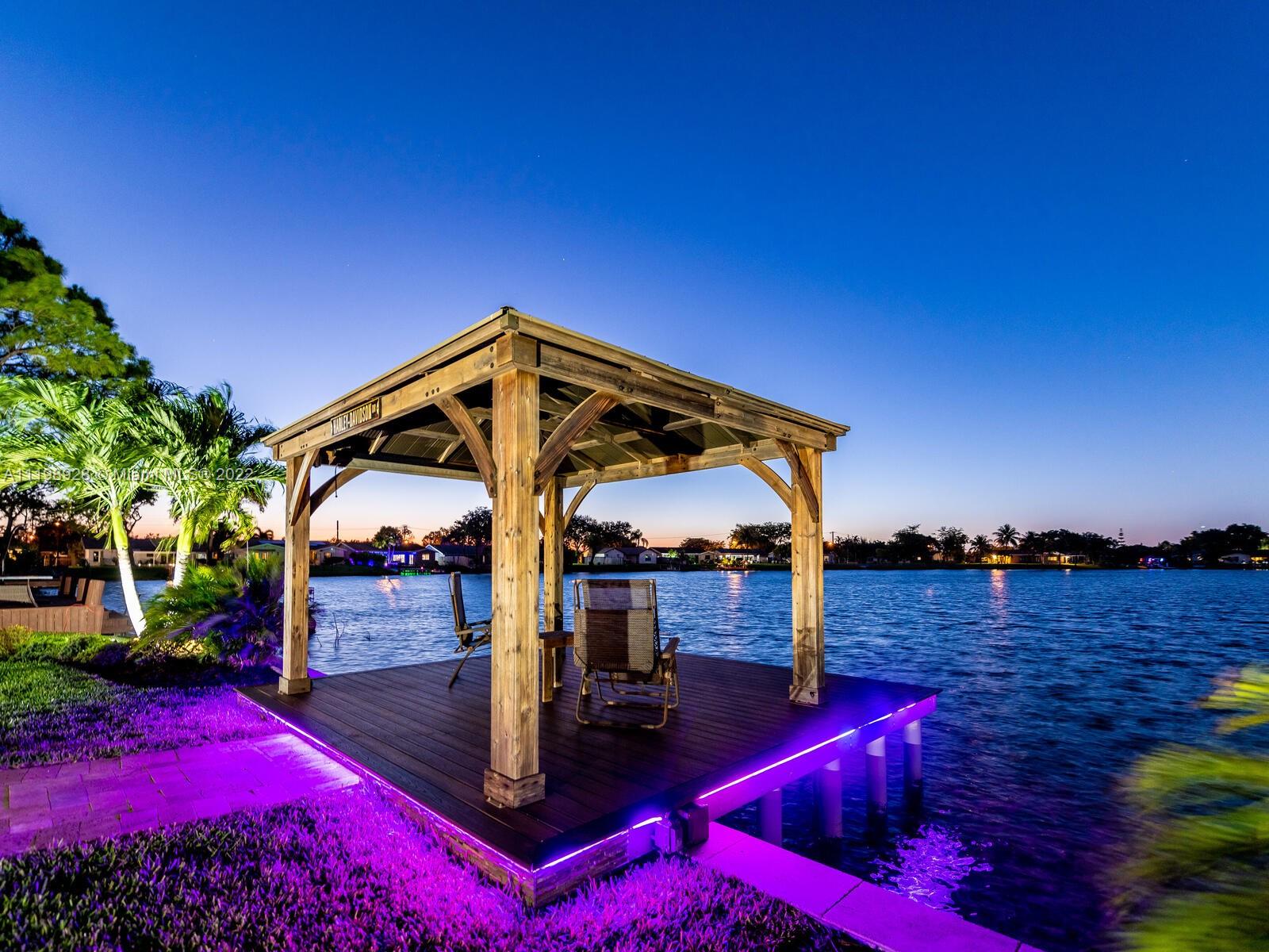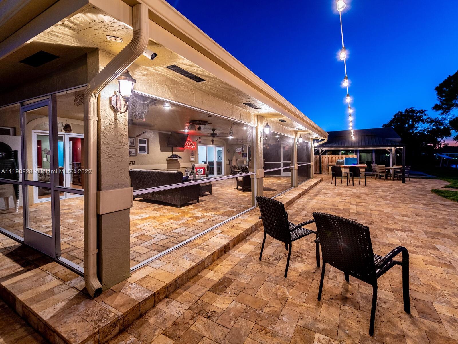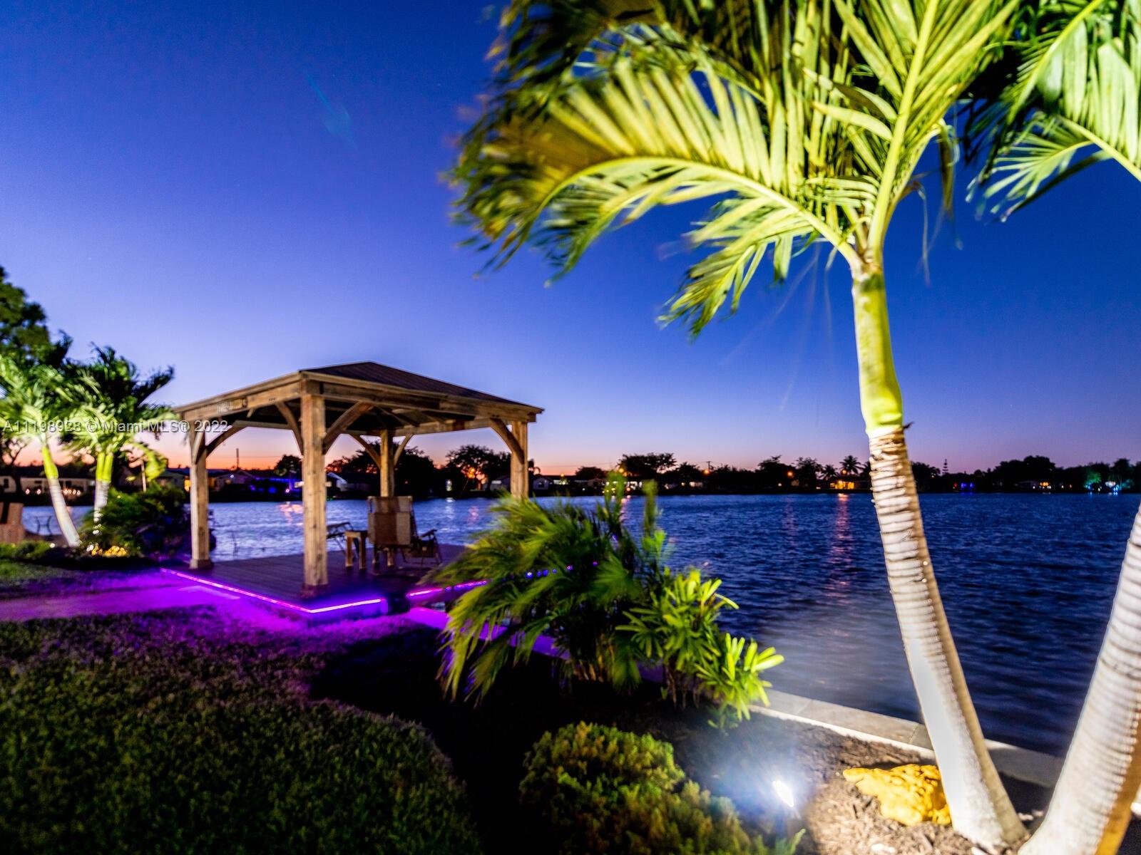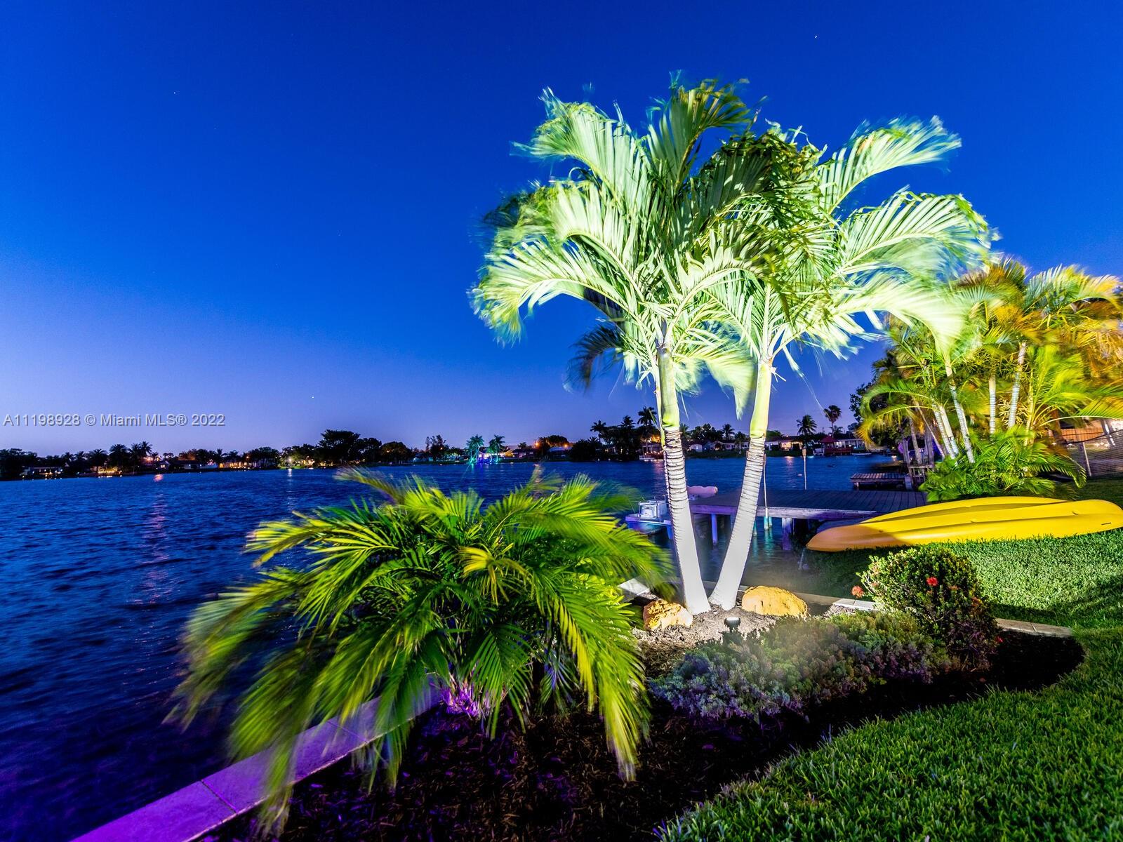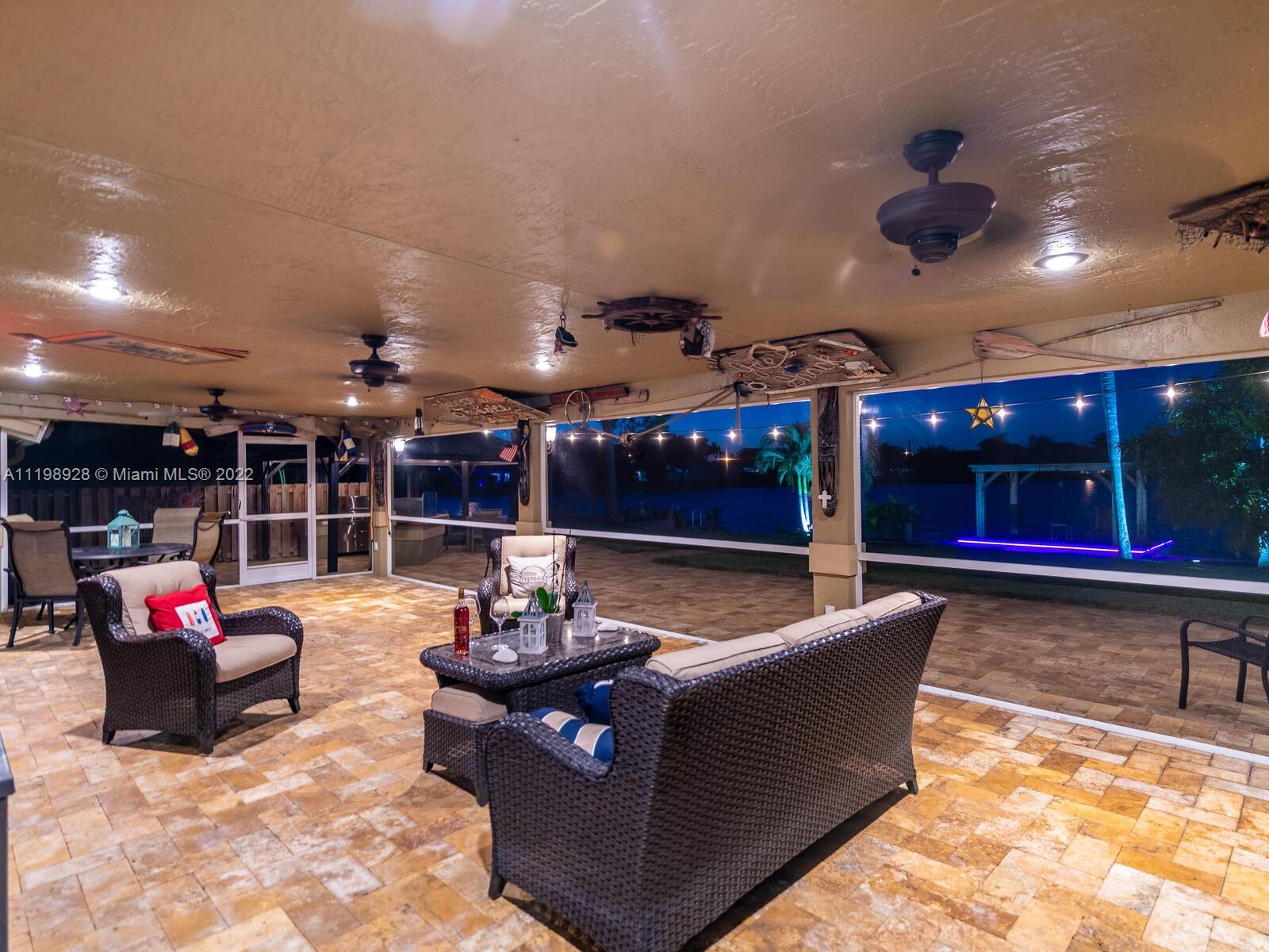 Indulgent tropical paradise from the moment you step out of the back doors leading to an enclosed & covered 20x80' travertine patio, just outside that you will find the outdoor kitchen & shed. The yard has a mature mango tree, sprawling palms, & massive lake view with 80' water frontage. Extended yard leads to a custom dock with pavilion & sunshade. The home has been immaculately maintained & extensively updated with all impact windows and doors (including the garage) & a newly upgraded kitchen, including spotless Samsung appliances & a/c unit all about a year and 1/2 new. You'll enjoy the customs closets, updated guest bath, & high end laminate flooring in most of the main area. You can see the pride in ownership reflected throughout this highly sought after lakefront home in Sunrise!!!