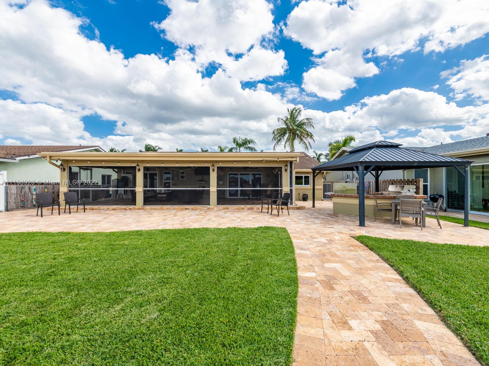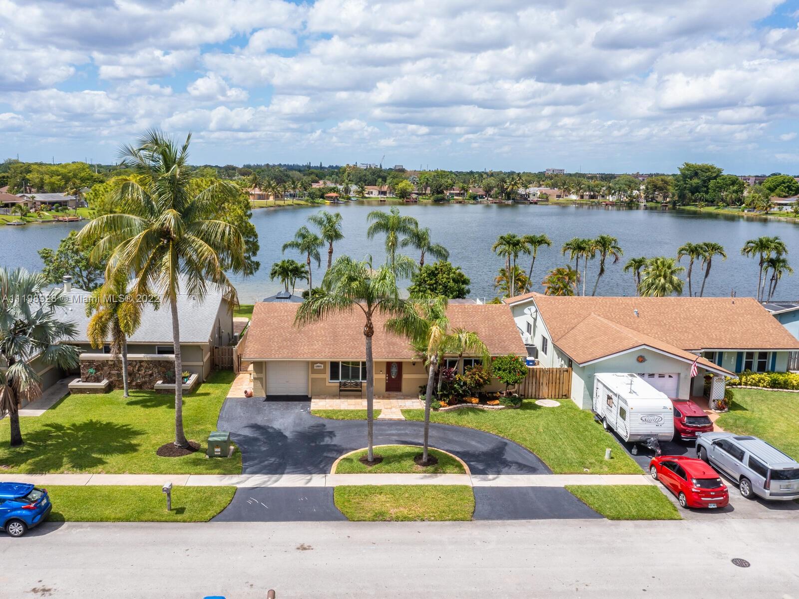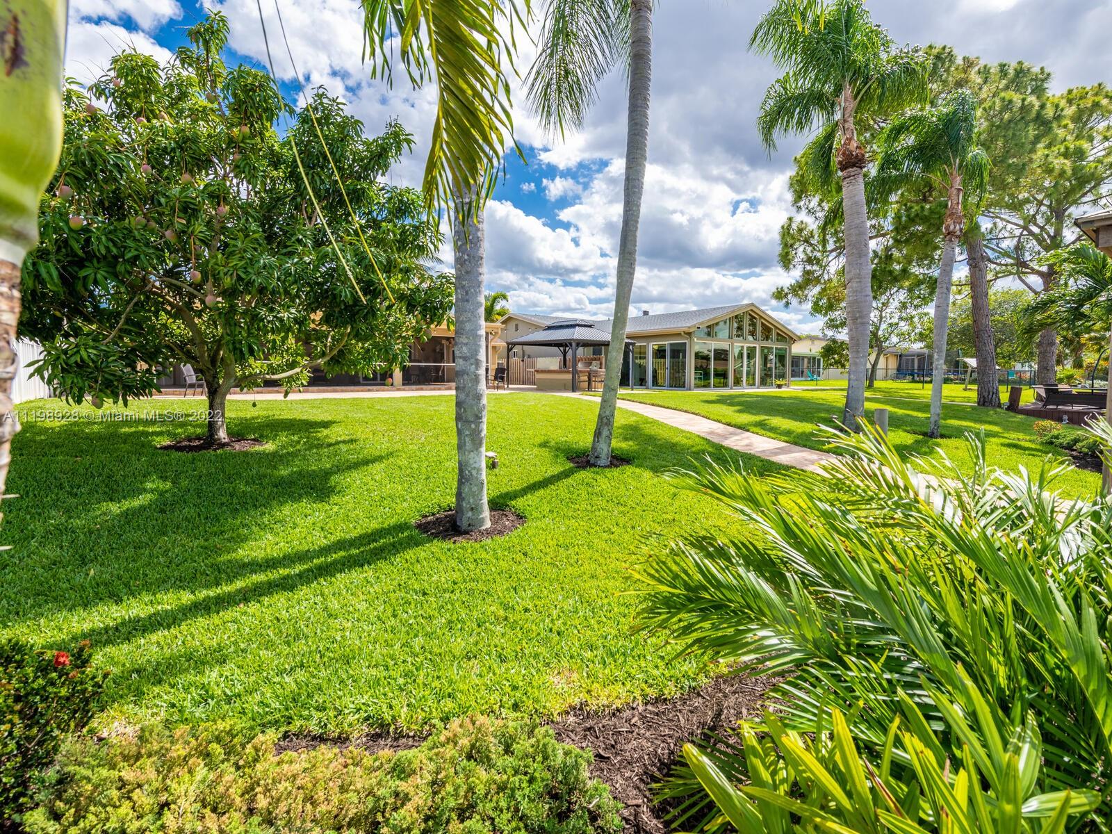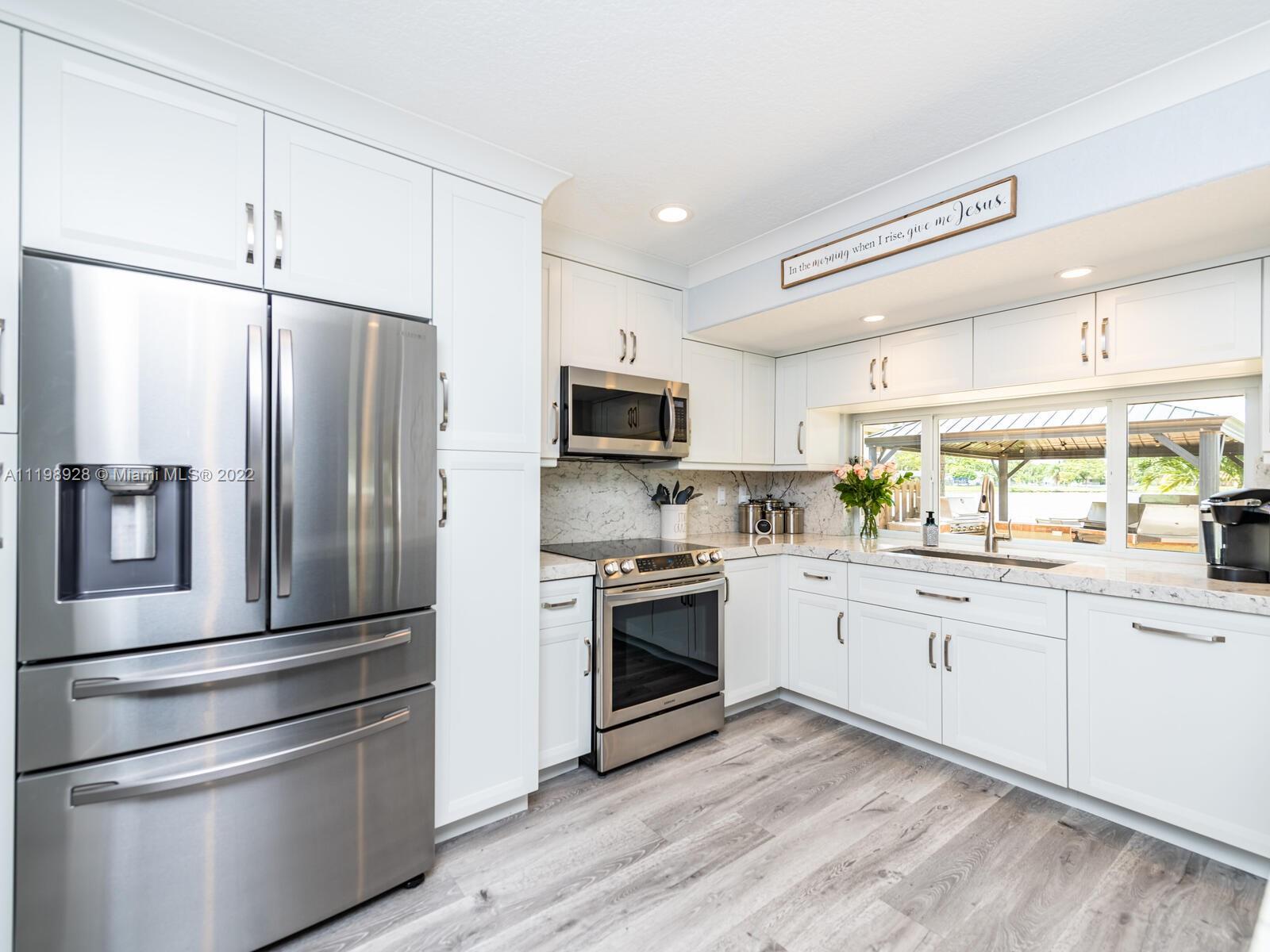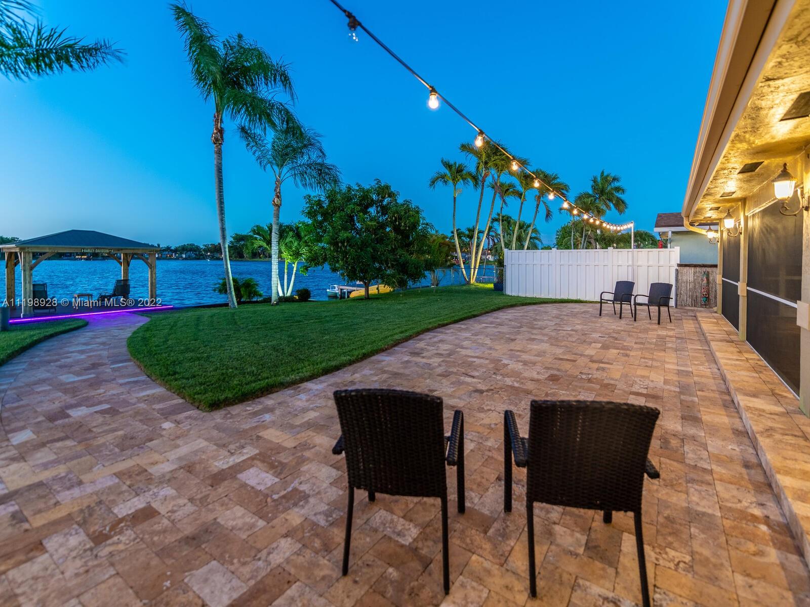 Indulgent tropical paradise from the moment you step out of the back doors leading to an enclosed & covered 20x80' travertine patio, just outside that you will find the outdoor kitchen & shed. The yard has a mature mango tree, sprawling palms, & massive lake view with 80' water frontage. Extended yard leads to a custom dock with pavilion & sunshade. The home has been immaculately maintained & extensively updated with all impact windows and doors (including the garage) & a newly upgraded kitchen, including spotless Samsung appliances & a/c unit all about a year and 1/2 new. You'll enjoy the customs closets, updated guest bath, & high end laminate flooring in most of the main area. You can see the pride in ownership reflected throughout this highly sought after lakefront home in Sunrise!!!