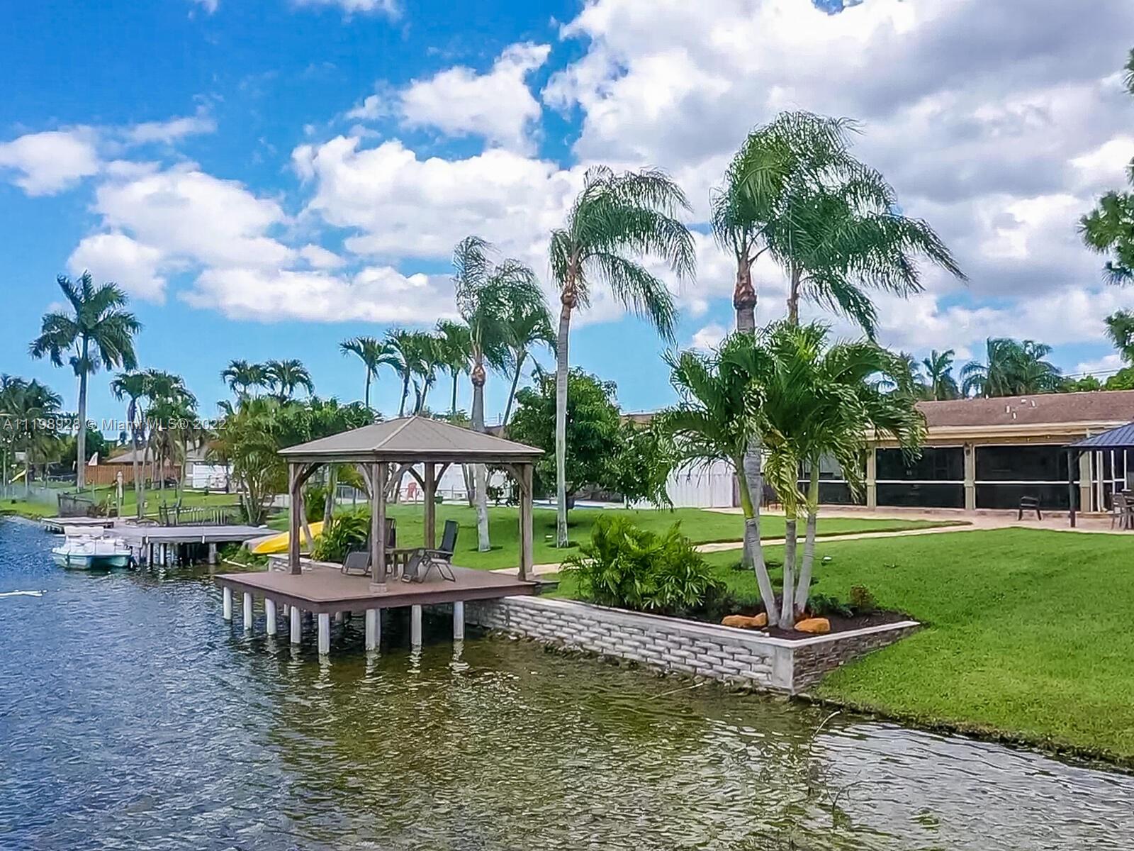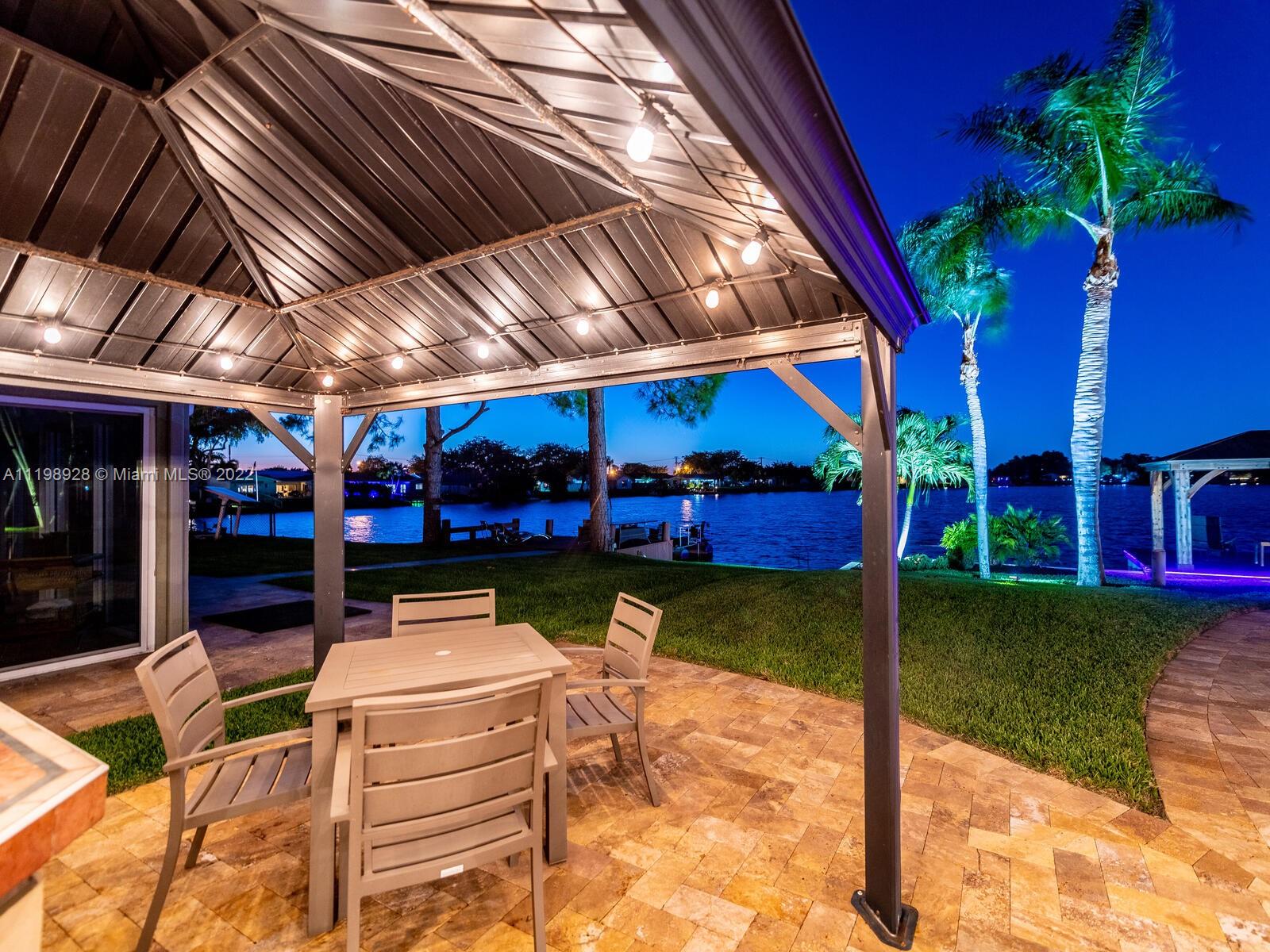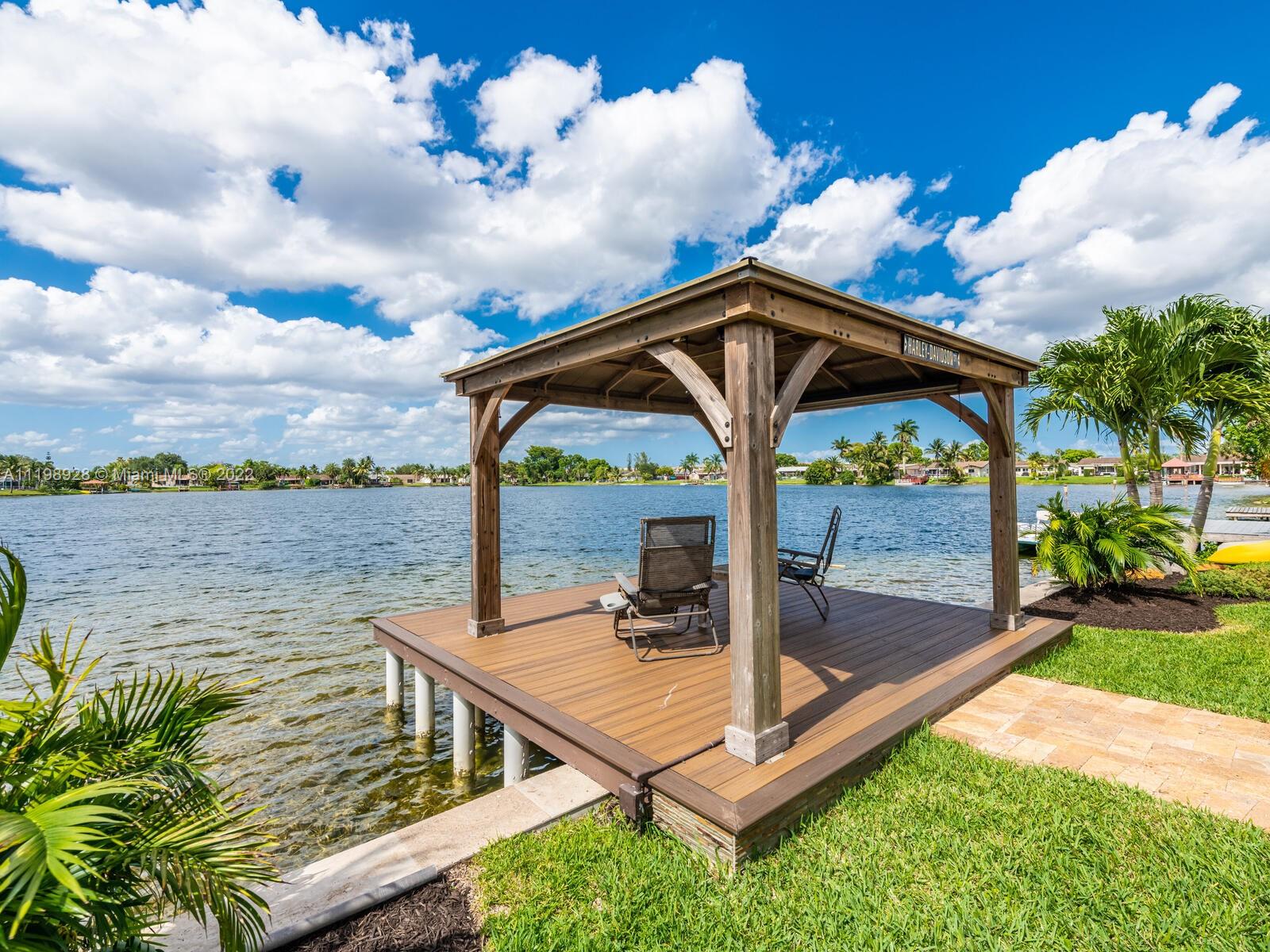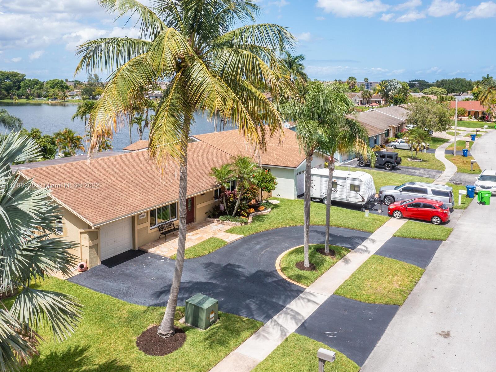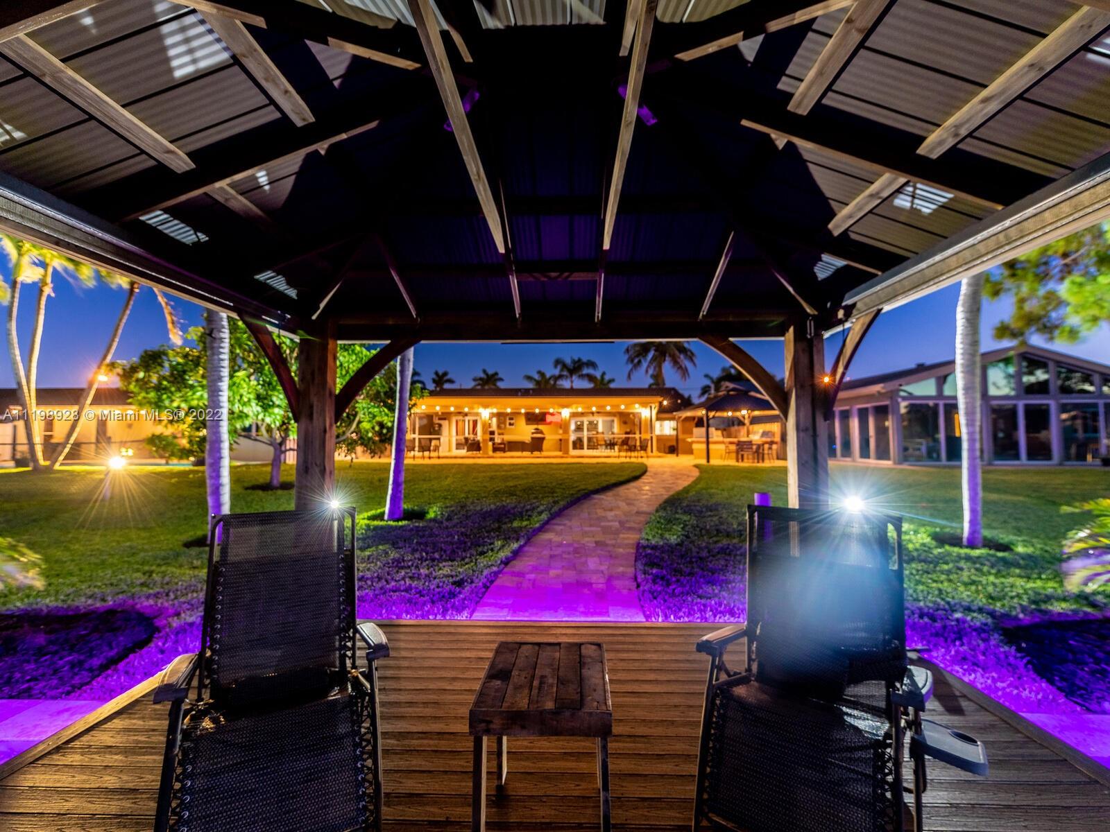 Indulgent tropical paradise from the moment you step out of the back doors leading to an enclosed & covered 20x80' travertine patio, just outside that you will find the outdoor kitchen & shed. The yard has a mature mango tree, sprawling palms, & massive lake view with 80' water frontage. Extended yard leads to a custom dock with pavilion & sunshade. The home has been immaculately maintained & extensively updated with all impact windows and doors (including the garage) & a newly upgraded kitchen, including spotless Samsung appliances & a/c unit all about a year and 1/2 new. You'll enjoy the customs closets, updated guest bath, & high end laminate flooring in most of the main area. You can see the pride in ownership reflected throughout this highly sought after lakefront home in Sunrise!!!