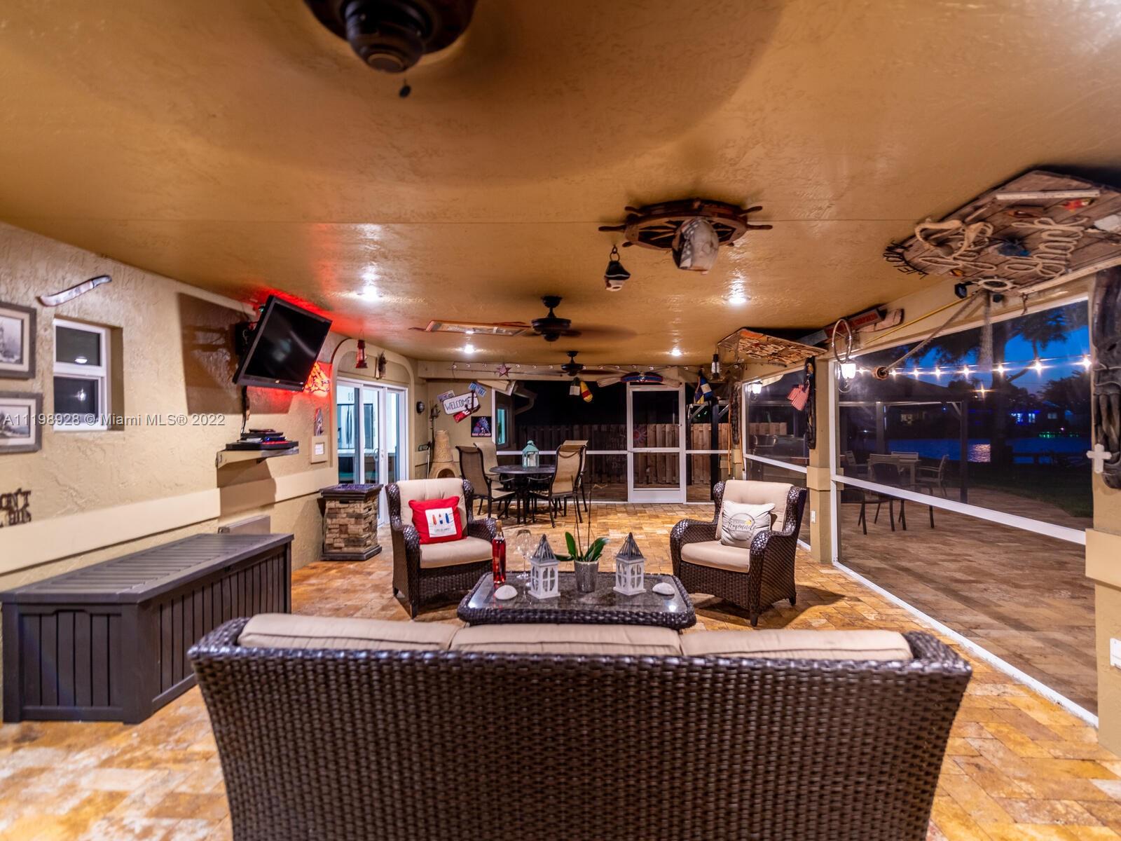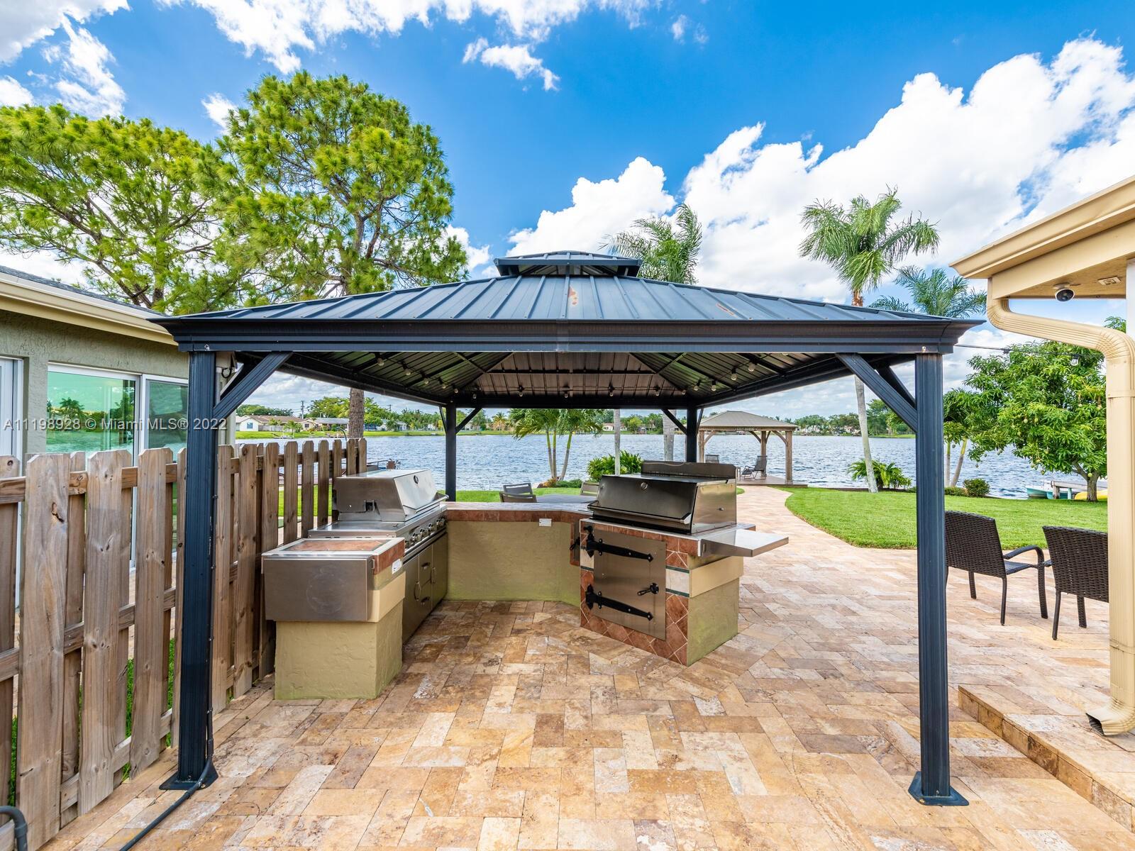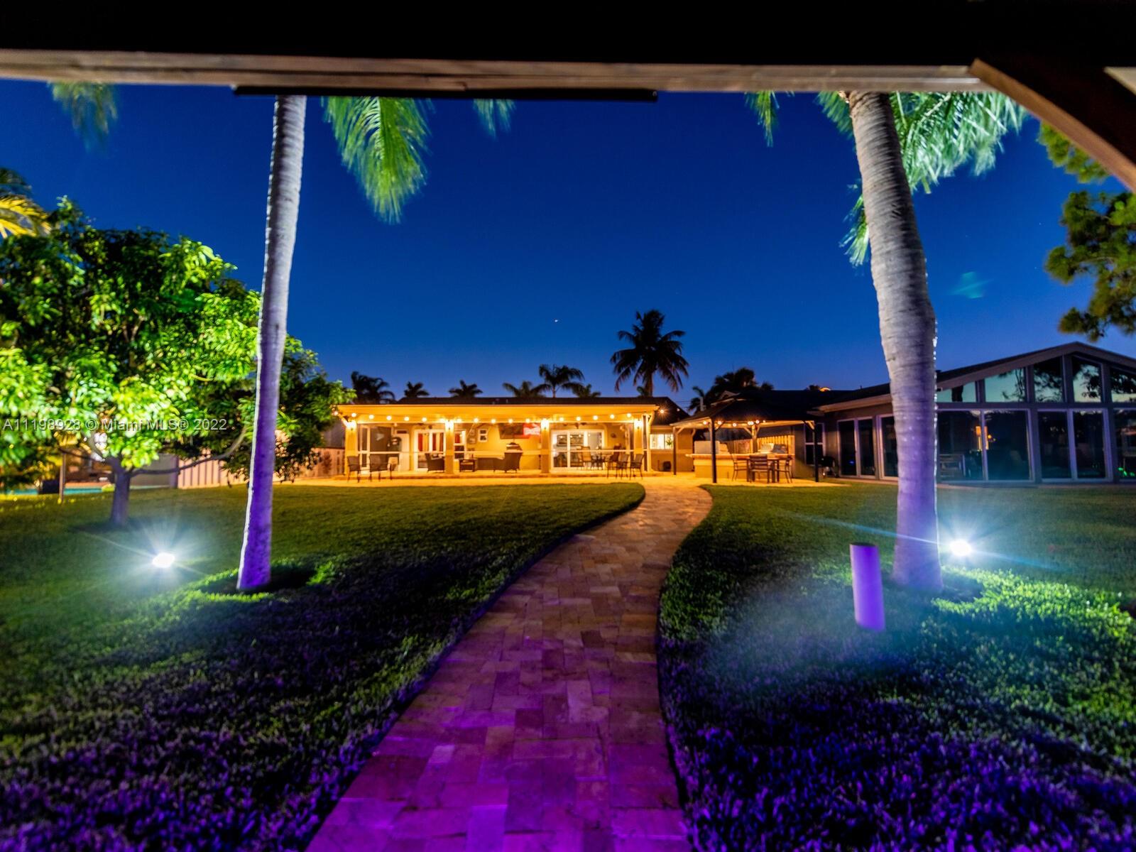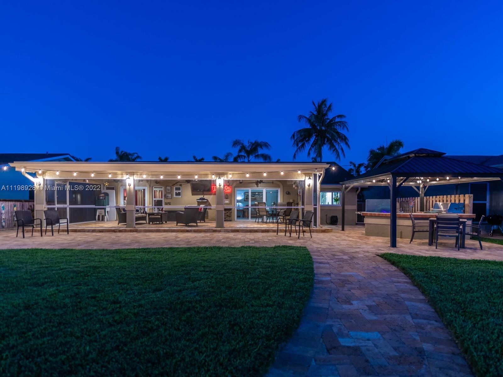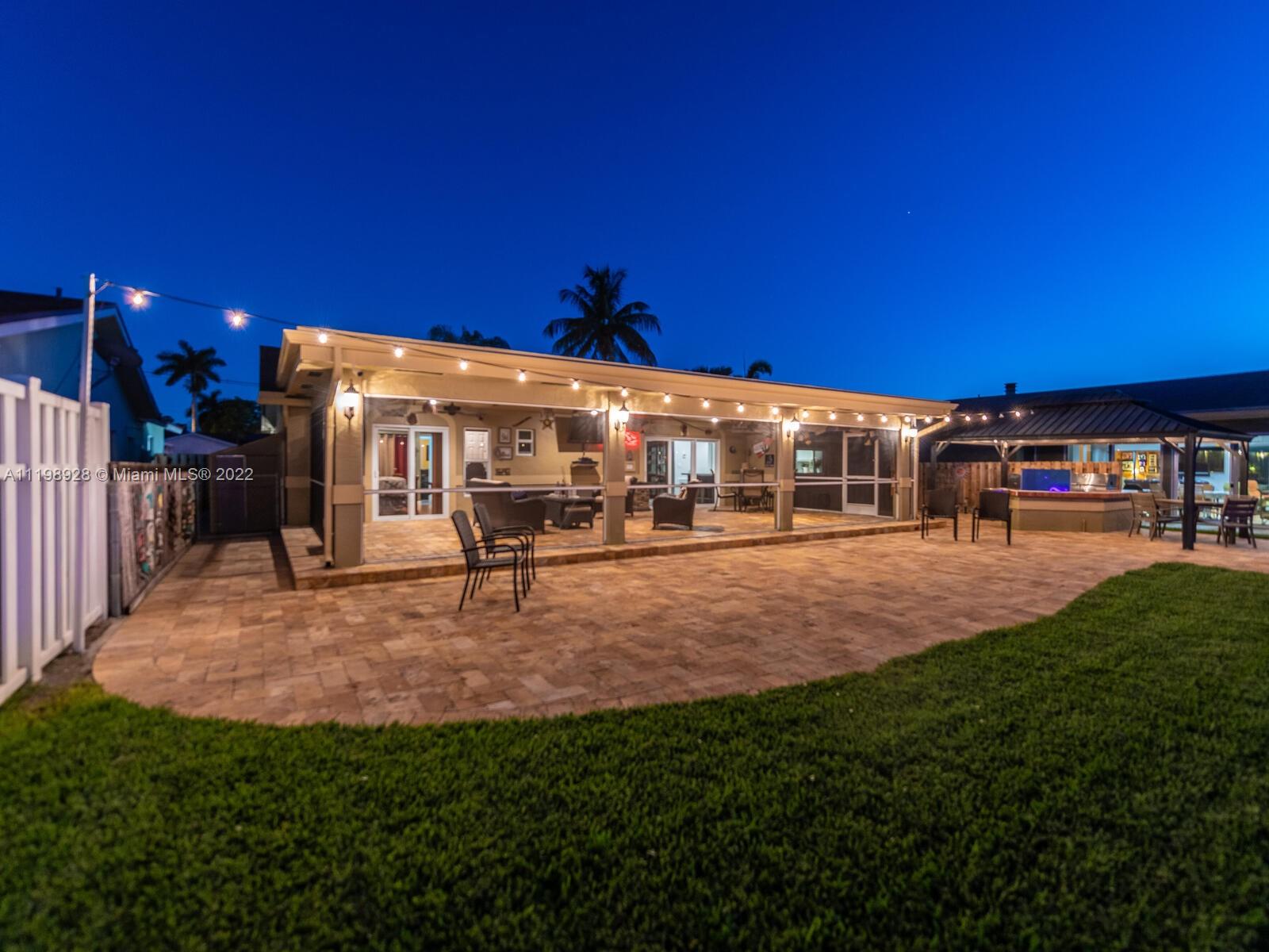 Indulgent tropical paradise from the moment you step out of the back doors leading to an enclosed & covered 20x80' travertine patio, just outside that you will find the outdoor kitchen & shed. The yard has a mature mango tree, sprawling palms, & massive lake view with 80' water frontage. Extended yard leads to a custom dock with pavilion & sunshade. The home has been immaculately maintained & extensively updated with all impact windows and doors (including the garage) & a newly upgraded kitchen, including spotless Samsung appliances & a/c unit all about a year and 1/2 new. You'll enjoy the customs closets, updated guest bath, & high end laminate flooring in most of the main area. You can see the pride in ownership reflected throughout this highly sought after lakefront home in Sunrise!!!