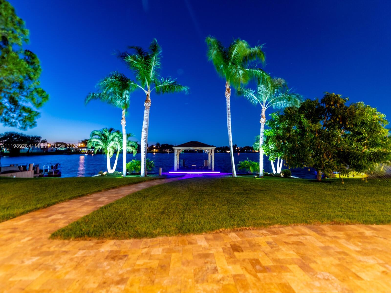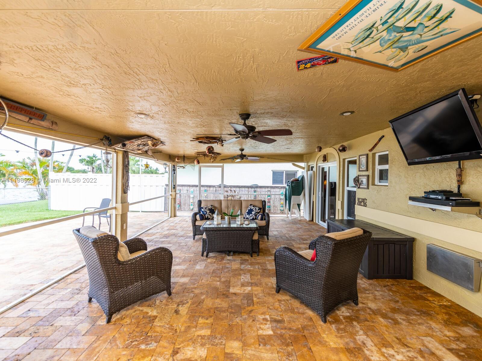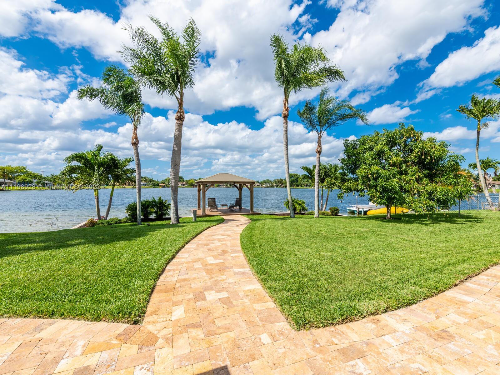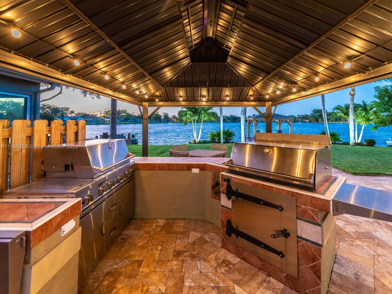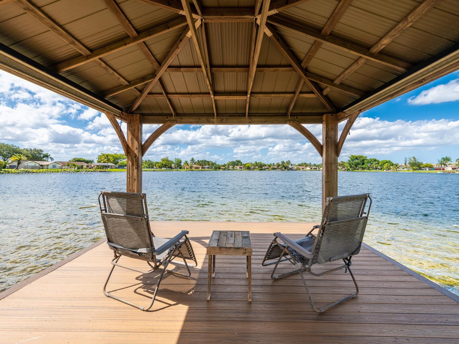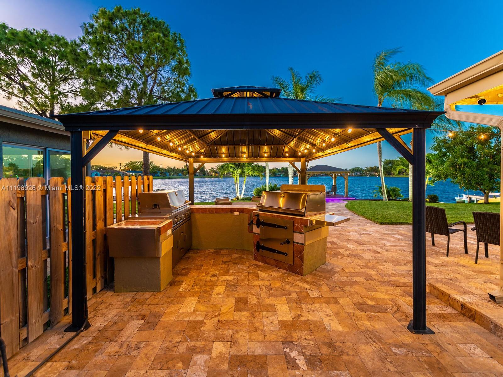 Indulgent tropical paradise from the moment you step out of the back doors leading to an enclosed & covered 20x80' travertine patio, just outside that you will find the outdoor kitchen & shed. The yard has a mature mango tree, sprawling palms, & massive lake view with 80' water frontage. Extended yard leads to a custom dock with pavilion & sunshade. The home has been immaculately maintained & extensively updated with all impact windows and doors (including the garage) & a newly upgraded kitchen, including spotless Samsung appliances & a/c unit all about a year and 1/2 new. You'll enjoy the customs closets, updated guest bath, & high end laminate flooring in most of the main area. You can see the pride in ownership reflected throughout this highly sought after lakefront home in Sunrise!!!