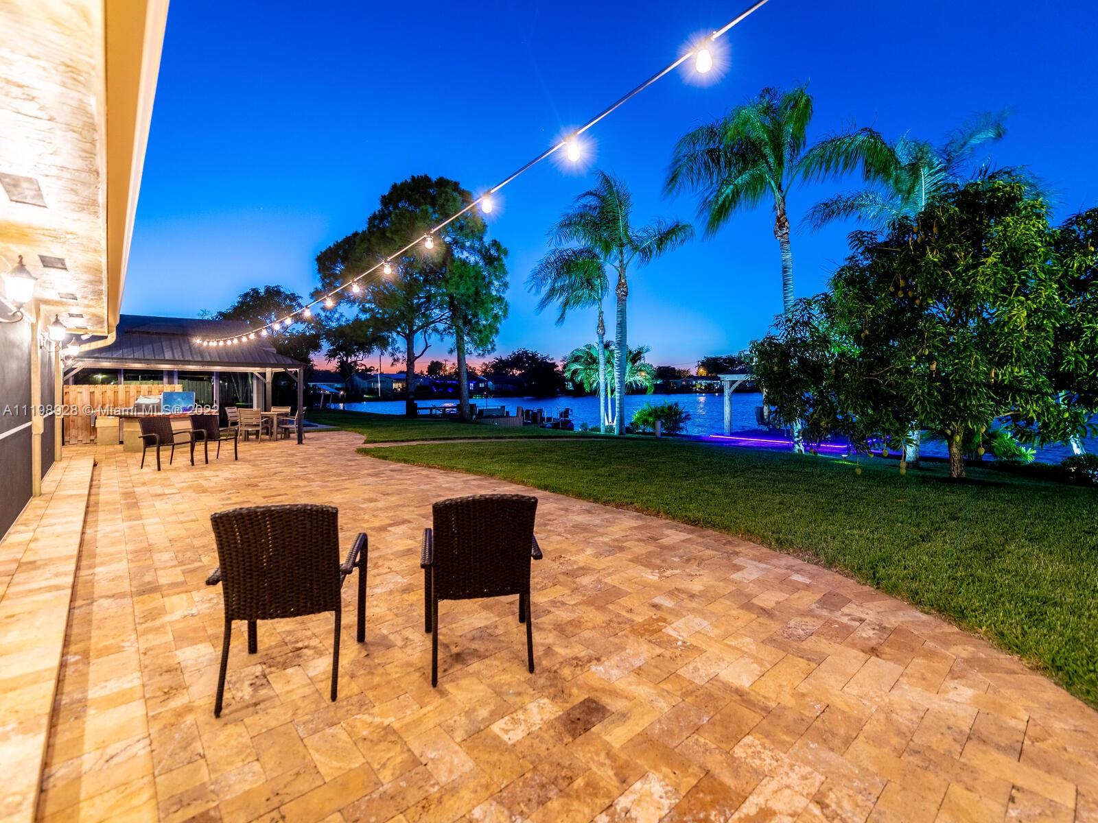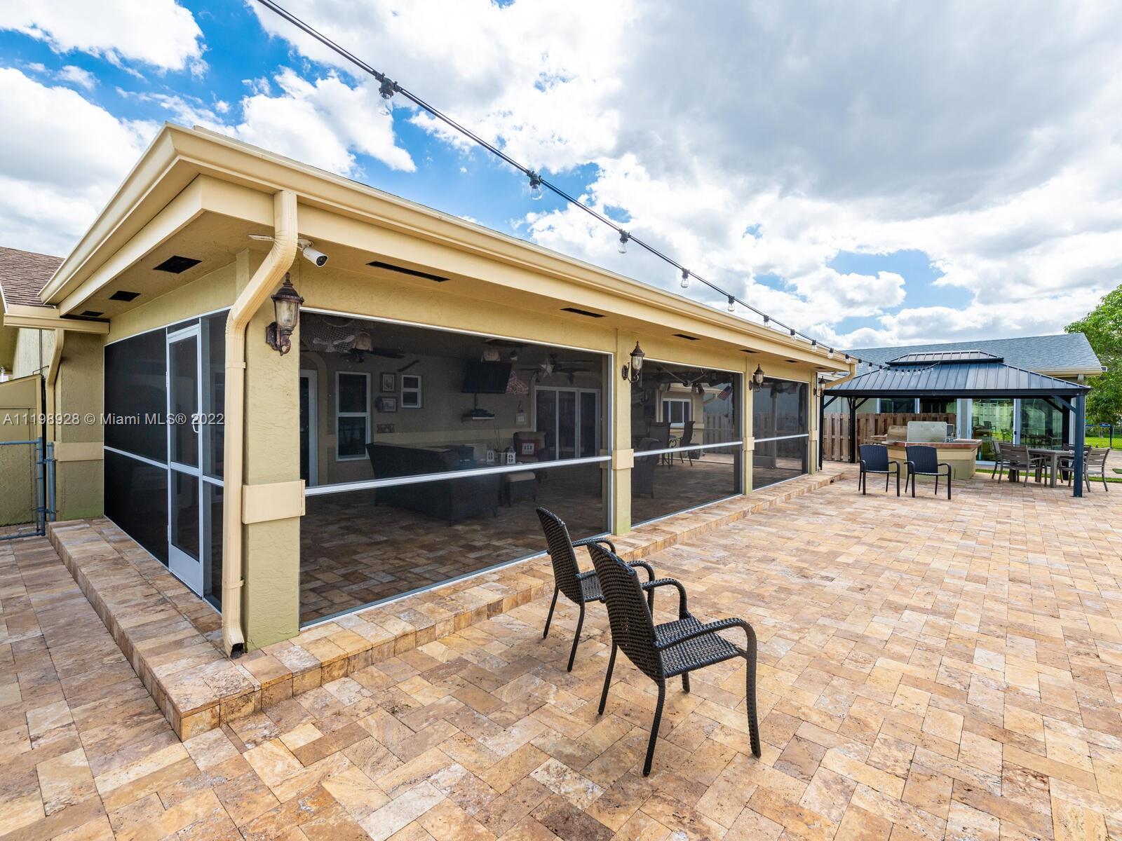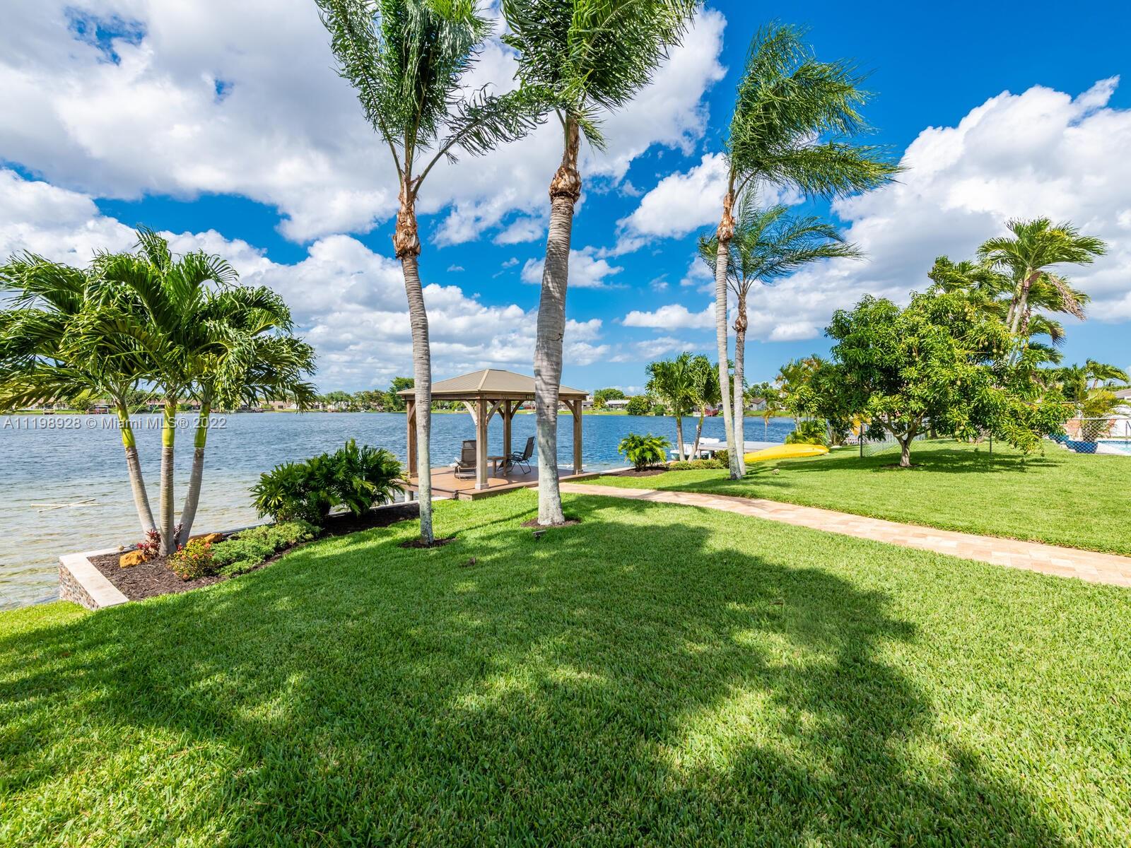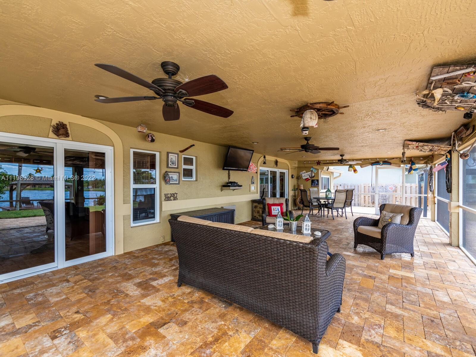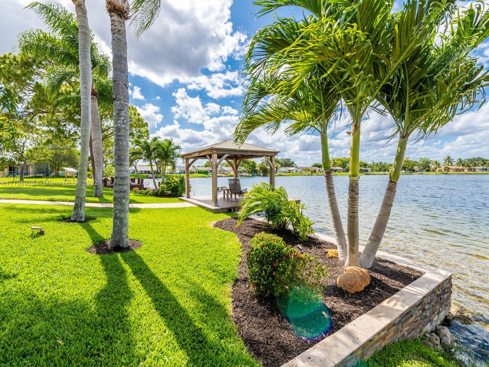 Indulgent tropical paradise from the moment you step out of the back doors leading to an enclosed & covered 20x80' travertine patio, just outside that you will find the outdoor kitchen & shed. The yard has a mature mango tree, sprawling palms, & massive lake view with 80' water frontage. Extended yard leads to a custom dock with pavilion & sunshade. The home has been immaculately maintained & extensively updated with all impact windows and doors (including the garage) & a newly upgraded kitchen, including spotless Samsung appliances & a/c unit all about a year and 1/2 new. You'll enjoy the customs closets, updated guest bath, & high end laminate flooring in most of the main area. You can see the pride in ownership reflected throughout this highly sought after lakefront home in Sunrise!!!